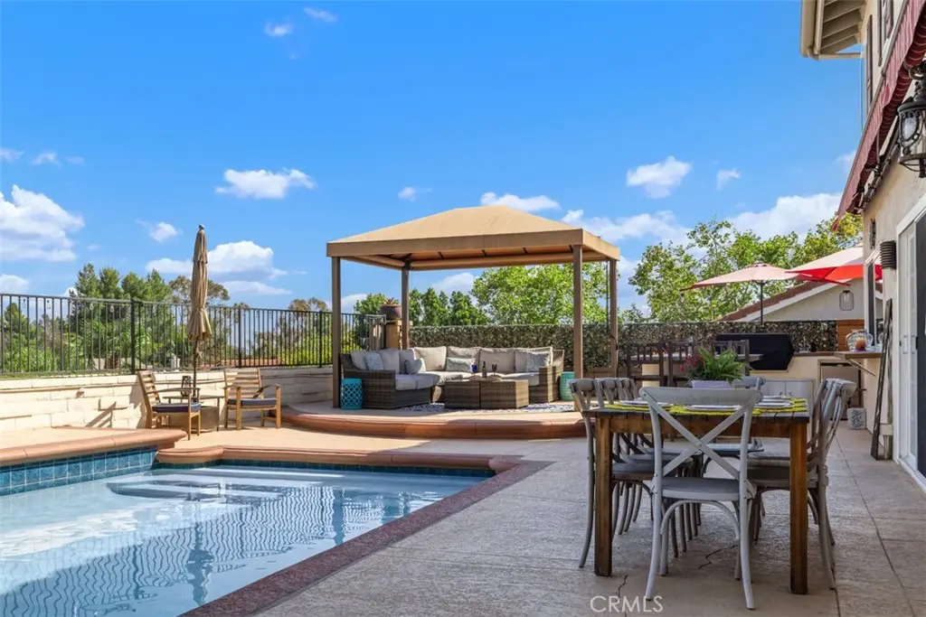 Outdoor living space with built-in BBQ, awnings, and gazebo