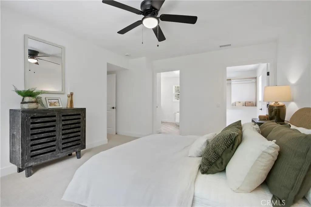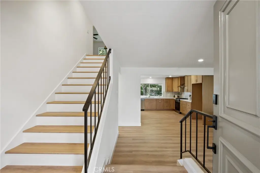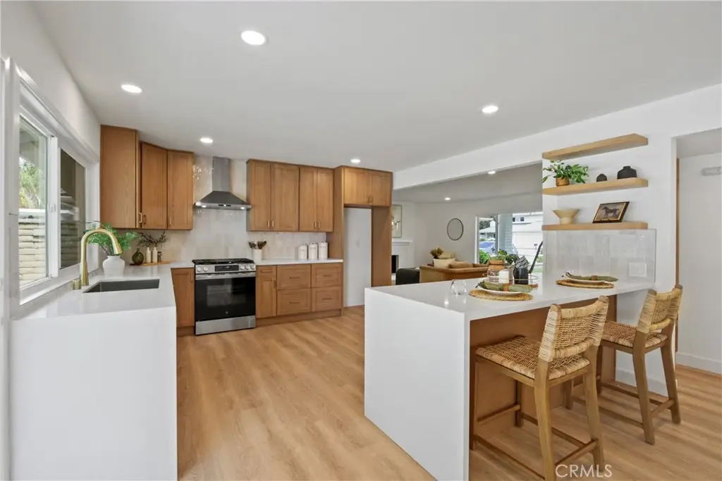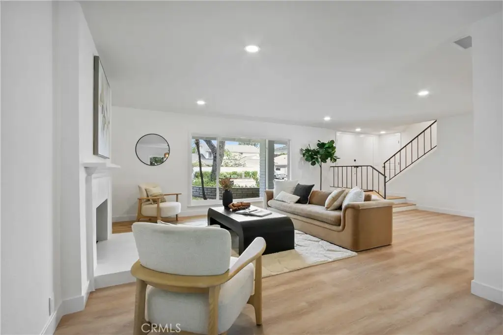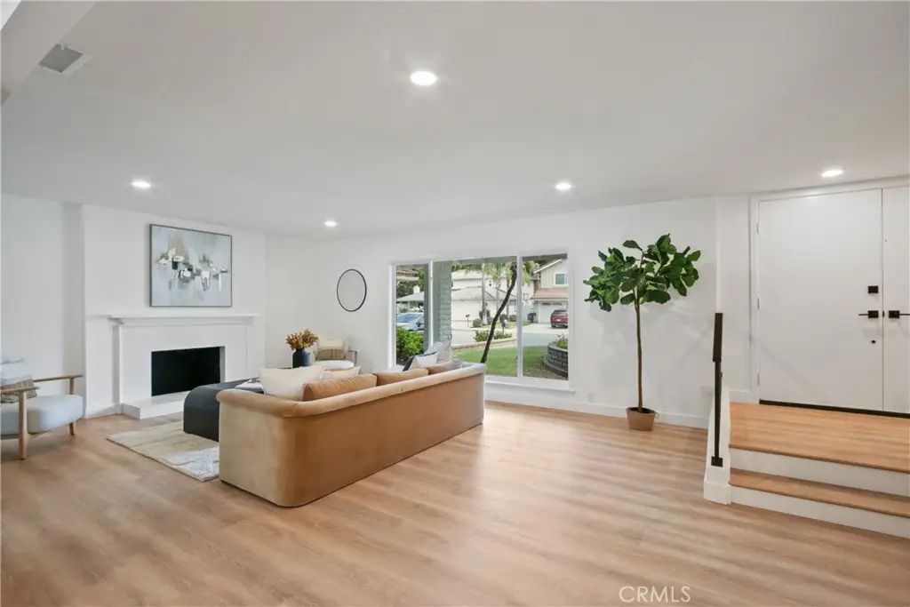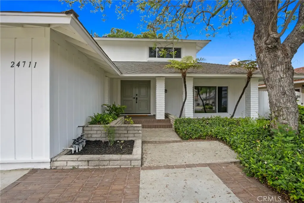 Reflecting today's preferred aesthetic through an all-embracing and exquisitely crafted remodel, this generously sized home in Mission Viejo's desirable Aegean Hills neighborhood is now a showplace for modern living and timeless design. Curb appeal is undeniable, with a classic white exterior, a covered entrance and graceful shade tree that create a welcoming scene. Double doors lead the way to a two-story interior that measures approximately 2,582 square feet. Five spacious bedrooms and three full baths cater to various lifestyles and multi-generational living, with a bedroom and full bath on the main floor. Entertain graciously in a formal living room with a large picture window and a formal dining room that opens to the backyard. Venetian plaster distinguishes the custom living room fireplace and another in the family room. Flowing freely to the family and formal rooms, the home's reimagined open-concept kitchen is enhanced with waterfall-edge quartz countertops, a peninsula bar with seating, a wine refrigerator, soft-close wood Shaker cabinetry, open shelving, full tile backsplash and new stainless steel appliances. Two large sliders open the family and kitchen area to an ample backyard with mature trees, new landscaping and fencing, and a shaded patio space. Nearly 7,370 square feet, the homesite overlooks a neighborhood park. Baths are appointed with contemporary designer tile, upgraded vanities and mirrors, satin-finished brass plumbing and lighting fixtures, and in the secondary bathroom located upstairs, gorgeous marble flooring. Custom built-ins are showcased in the second floor's open hallway, which leads to an inviting primary suite where a walk-in closet includes a custom built-in storage system, and the ensuite bath shines with gorgeous on-trend tile, marble finishes, a freestanding tub, dual-head walk-in shower and two sinks. Wide luxury vinyl plank flooring, luxe carpet in bedrooms, ceiling fans, fresh exterior paint, a new energy-saving HVAC system, an interior laundry room and an attached two-car garage with epoxy floor and rafter storage are included. Residents of Aegean Hills enjoy a vibrant and established community with no HOA dues and a location in the heart of Mission Viejo. Highly acclaimed schools, shopping centers, parks, golf courses, freeways and tollways are close to home. This exceptional residence presents a rare opportunity to enjoy turnkey luxury and timeless style in one of Mission Viejo's most sought-after neighborhoods!