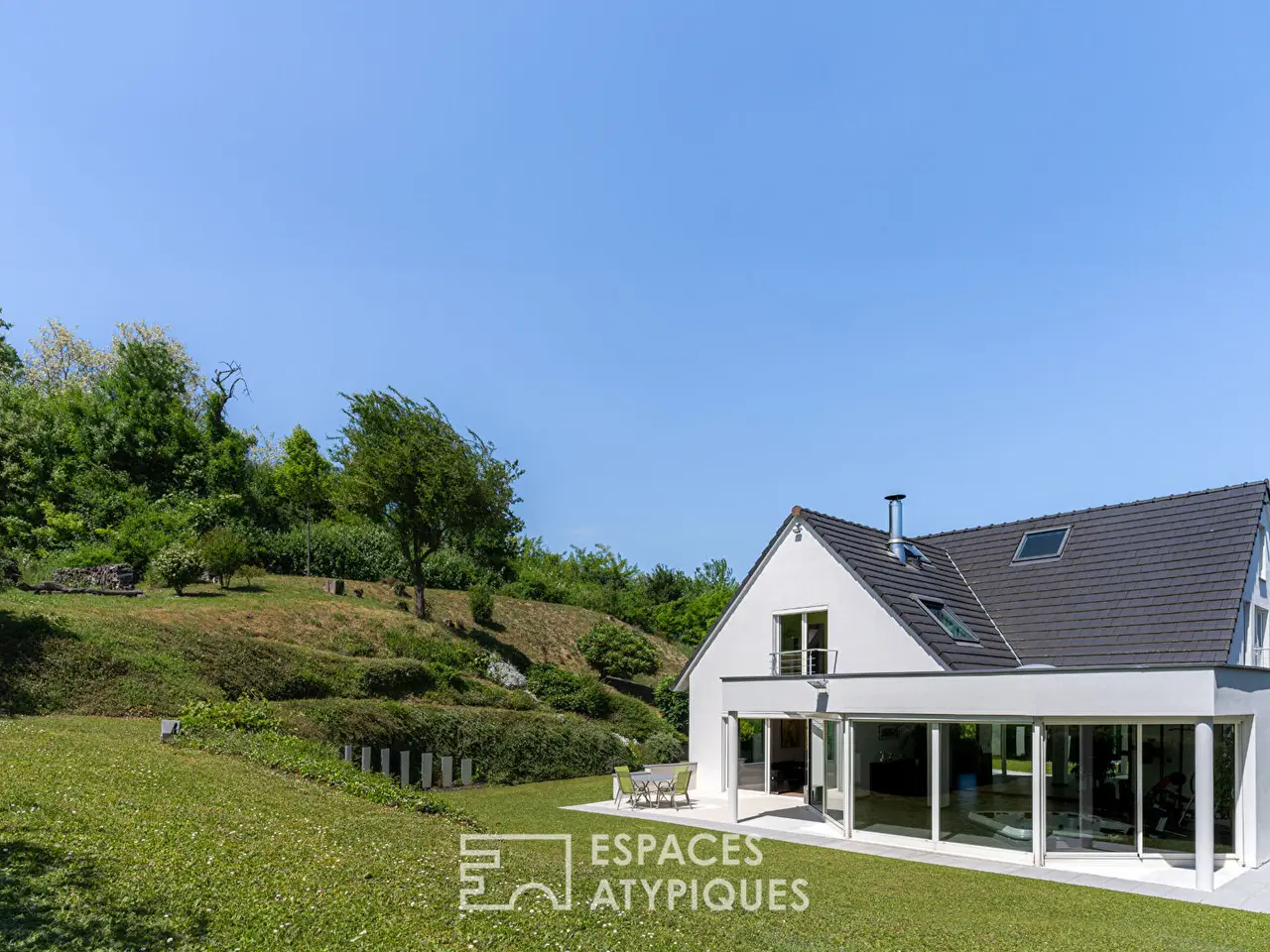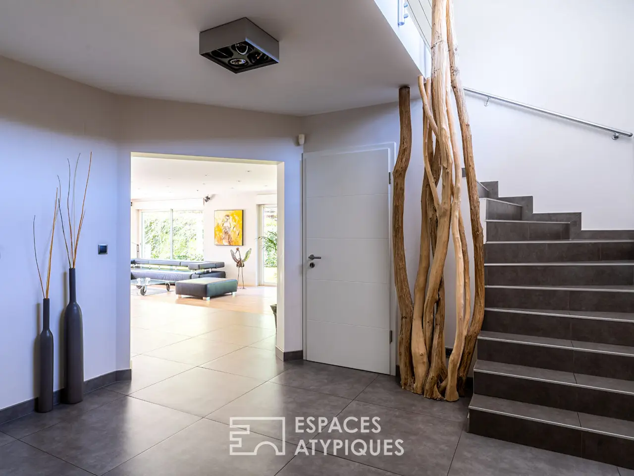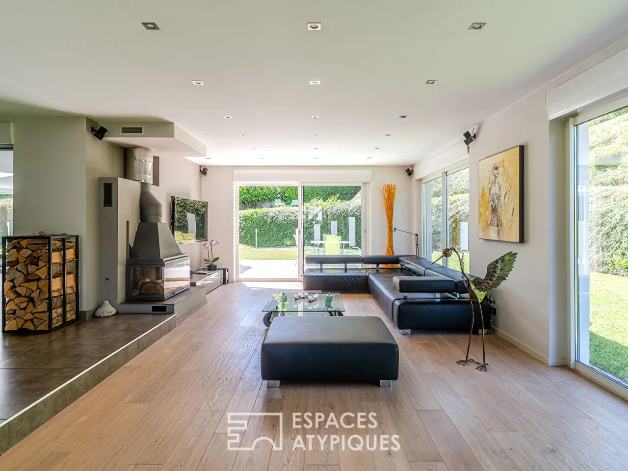 Just 15 minutes from Strasbourg, nestled in the sought-after hills of Mittelhausbergen, this contemporary house boasts a floor area of 365 sqm, including 300 sqm of living space, on a plot of 9.87 ares. Located on the edge of the forest and sheltered from view, it offers unobstructed views as far as Strasbourg Cathedral. Designed to meet an elegant and comfortable lifestyle, it stands out for its quality features, generous volumes, and omnipresent brightness.The entrance opens onto a vast living room of over 90 sqm bathed in natural light thanks to its large bay windows. This dual-aspect living room, with its solid oak parquet flooring and fireplace, is extended by a fully equipped open kitchen. Modular thanks to a movable partition, this convivial space adapts to everyday desires. A wellness area, housed in a veranda bathed in light by a skylight, houses a spa and a fitness area with direct views of the garden.Upstairs, an open hallway leads to four bedrooms, including the master bedroom and its bathroom with a view of the Cathedral, and a bedroom with an adjoining shower room and a view of the garden. The attic has been converted to accommodate an office area, a relaxation area, or even a games room. In addition, the basement, on the courtyard level, houses a large double garage, a laundry room, a wine cellar, as well as a bedroom with a shower room and a window. Outside, several terraces allow you to fully enjoy a green environment without overlooking.The carefully landscaped grounds are in harmony with the surrounding nature and are an ideal extension of the interior spaces. The elevated location gives the garden a peaceful and confidential atmosphere, while offering unique panoramas of the Black Forest and Strasbourg. This contemporary house combines modern comfort, generous volumes and high-quality services in a rare and preserved environment. Its location, its interior and exterior fittings and its openness to nature make it a unique property, designed for a clientele looking for a privileged place to live at the gates of Strasbourg.Schools 5 min walkBus 5 min walkREF. 1541Additional information* 7 rooms* 5 bedrooms* 3 bathrooms* 2 floors in the building* Outdoor space : 987 SQM* Property tax : 3 201 €Energy Performance CertificatePrimary energy consumptionc : 127 kWh/m2.yearHigh performance housing*A*B*127kWh/m2.year20*kg CO2/m2.yearC*D*E*F*GExtremely poor housing performance* Of which greenhouse gas emissionsc : 20 kg CO2/m2.yearLow CO2 emissions*A*B*20kg CO2/m2.yearC*D*E*F*GVery high CO2 emissionsEstimated average amount of annual energy expenditure for standard use, established from energy prices for the year 2021 : between 2090 € and 2870 €Agency feesThe fees include VAT and are payable by the vendorMediatorMediation Franchise-Consommateurswww.mediation-franchise.com29 Boulevard de Courcelles 75008 ParisInformation on the risks to which this property is exposed is available on the Geohazards website : www.georisques.gouv.fr