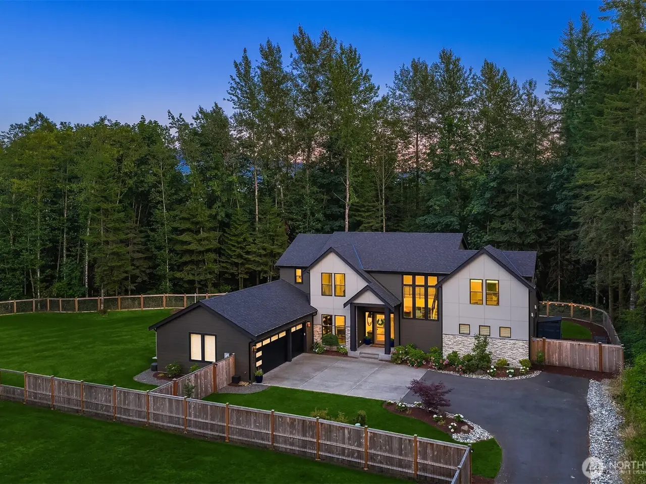 Tucked away in a private enclave, this stunning retreat sits on 1.25 acres - offering room to dream. Built just two years ago with high-end finishes, gorgeous hardwoods, and top-tier appliances, every detail is stunning. Thoughtful floorplan features an impressive great room with a floor to ceiling fireplace, spacious main-floor primary suite with a 5-piece spa bath and a junior suite, plus three additional bedrooms and a large bonus room upstairs. Soaring ceilings, designer lighting, and a gourmet kitchen create an open, airy vibe. Great room flows effortlessly out to the covered patio with fireplace - perfect for year-round enjoyment. With total privacy, level fenced yard, and space to relax, this home offers the best of Northwest living.