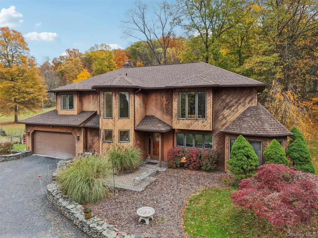 Tucked away on 8.5 acres of gently rolling land, this contemporary home is a sanctuary for those who crave space, quiet and a connection to nature. Clean lines and natural textures define the design blending seamlessly into the surrounding landscape. As you make your way up the front walkway, you are first greeted by the koi pond. Inside, the open floor plan invites light from every direction. Step through the front entry and descend into the welcoming sunken living room with its brick woodburning fireplace and designed for gathering or relaxing. A formal dining room offers a vaulted ceiling and sliders which open to the full-length patio with fire pit. The open kitchen is outfitted with stainless appliances, a generous island and breakfast/dining area which makes cooking and entertaining effortless. The stairway to the second level is framed by floor-to-ceiling architectural windows that flood the space with natural light and showcase views of the surrounding landscape.From the upstairs hallway balcony, enjoy sweeping vistas of the front entrance and dining room below, highlighting the home's open-concept design and creating a seamless flow between levels. Enter the primary suite through double French doors to a peaceful haven with spa-like bath & perfect for relaxing at the end of the day. Completing the 2nd level are three additional bedrooms & full bath. With its thoughtful layout and peaceful setting, this property offers an ideal blend of modern comfort and rural simplicity. Whether you're working remotely, hosting friends, or simply unwinding in your own slice of nature, this home provides the perfect balance of design and tranquility. A contemporary retreat that feels a world away, yet only minutes from all major roadways and conveniences. Are you ready to live in perfect harmony with nature and make this rare private estate yours!