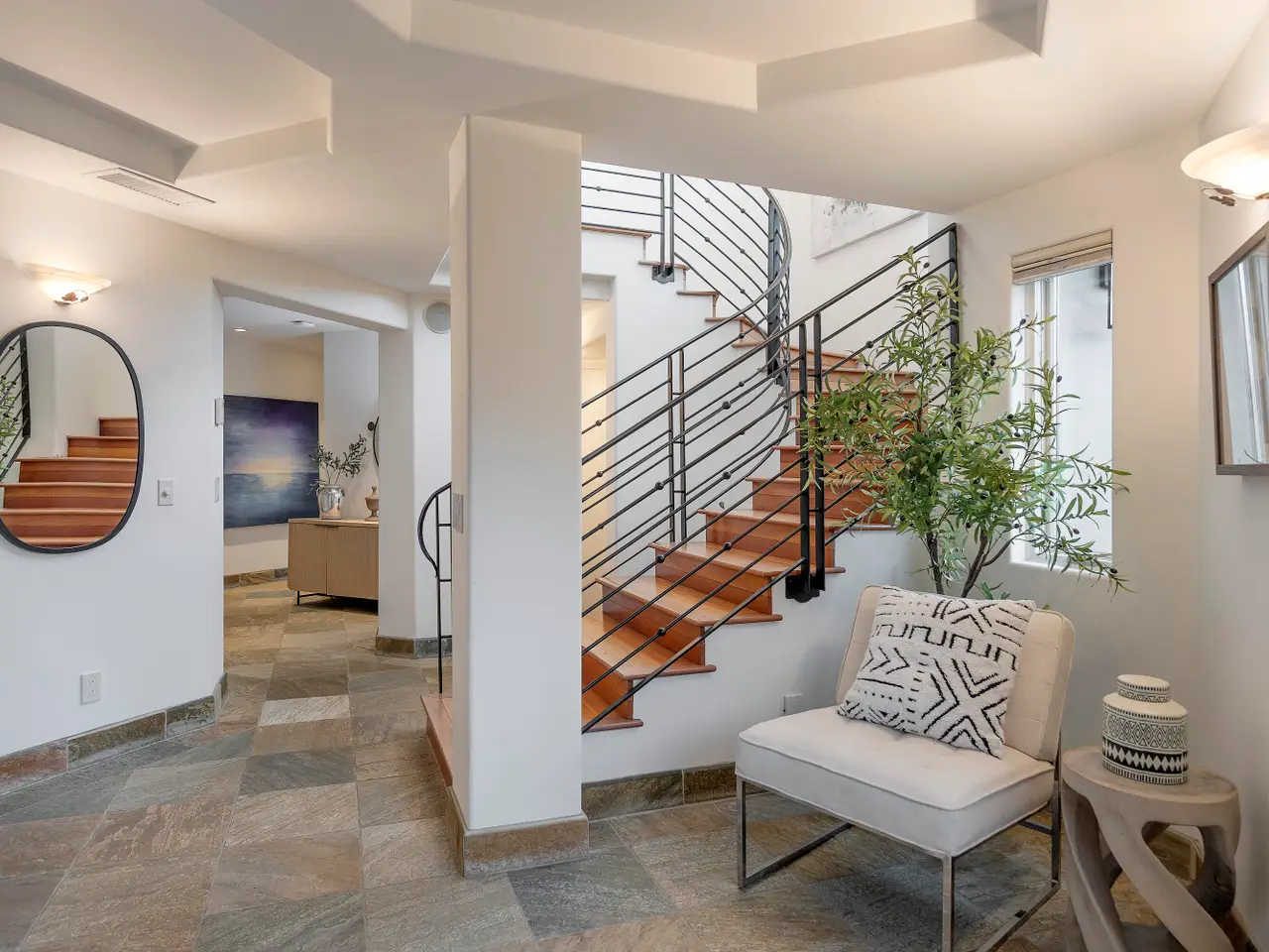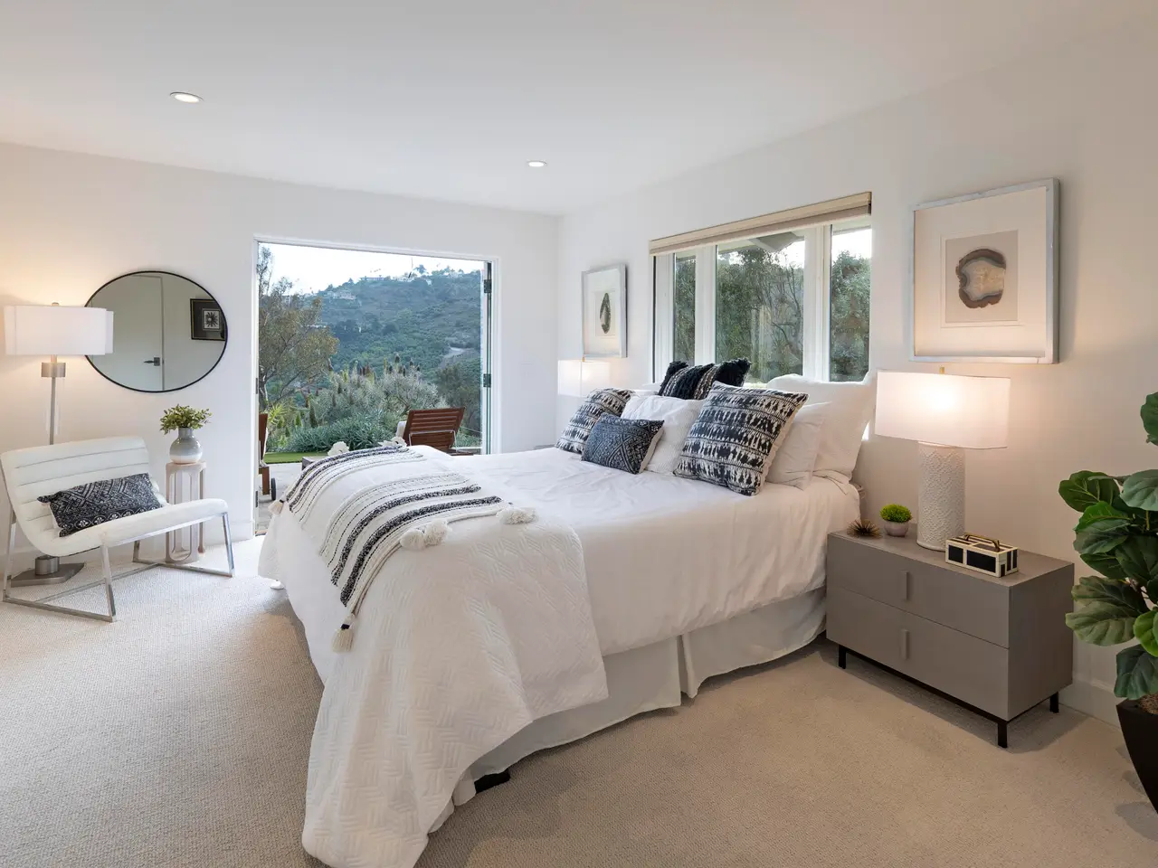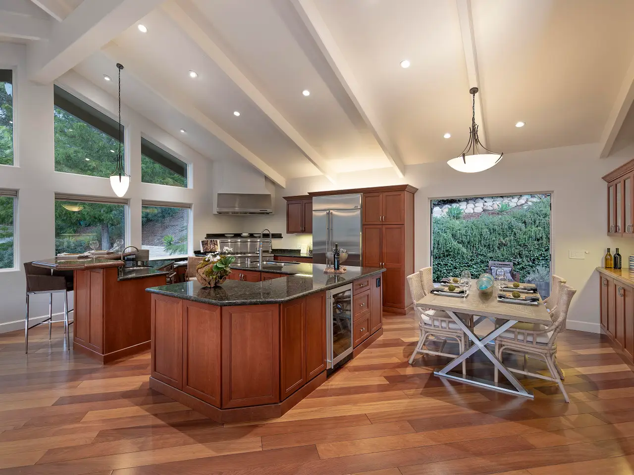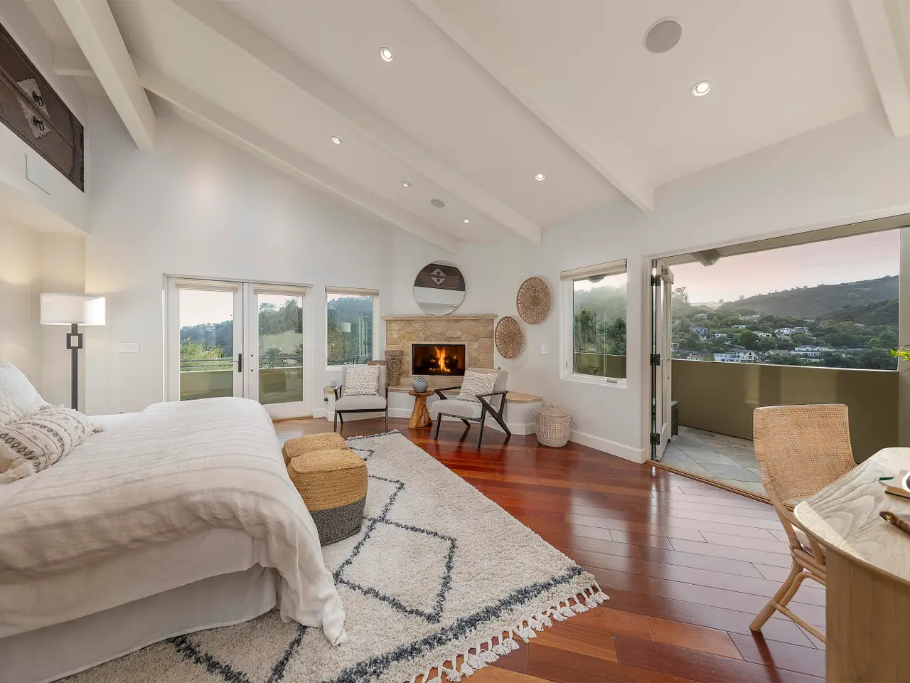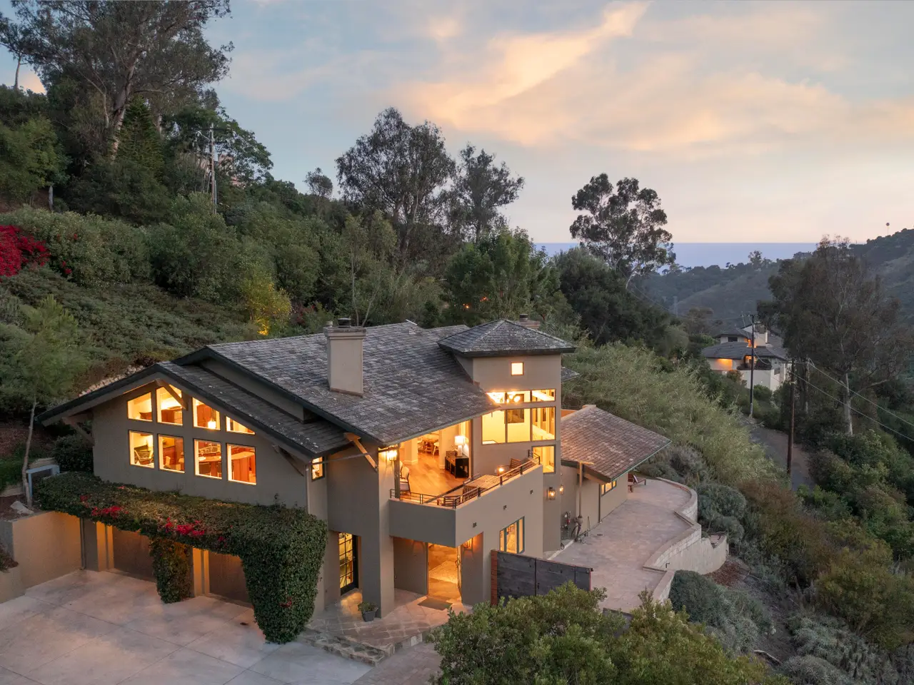 Situated above Sycamore Canyon on Montecito's western edge, 62 Canon View is a stunning contemporary retreat that offers privacy, quality, and breathtaking mountain and canyon views. Located in the Eucalyptus Knolls community and within the award-winning Cold Springs School District, this gorgeous four bedroom, three- and one-half bath home on a private one-acre parcel provides a serene sanctuary just minutes from both Coast Village Road and Downtown Santa Barbara. Quality construction is evident from the moment one passes through the large custom copper front door. Views abound from nearly every room, deck, and patio. The open floor plan seamlessly integrates the main living areas, including the kitchen, dining, and living rooms, all of which feature soaring ceilings and hardwood floors. A cozy fireplace anchors the living room, and a dramatic six-panel bi-fold glass wall perfectly frames the stunning view of Cathedral Peak. The luxurious primary suite is a private retreat, complete with its own view deck, fireplace, vaulted ceilings, multiple walk-in closets, a spa-like jetted tub, and a glass enclosed shower. The additional three bedrooms feature French doors which provide access to the yard and allow in copious amounts of natural light. Designed with both relaxation and entertainment in mind, the outdoor spaces have been meticulously upgraded with beautifully hardscaped walls, stairways, and rock features. Fruit trees, custom low-voltage landscape lighting and irrigation enhance the lush landscaping, while paver walkways and turf create inviting yet drought tolerant outdoor living areas. Modern amenities elevate the home's comfort and efficiency, including multi-zone heating and air conditioning, high-speed Ethernet cabling, and WiFi-enabled LED lighting with dimmer switches. Remote-controlled Hunter Douglas shades provide effortless privacy, and built-in infrared outdoor heaters on the upstairs terrace allow for year-round enjoyment. A top-of-the-line whole-house reverse osmosis system ensures premium water quality at every fixture and appliance, while Nest thermostats, smart smoke and carbon monoxide alarms, and Arlo high-definition security cameras offer state-of-the-art convenience and peace of mind. Additional upgrades include an enhanced built-in sound system, high-flow HVAC vents for efficient heating and cooling, an EV charger, and smooth, WiFi-enabled garage door openers. The oversized two-car garage offers ample storage and a workshop area, while the flexible floor plan presents a convenient dual-living option. Combining contemporary elegance, cutting-edge features, and an unbeatable Montecito location, 62 Canon View is a rare opportunity to experience the best of canyon living.