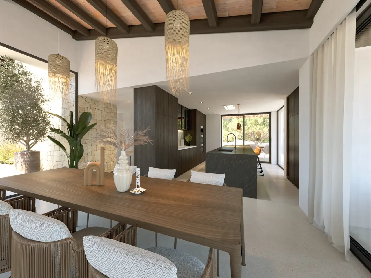 This stunning new-build villa is located in the sought-after Montgó area of Jávea, Alicante, and stands out for its contemporary design and excellent features. The property offers spaciousness and brightness in every room, as well as panoramic mountain views and proximity to the sea, golf courses, and the town center. The home features four bedrooms, each with an en-suite bathroom, ensuring privacy and comfort for every family member or guest. Additionally, there is a guest toilet. Built-in wardrobes and a walk-in closet provide functional and elegant storage solutions. The main living room benefits from a fireplace, creating a cozy atmosphere, while the kitchen and laundry area are designed to meet the highest standards. For leisure and relaxation, the villa includes a private pool and an exclusive-use garden, ideal for enjoying the Mediterranean climate. Both covered and uncovered terraces, as well as a private balcony, allow you to make the most of the views and natural surroundings. Among other outstanding features, the villa is situated in a mountain area yet close to all services and amenities. Its privileged location, together with its modern design and high-end equipment, make this property a unique opportunity for those seeking exclusivity, comfort, and quality of life on the Costa Blanca. PROJECT WITH CONSTRUCTION LICENSE