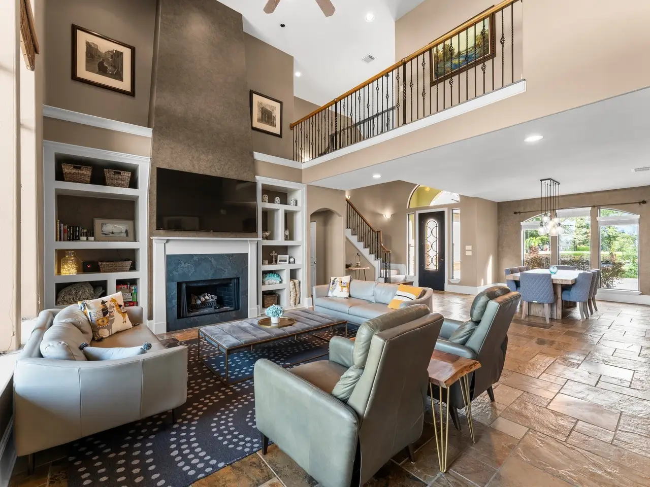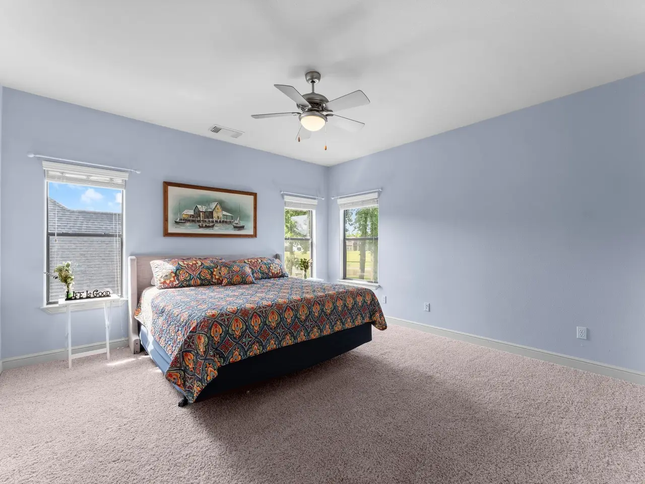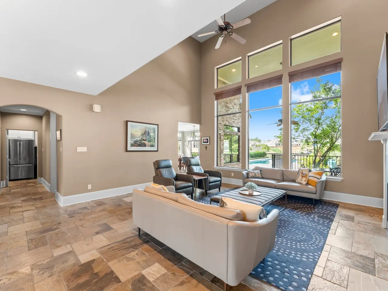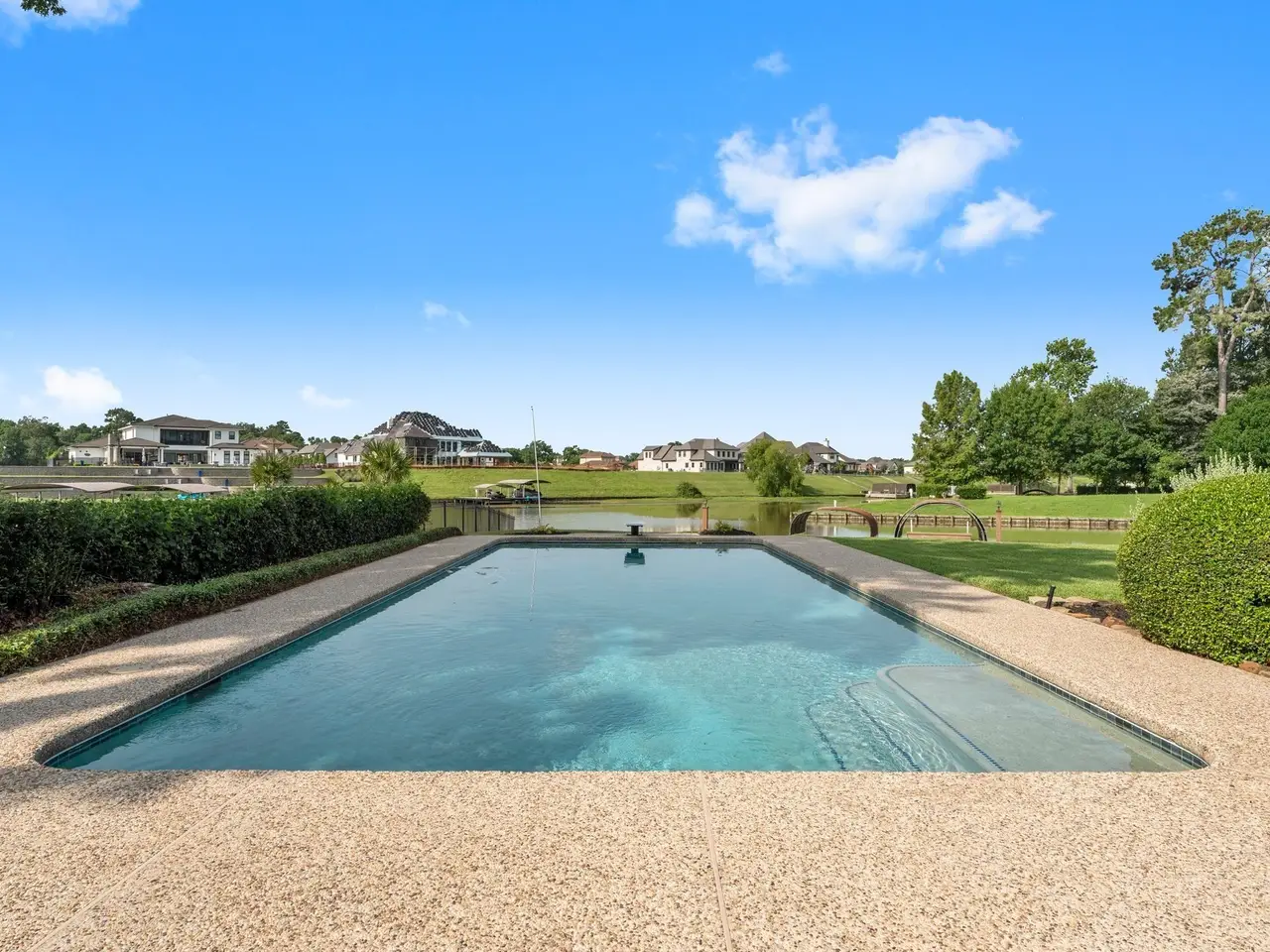 Welcome to your new Waterfront home with panoramic views from the beautiful, level back yard! Imagine relaxing by the inground pool, the covered back patio & by the firepit while watching the boats go by. Home sits on one of the widest canals with a short boat ride to the lake. Once you walk in the front door, you'll be WOWED by the scenery that the soaring ceilings/grand windows provide. This well-kept home with an open floor plan has five bedrooms, four baths & a three-car garage. Ample storage throughout including two pantries & huge linen closet. The spacious gourmet kitchen also provides amazing canal views with plenty of cabinet space, granite counter tops, large island with breakfast bar & all stainless steel appliances. This space is perfect for entertaining! Upstairs there's an oversized game room ideal for a pool table or ping pong & TV viewing area. The large backyard is gently sloped, perfect for any/all lawn games! Lawn overlooks two covered boat slips & swim pier. Manned, gated neighborhood!