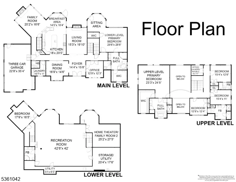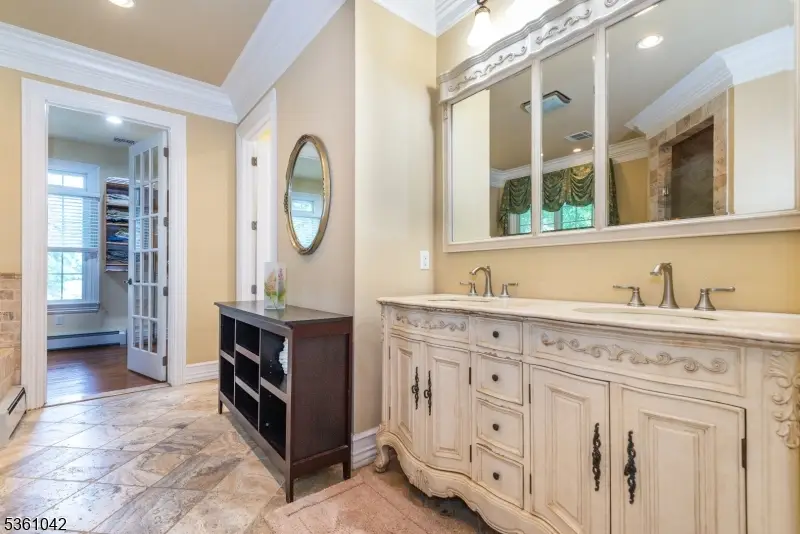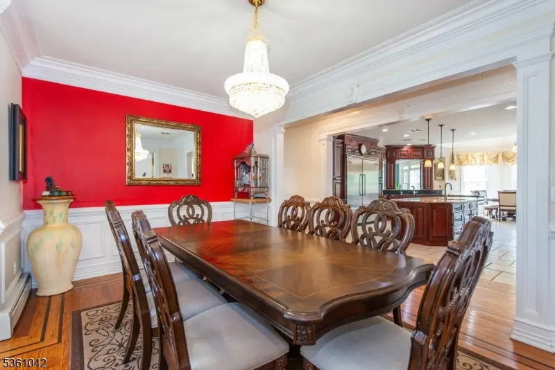 WOW factor! Discover this stunning 6-bedroom, 5.5-bath, 5.6 acre home, featuring a full brick/ stucco exterior, w/solar power, soundproof construction, circular driveway, and a 3-car garage. Built in 2010, this East-facing residence offers luxurious living with 9-foot ceilings on every floor and hardwood floors throughout, including inlaid wood accents. The two-story foyer, with chandelier adds a dramatic touch. The home includes two laundry rooms, spacious kitchen with granite countertops, a Viking 6-burner range, Sub-Zero fridge/freezer, heated tile floors, custom cabinetry, pot filler, large center island with eat-in area and formal dining room.. The family room features fireplace, custom moldings, inlaid wood floors, and coffered ceilings. A two-story living room is adorned with custom moldings, fireplace and an elegant chandelier. Additional den with double French doors and coffered ceiling and 1st fl primary suite with sitting area, walk-in closets and full en suite bathroom. Upstairs, the en suite bedroom includes an attached bath, while two additional bedrooms share a Jack-and-Jill bathroom. The bridge offers access to the 2nd fl primary suite offers high ceilings, hardwood floors, a wet bar, walk-in closet, and a luxurious custom bath with a Jacuzzi tub, double sinks, and a stand-up shower. access to a Trex deck overlooking fenced yard. The finished walkout basement has additional bath, a bedroom (currently a gym), a large rec room, and a home theater room. Four-zone AC/heat.