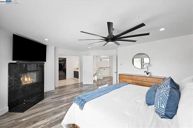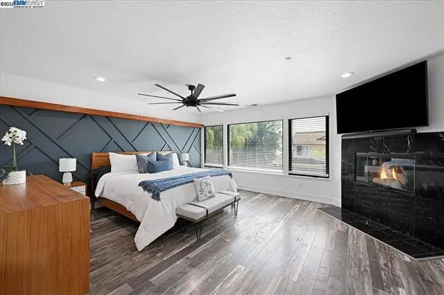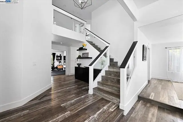 Nestled in a cul-de-sac within the NW quadrant of Morgan Hill. This updated home offers luxury, comfort, and style. Step inside to soaring ceilings and a custom glass staircase that sets the tone for this contemporary showpiece. The open floor plan features, a beautifully remodeled fireplace in the formal living room, with an adjacent formal dining area. Family room and kitchen are a true standout, equipped with Sub-Zero and Wolf appliances, porcelain countertops, full backsplash, and modern shaker cabinetry. Family room views of yard through sleek stacking doors that seamlessly blend indoor and outdoor living. 1 bedroom and a full bath located downstairs, the layout is ideal for guests or multi-generational living. Upstairs, you'll find three spacious bedrooms and two full baths. The primary suite includes a fireplace, walk-in closet, and a spa-inspired bath with a jetted tub surrounded by windows—ideal for relaxation. Enjoy year-round outdoor living in the beautifully landscaped backyard featuring a large covered patio, expansive lawn, custom planter boxes for gardening, and ample space for entertaining. Newer roof, New windows, water softener, Owned Solar System for energy efficiency. Just minutes to charming Downtown Morgan Hill, parks, and award-wining schools.