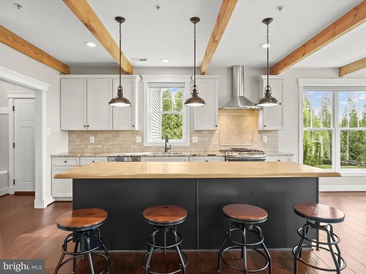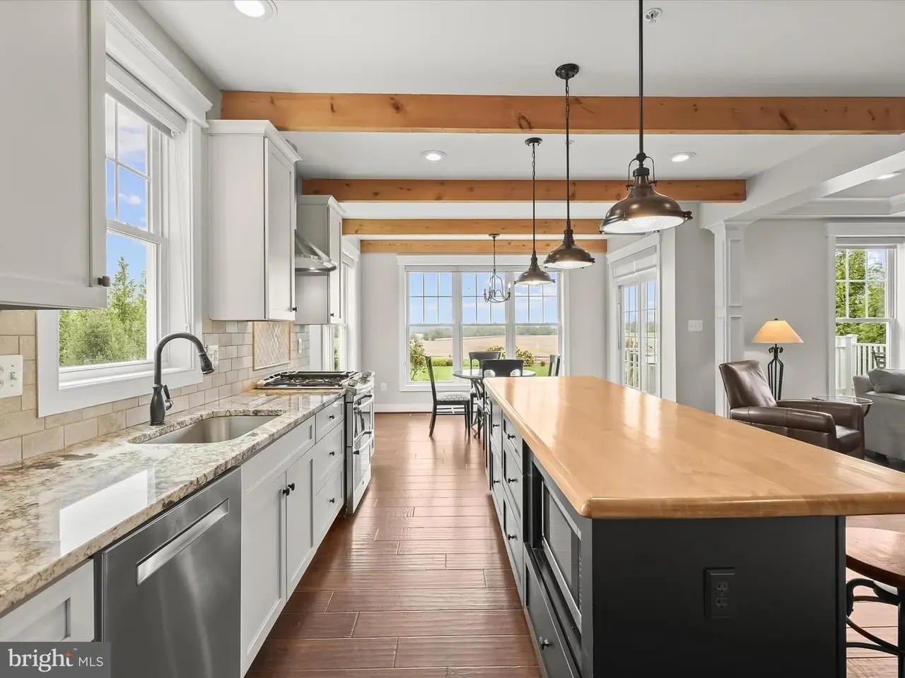 Chef's eat-in kitchen with exposed wood beams