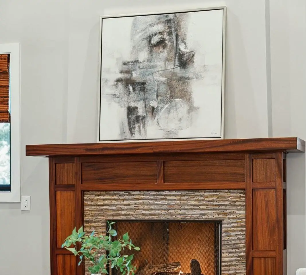 Custom Sapele wood fireplace mantel with ceramic tile surround