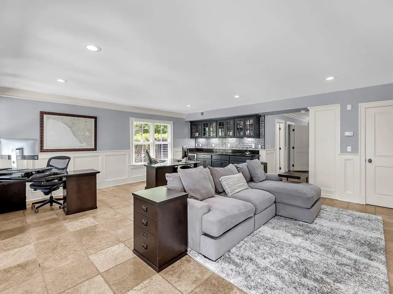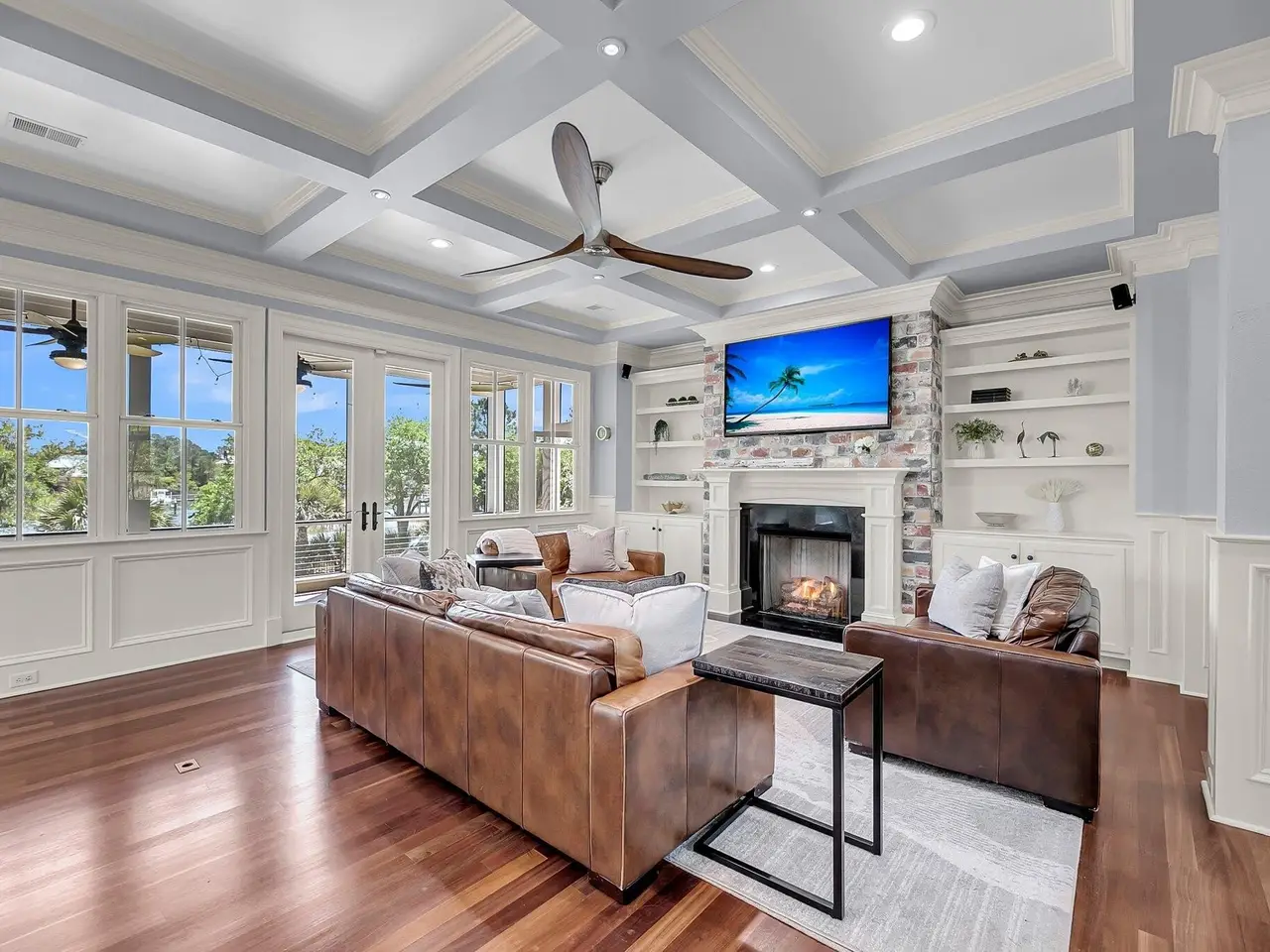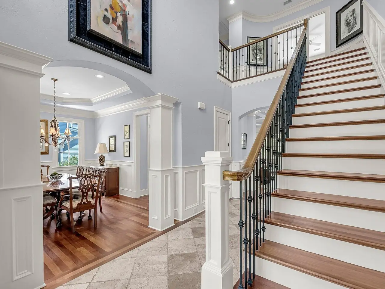 If you've been dreaming of panoramic waterfront views framed by swaying palms and a sparkling saltwater pool with spa, this custom designed Lowcountry retreat is your dream come true. From the moment you arrive, you're welcomed by a grand double staircase encircling a signature palm tree and custom-welded wrought iron railings. Gas lanterns frame a stunning solid mahogany entry door, setting the tone for the elegance and craftsmanship found throughout the home. Thoughtfully designed to capture the beauty of its setting, the open-concept main floor flows effortlessly from a dramatic double-story foyer into the great room, kitchen, breakfast area, and spacious primary suite--all opening to a large, screened porch with breathtaking views of the water and pool. A Butler's Pantry leads tothe formal dining room, and a walk-in laundry, pantry, and powder room complete the main living level. The great room features a coffered 10' ceiling, a gas fireplace with custom built-ins, and a wall of windows and French doors bringing the outdoors in. The gourmet kitchen boasts a large island, custom cabinetry, and premium Jenn-Air appliances including a 48" refrigerator, 6-burner gas cooktop, and beverage cooler. Enjoy waking every morning to a serene waterfront sunrise view from the expansive primary suite, complete with dual walk-in closets, a soaking tub, separate vanities, and a luxurious walk-in shower. Upstairs, four oversized bedrooms (two with ensuite baths, two with a shared Jack and Jill bath), a second laundry room, and a versatile bonus room with a private sun deck offer comfort and flexibility for family and guests. Outside, paradise awaits. The heated and cooled saltwater pool with integrated spa, sun shelf, fountains, and water features is a showstopper. The spacious patio invites sunbathing, entertaining, and peaceful relaxation, all while overlooking your private dock with boat lift and floater, perfect for swimming, fishing, or exploring the waterways by boat! The ground level offers a finished suite with full bath, large living area, second 48" refrigerator, additional storage closet, a walk-in storage room, enclosed workshop, and 3-car garage. Park West Amenities, paved walking paths throughout the community, 3 primary to middle schools, and a Mount Pleasant Recreation complex offer the perfect setting for families! Located in the heart of the Lowcountry, this home is a rare opportunity to own a waterfront sanctuary that seamlessly blends casual elegance, generous space, and the best of indoor-outdoor living!