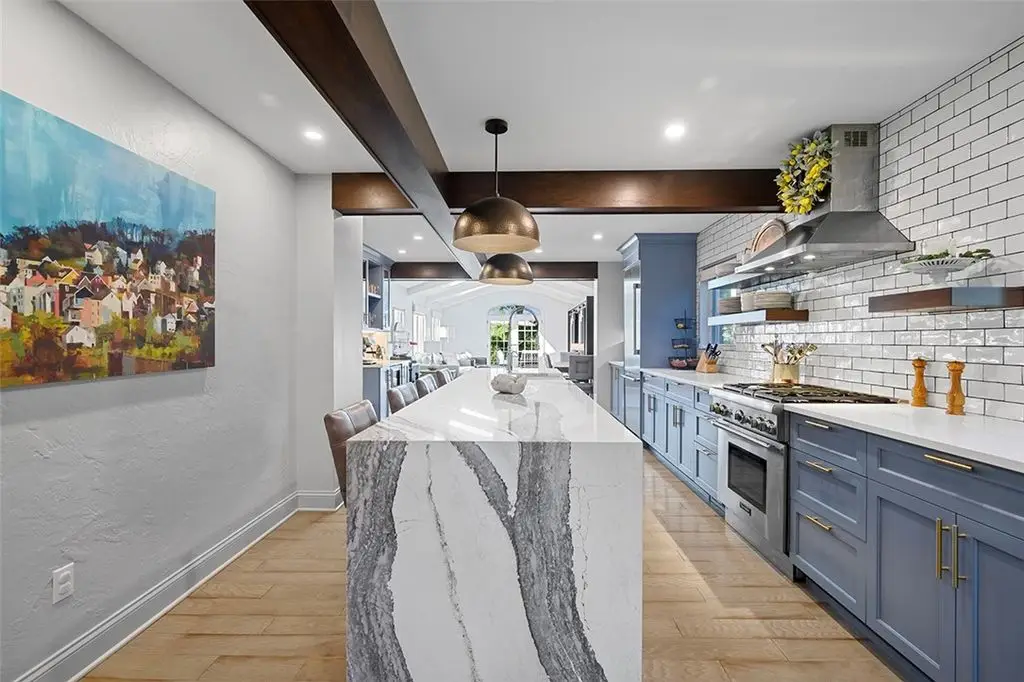 Charming Jr. Beam home in the heart of Mt. Lebanon, moments from schools, Uptown, dining, shopping & Rec Center! Modern fixtures & finishes blend beautifully w/original character - 8-panel doors w/glass knobs, plaster walls, hardwoods, archways, blt-ins & crown molding. Inviting LR features a stone fireplace flanked by built-ins & 12' opening to cozy den/lounge space, easily used as a DR. The show-stopping kitchen is a dream w/custom pale-blue cabinetry, quartz counters, floating shelves, 12' waterfall isle, beamed ceiling, hi-end appliances & coffee/beverage bar - all open to a spectacular family rm w/cathedral barrel ceiling, exposed brick, media wall, banquette dining space & French doors to spacious composite deck. Vaulted primary suite boasts a boutique-style en suite. Walk-out lower level ideal in-law or teen suite, gameroom, full bath, storage & mud rm/drop zone off 2-car garage. This remarkable home offers timeless charm, modern luxury and a prime Mt. Lebanon location.