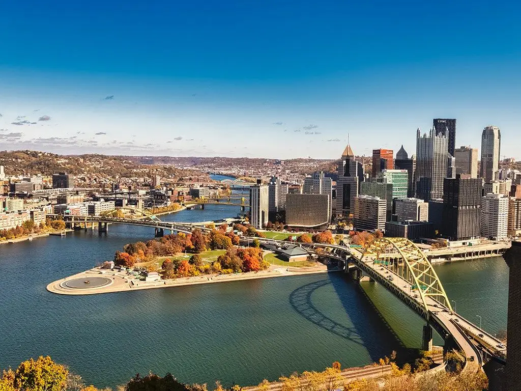 Panoramic views of Pittsburgh skyline, rivers, and stadiums