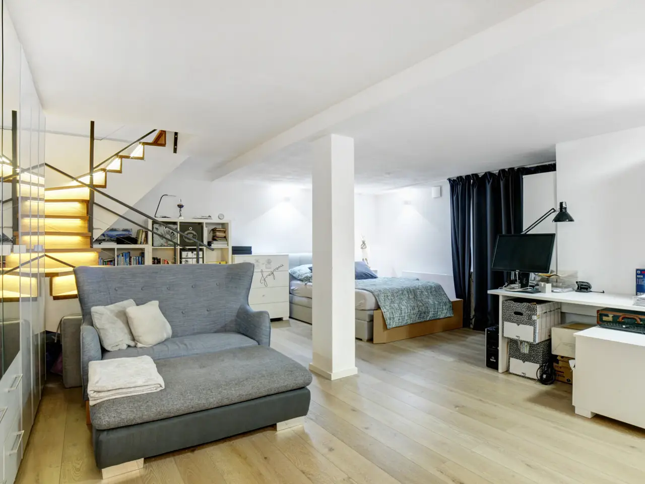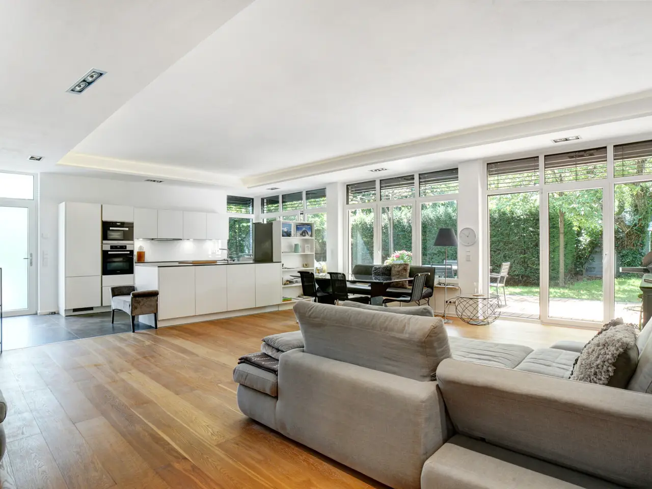For sale is a spacious, light-flooded and barrier-free 2+1 room loft apartment with approx. 158 m² of living space on the first floor of a small condominium in a well-kept multi-family villa. A special highlight is the separate, private entrance to the apartment. You enter your new home directly - without using the communal stairwell. This ensures a high degree of privacy and gives the apartment a pleasant house-within-a-house atmosphere. The generous amount of space and the well thought-out floor plan make this apartment particularly attractive for couples who value peace, comfort and a flexible living concept. Large window fronts facing the south-west garden with electric blinds let in plenty of light and create an open, inviting living atmosphere. In combination with the high ceilings, this creates a unique sense of space. Another highlight is the approx. 180 m² private south-west-facing garden, which is assigned exclusively to this unit. It offers space for relaxation, for sociable evenings outdoors or simply as a personal retreat in the middle of the city. The apartment is complemented by a basement area with its own bathroom that can be used as a living space - ideal as a guest room, hobby room, wellness area or home cinema. The basement area is heated, has its own bathroom and is directly accessible via an internal connection to the underground garage. Perfect as a guest area or for professionals working from home. Overall, this property combines upscale living comfort, maximum privacy, barrier-free accessibility and an ideal location - perfect for couples who demand quality, space and tranquillity.