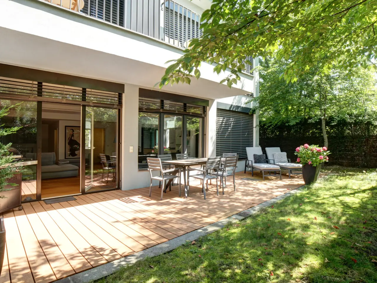 South-west garden with electric blinds