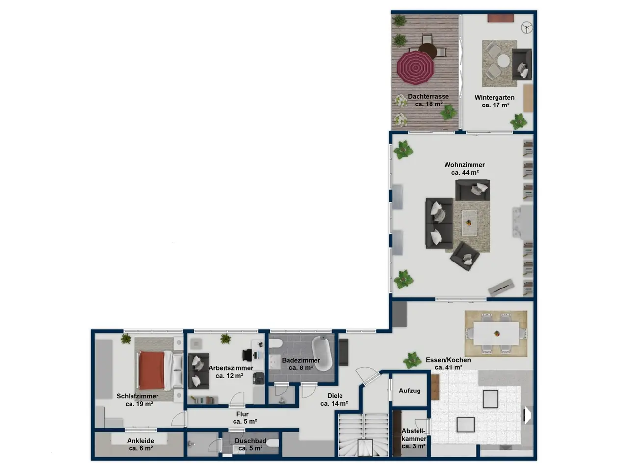 This exclusive top-floor apartment with a living space of approx. 182 m² is for sale in an Art Nouveau building dating from 1890. The house was extensively renovated in 2002 and the top-floor apartment was newly built (it therefore dates from 2002). Here, classic architecture is combined with modern comfort and a spacious living atmosphere. The apartment is located on the fourth floor, is easily accessible by elevator and impresses with its open, light-flooded room concept. The spacious cooking and dining area is elegantly integrated into the living area and forms the communicative center of the apartment. An open fireplace in the living room provides a warm, atmospheric touch and lends the room comfort and depth. In addition to the quiet bedroom with integrated dressing room and sliding doors, there is a further room that is ideal as a study, children's room or guest room. The apartment has a daylight bathroom with bathtub and separate shower as well as an additional guest shower room. Custom-made built-in wardrobes in the hallway and a storage room next to the open kitchen offer discreet storage space. A separate cellar compartment offers additional storage space. The apartment is equipped with a modern smart home system that enables convenient control of lighting, heating and other functions. A special highlight is the heated conservatory, which is suitable as a retreat all year round. Generous window areas let in plenty of light and create a bright, homely atmosphere. Equally impressive is the sunny west-facing roof terrace - a private outdoor retreat with sunshine well into the evening hours and a view of the quiet, green inner courtyard. This top-floor apartment combines the flair of a classic old building with the elegance of modern living concepts, creating a perfect symbiosis of past and present - right in the heart of the city. If desired, a rented underground parking space in the neighborhood can be taken over. This is a convenience factor that should not be underestimated in this central location. We are at your disposal for a viewing and look forward to your inquiry!