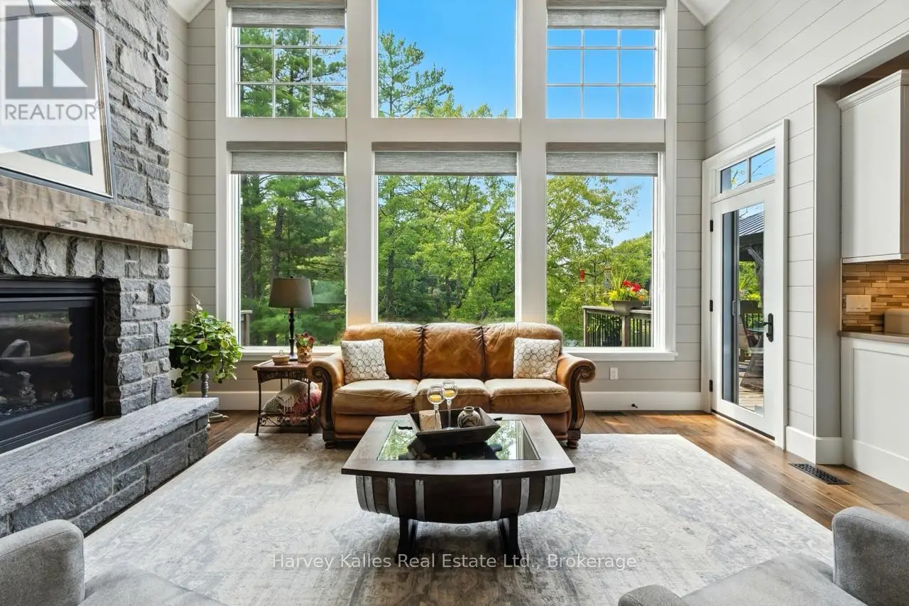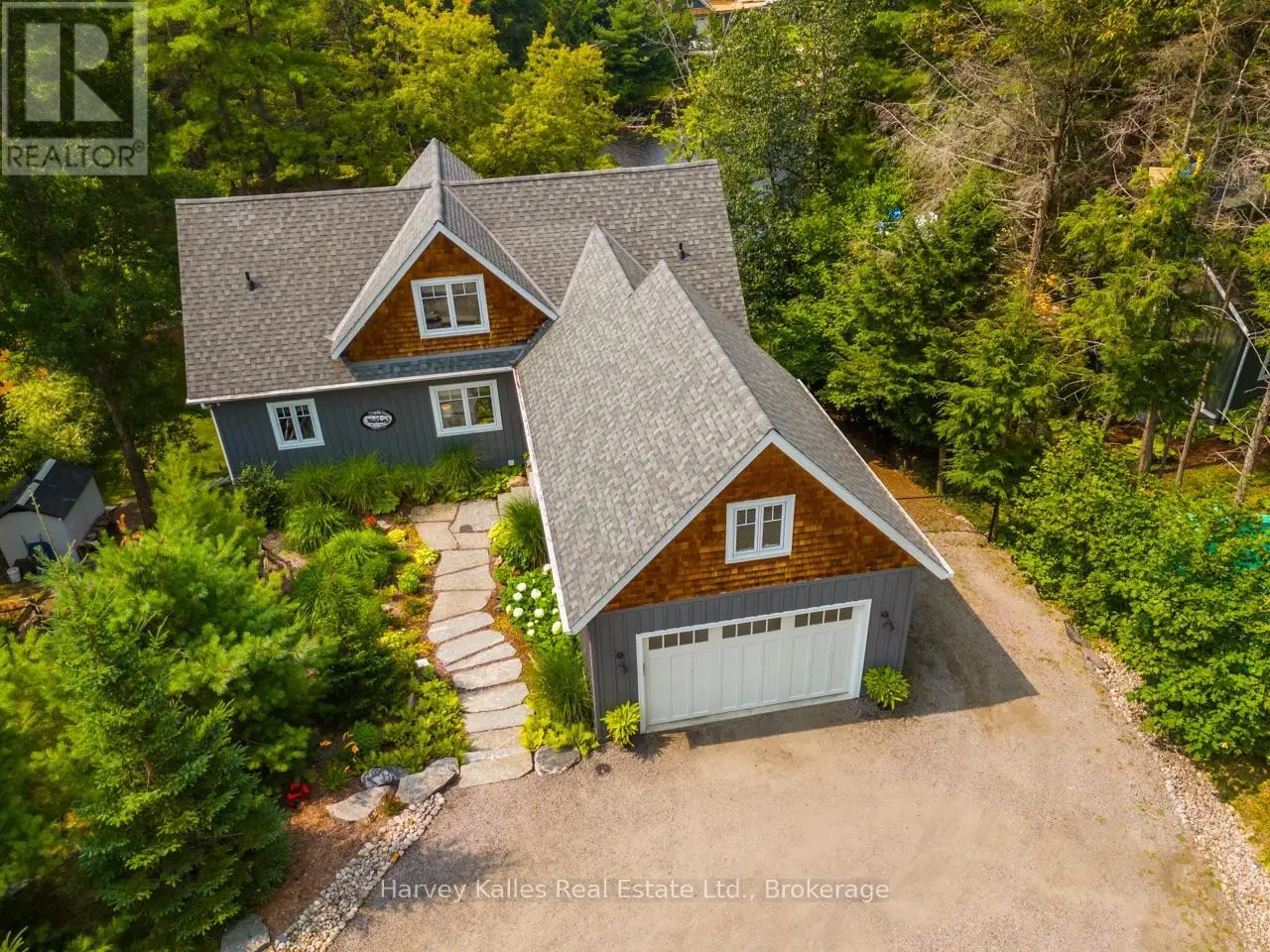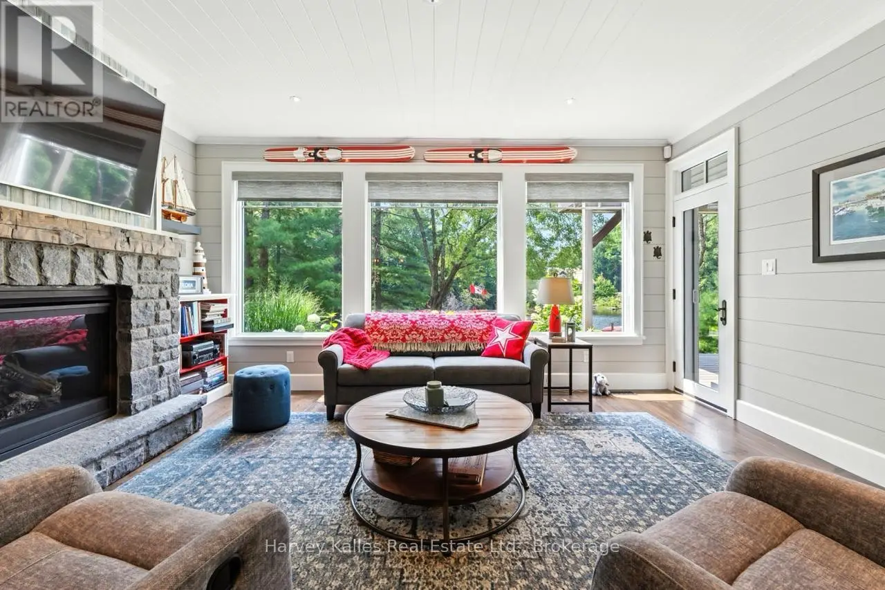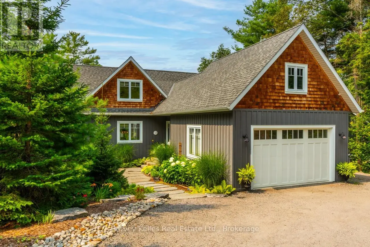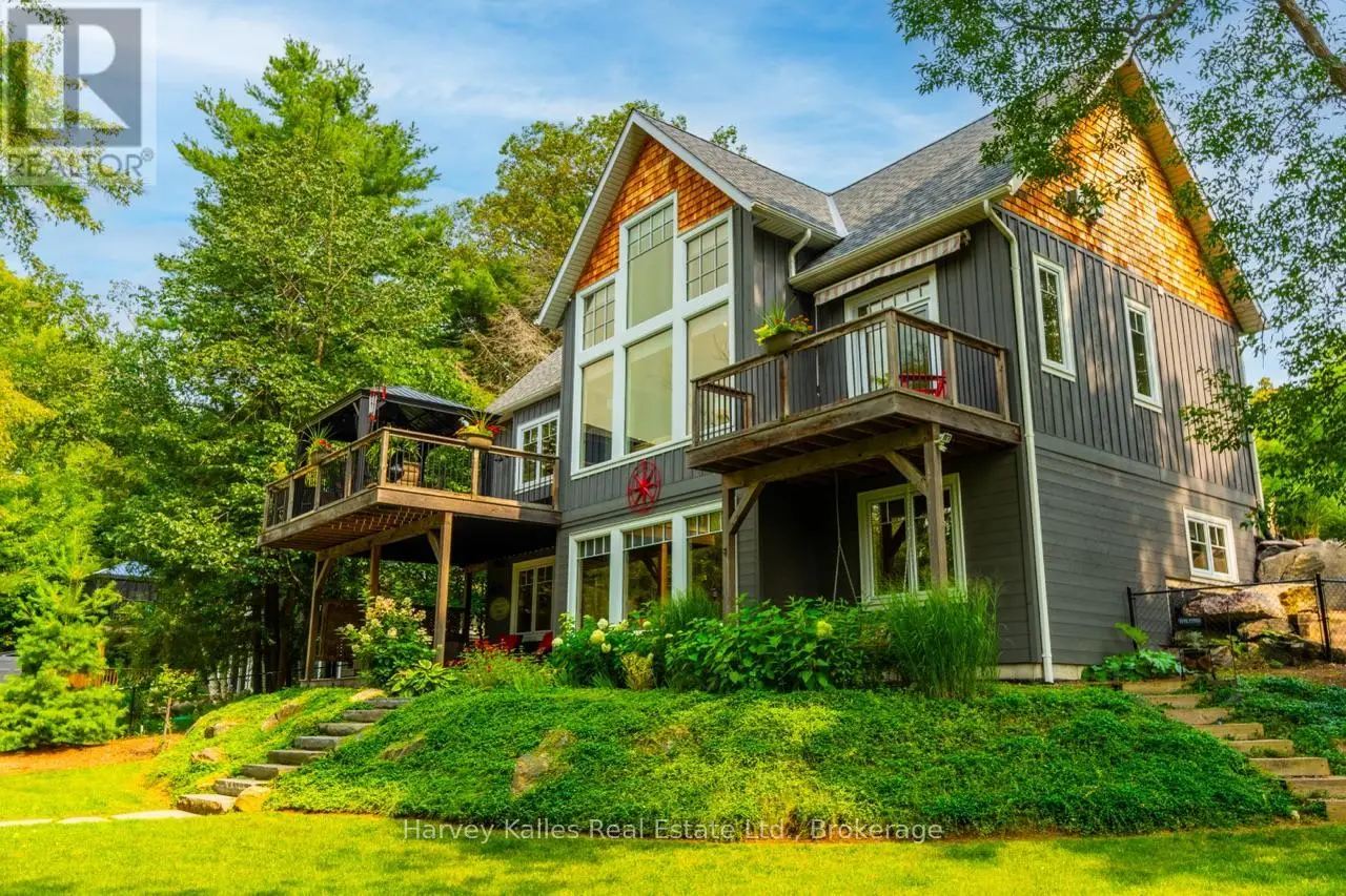 Custom built one owner South West facing Year Round Lake Muskoka beauty ideally located between Beaumaris and Port Carling on 101 Ft. (assessed) of mainland shoreline with year round municipal road access. Gentle topography, towering trees, handsome architecture. A most rare & value-packed, 1st ever offering. Built by Lakeridge Developments in 2017, the 3 bedroom plus a den, plus an office, plus a loft, gorgeous family cottage or year round home, features all the modern comforts, with approx. 2,500 square feet of finished living space, 2 classic Muskoka stone propane-burning fireplaces, random width red pine flooring throughout, and a finished lower level walkout. Cleverly designed, brilliant main floor layout captures glimpses of water views, with south-west oriented principal rooms for loads of natural light. Stunning chef's kitchen with custom cabinetry, centre island w/granite top, opening to the dramatic 1 1/2 storey great room with fireplace, wall of windows, and walkout to a lakeside deck. Dining area, laundry room, powder room, and primary bedroom with its own private deck, 4 pc. ensuite with double sinks, and walk-in closet, are also located on the main floor. Attached garage with inside entry. Large loft with separate sitting room. Finished lower level walkout boasts warm hardwood floors, raised above a heated crawl space, with centrepiece family room with wet bar, another stone fireplace, lakeside bedrooms, 3 pc. bath, plus a den and an office. Gentle level grounds with ample table land, fire pit spot, covered hot tub deck, and dock with deeper and shallower water. All the practical living features and facets have been well thought-out and infused into the design. Complete with full back-up Generac, drilled well, efficient propane furnace, central air, and all the bells. This is a turnkey, virtually new, customized to perfection, lake front hideaway in one of the most desirable locales of Lk. Muskoka. Minutes to shopping, dining, golf, and all the amenit (id:16999)