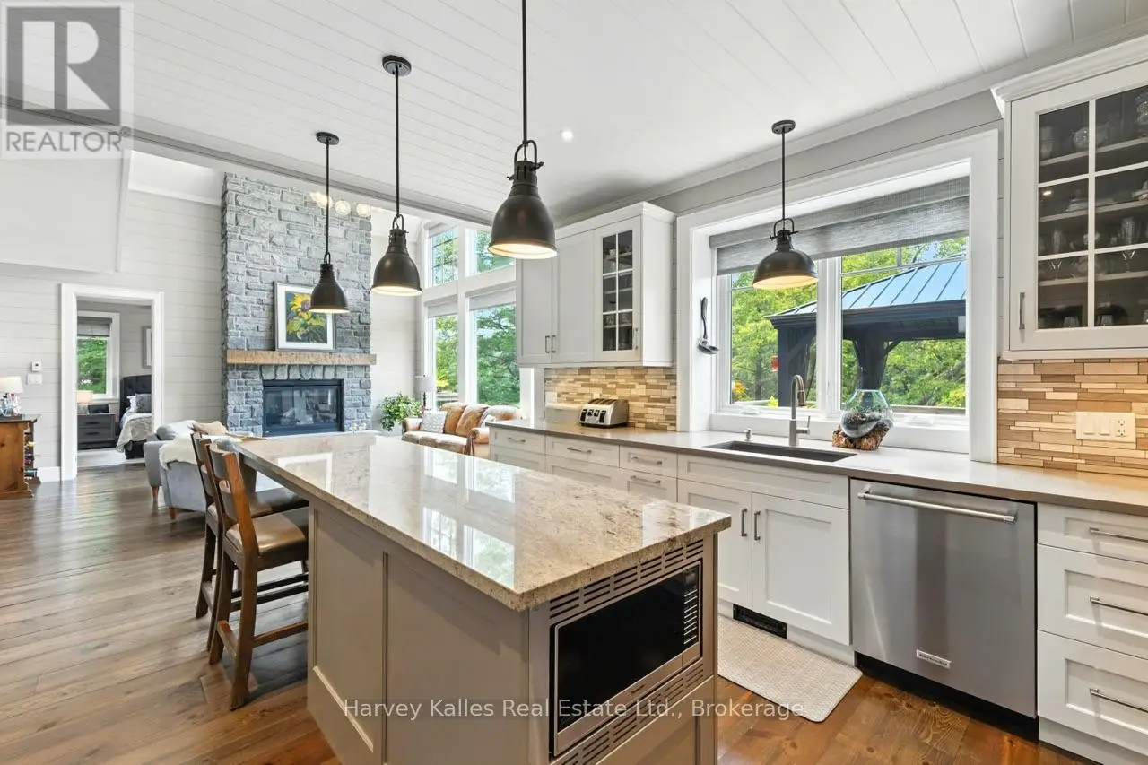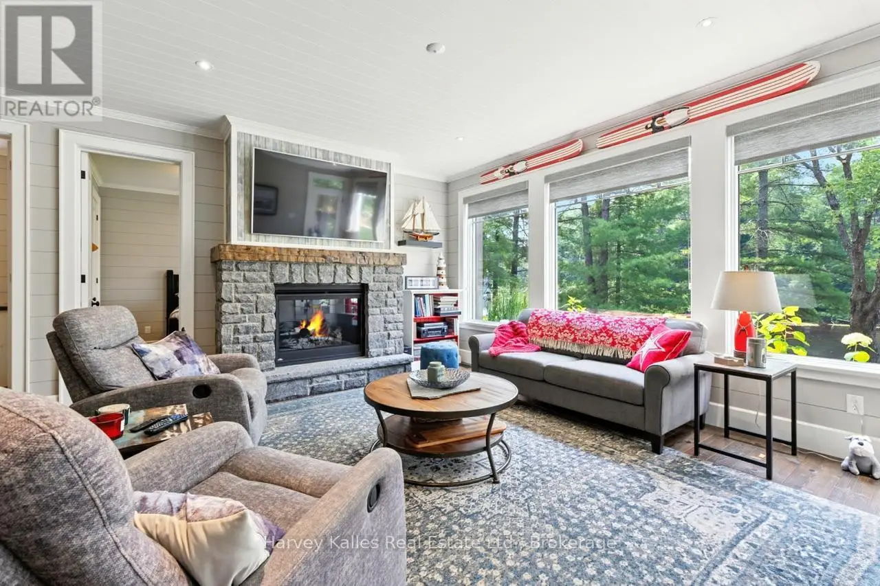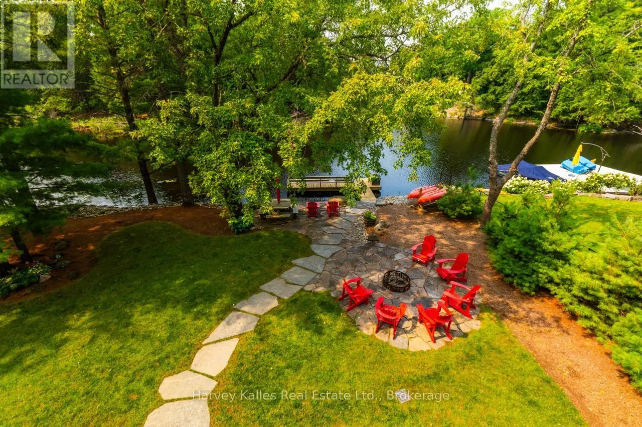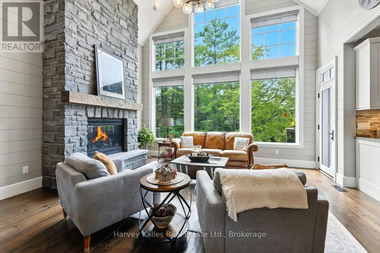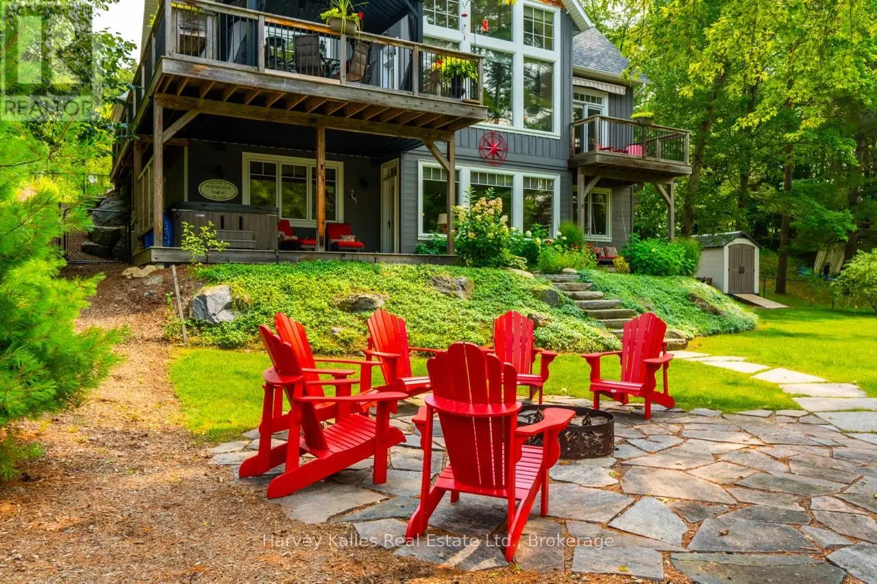 Custom built one owner South West facing Year Round Lake Muskoka beauty ideally located between Beaumaris and Port Carling on 101 Ft. (assessed) of mainland shoreline with year round municipal road access. Gentle topography, towering trees, handsome architecture. A most rare & value-packed, 1st ever offering. Built by Lakeridge Developments in 2017, the 3 bedroom plus a den, plus an office, plus a loft, gorgeous family cottage or year round home, features all the modern comforts, with approx. 2,500 square feet of finished living space, 2 classic Muskoka stone propane-burning fireplaces, random width red pine flooring throughout, and a finished lower level walkout. Cleverly designed, brilliant main floor layout captures glimpses of water views, with south-west oriented principal rooms for loads of natural light. Stunning chef's kitchen with custom cabinetry, centre island w/granite top, opening to the dramatic 1 1/2 storey great room with fireplace, wall of windows, and walkout to a lakeside deck. Dining area, laundry room, powder room, and primary bedroom with its own private deck, 4 pc. ensuite with double sinks, and walk-in closet, are also located on the main floor. Attached garage with inside entry. Large loft with separate sitting room. Finished lower level walkout boasts warm hardwood floors, raised above a heated crawl space, with centrepiece family room with wet bar, another stone fireplace, lakeside bedrooms, 3 pc. bath, plus a den and an office. Gentle level grounds with ample table land, fire pit spot, covered hot tub deck, and dock with deeper and shallower water. All the practical living features and facets have been well thought-out and infused into the design. Complete with full back-up Generac, drilled well, efficient propane furnace, central air, and all the bells. This is a turnkey, virtually new, customized to perfection, lake front hideaway in one of the most desirable locales of Lk. Muskoka. Minutes to shopping, dining, golf, and all the amenit (id:16999)