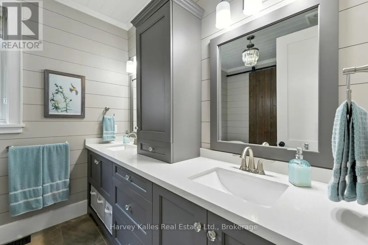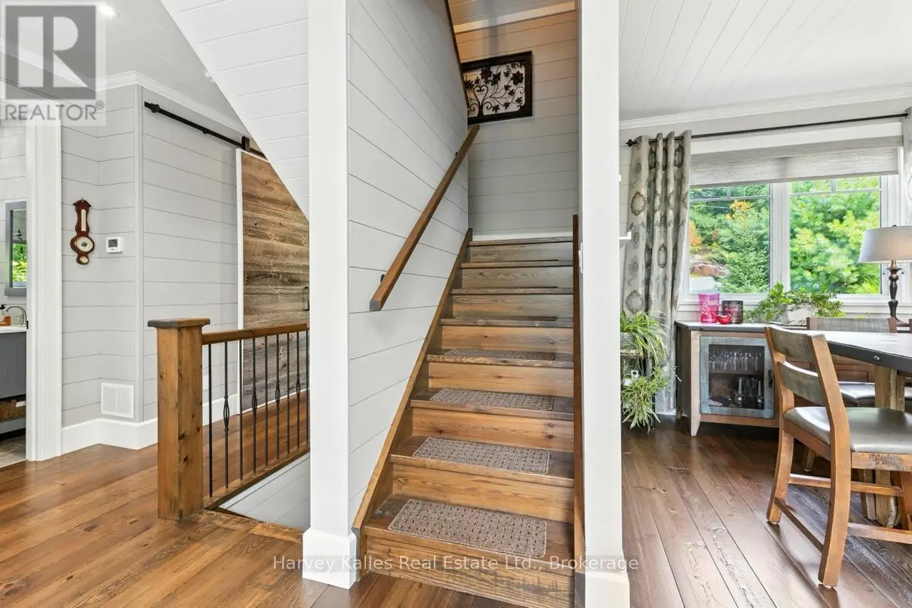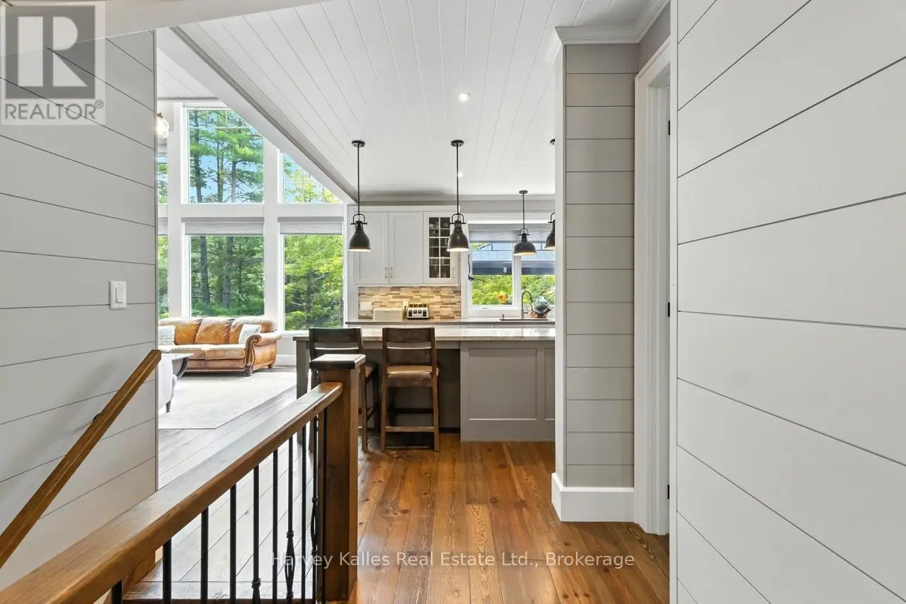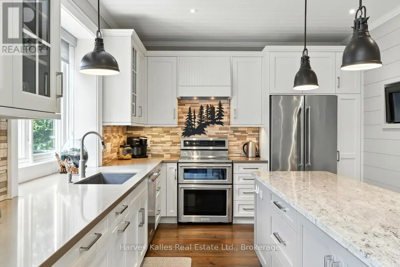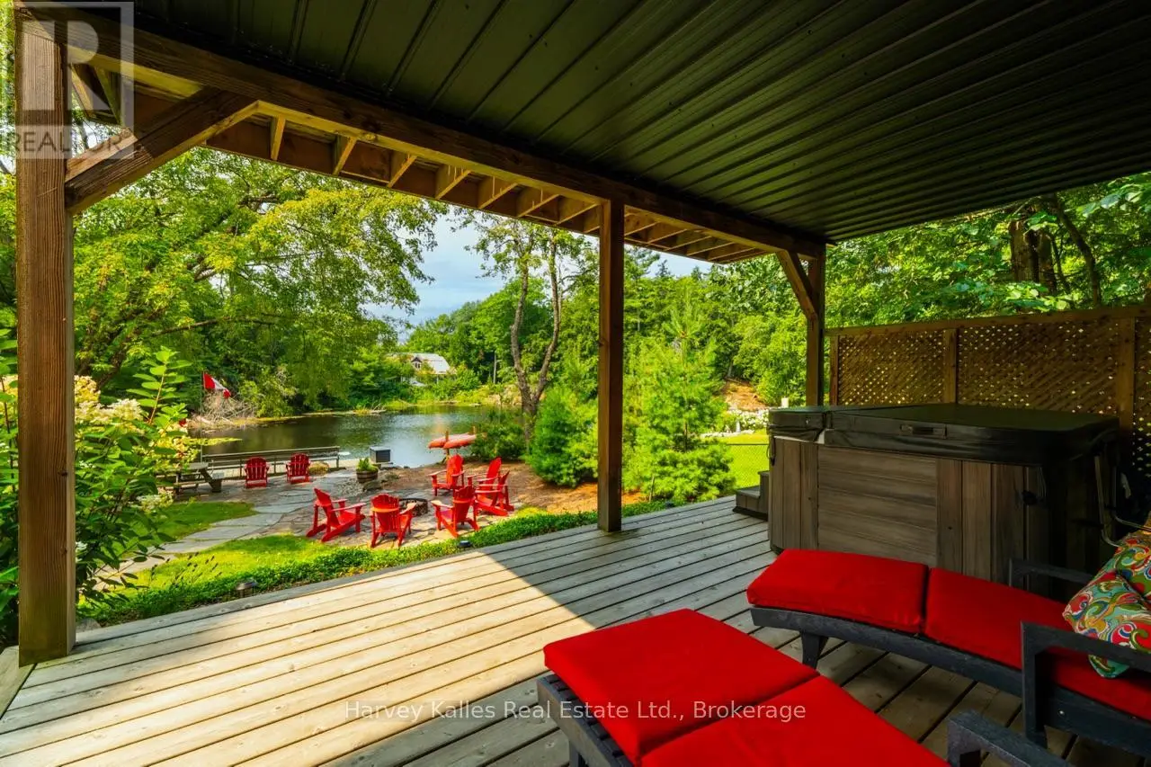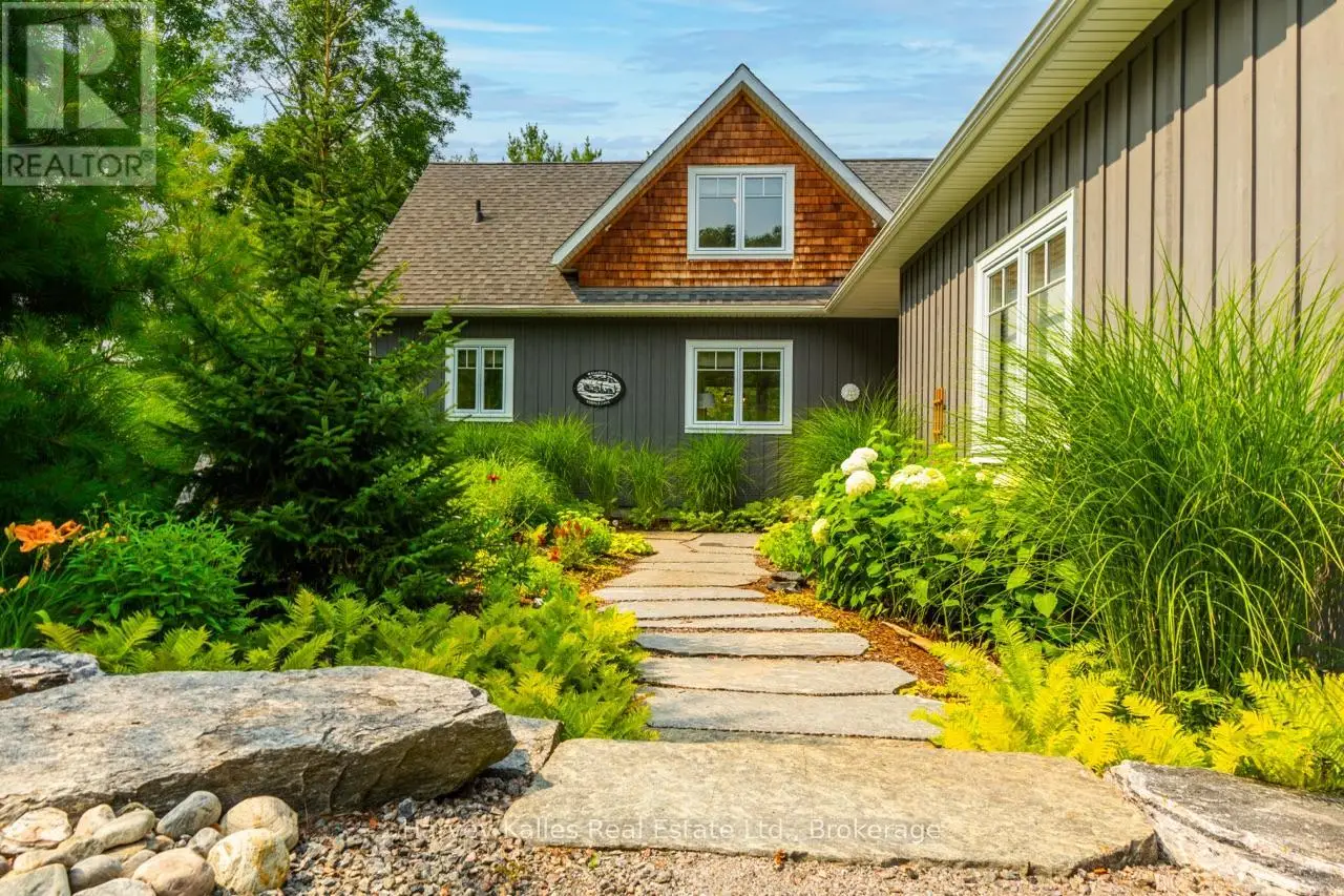Custom built one owner South West facing Year Round Lake Muskoka beauty ideally located between Beaumaris and Port Carling on 101 Ft. (assessed) of mainland shoreline with year round municipal road access. Gentle topography, towering trees, handsome architecture. A most rare & value-packed, 1st ever offering. Built by Lakeridge Developments in 2017, the 3 bedroom plus a den, plus an office, plus a loft, gorgeous family cottage or year round home, features all the modern comforts, with approx. 2,500 square feet of finished living space, 2 classic Muskoka stone propane-burning fireplaces, random width red pine flooring throughout, and a finished lower level walkout. Cleverly designed, brilliant main floor layout captures glimpses of water views, with south-west oriented principal rooms for loads of natural light. Stunning chef's kitchen with custom cabinetry, centre island w/granite top, opening to the dramatic 1 1/2 storey great room with fireplace, wall of windows, and walkout to a lakeside deck. Dining area, laundry room, powder room, and primary bedroom with its own private deck, 4 pc. ensuite with double sinks, and walk-in closet, are also located on the main floor. Attached garage with inside entry. Large loft with separate sitting room. Finished lower level walkout boasts warm hardwood floors, raised above a heated crawl space, with centrepiece family room with wet bar, another stone fireplace, lakeside bedrooms, 3 pc. bath, plus a den and an office. Gentle level grounds with ample table land, fire pit spot, covered hot tub deck, and dock with deeper and shallower water. All the practical living features and facets have been well thought-out and infused into the design. Complete with full back-up Generac, drilled well, efficient propane furnace, central air, and all the bells. This is a turnkey, virtually new, customized to perfection, lake front hideaway in one of the most desirable locales of Lk. Muskoka. Minutes to shopping, dining, golf, and all the amenit (id:16999)