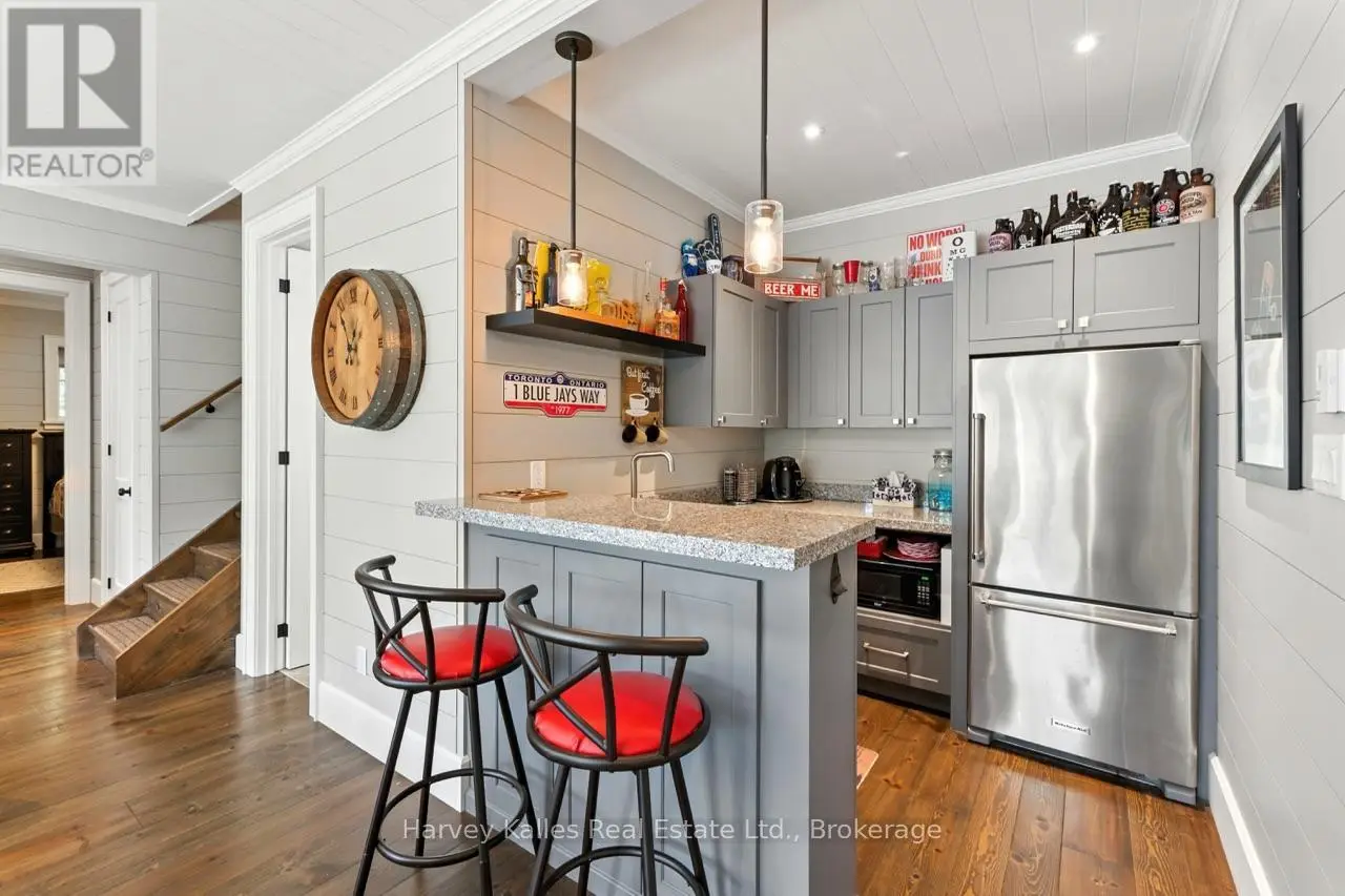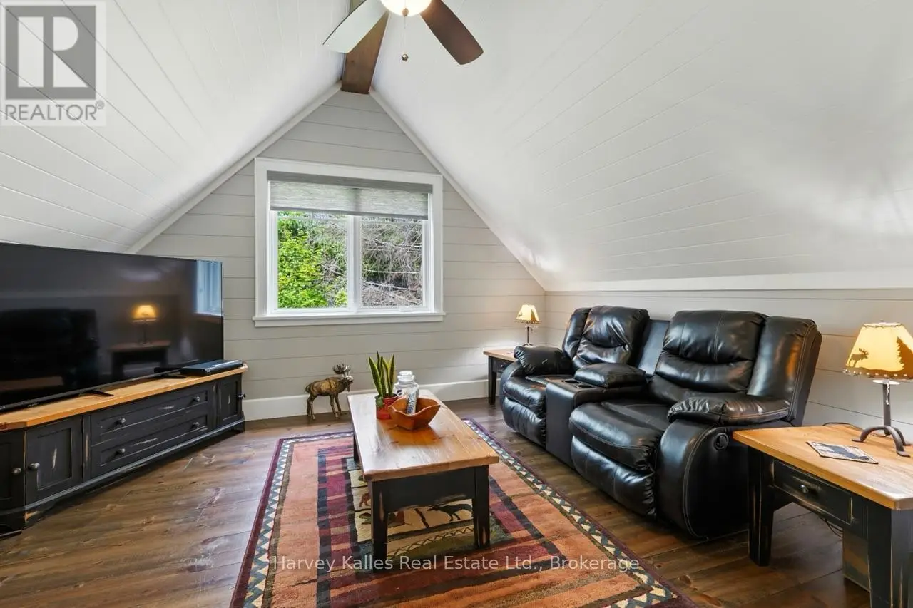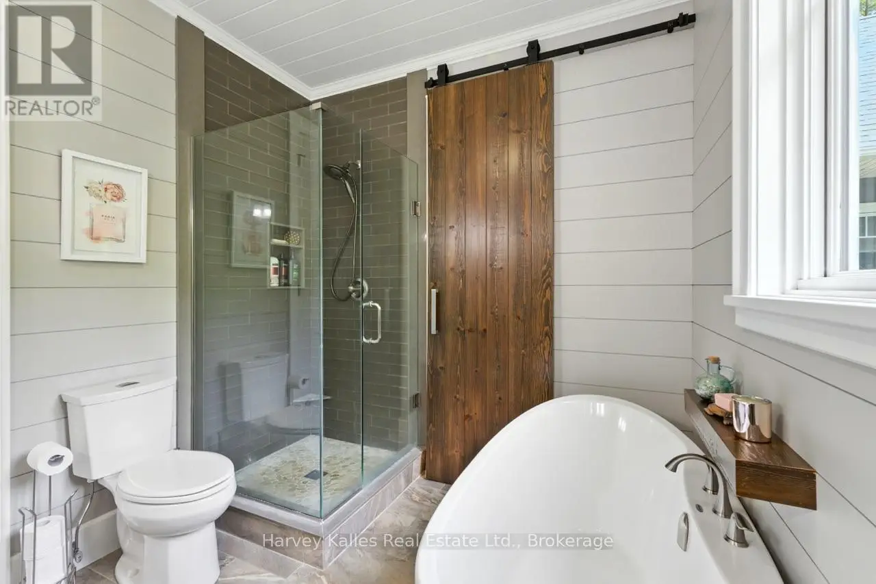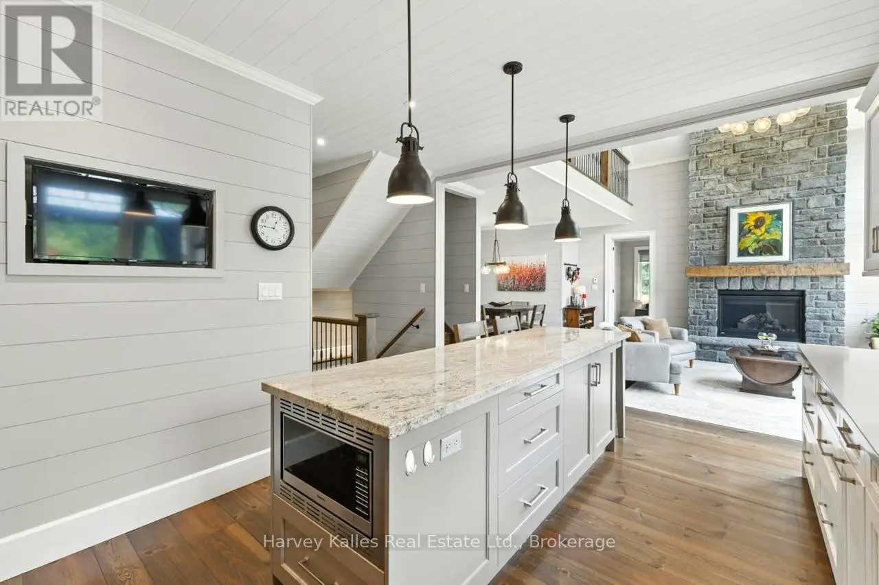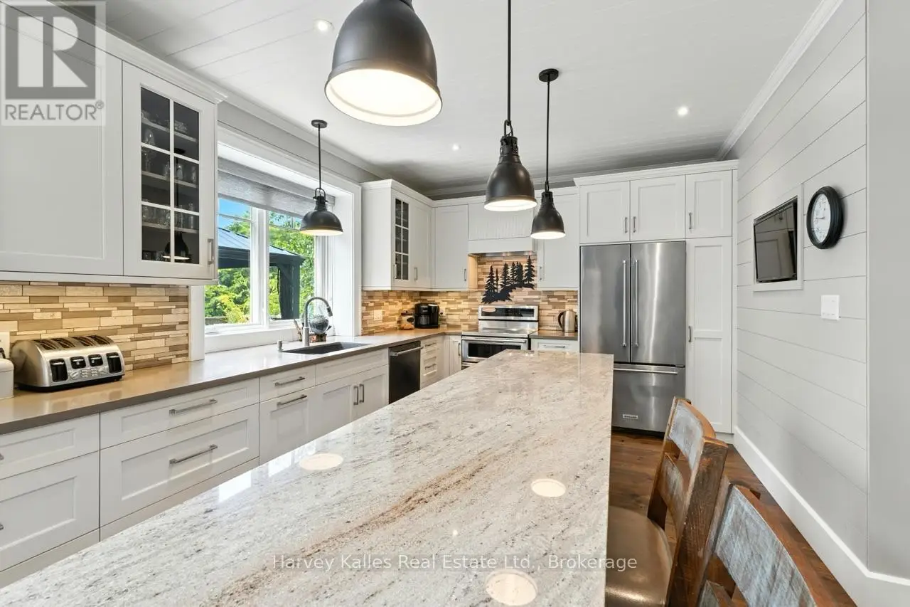 Custom built one owner South West facing Year Round Lake Muskoka beauty ideally located between Beaumaris and Port Carling on 101 Ft. (assessed) of mainland shoreline with year round municipal road access. Gentle topography, towering trees, handsome architecture. A most rare & value-packed, 1st ever offering. Built by Lakeridge Developments in 2017, the 3 bedroom plus a den, plus an office, plus a loft, gorgeous family cottage or year round home, features all the modern comforts, with approx. 2,500 square feet of finished living space, 2 classic Muskoka stone propane-burning fireplaces, random width red pine flooring throughout, and a finished lower level walkout. Cleverly designed, brilliant main floor layout captures glimpses of water views, with south-west oriented principal rooms for loads of natural light. Stunning chef's kitchen with custom cabinetry, centre island w/granite top, opening to the dramatic 1 1/2 storey great room with fireplace, wall of windows, and walkout to a lakeside deck. Dining area, laundry room, powder room, and primary bedroom with its own private deck, 4 pc. ensuite with double sinks, and walk-in closet, are also located on the main floor. Attached garage with inside entry. Large loft with separate sitting room. Finished lower level walkout boasts warm hardwood floors, raised above a heated crawl space, with centrepiece family room with wet bar, another stone fireplace, lakeside bedrooms, 3 pc. bath, plus a den and an office. Gentle level grounds with ample table land, fire pit spot, covered hot tub deck, and dock with deeper and shallower water. All the practical living features and facets have been well thought-out and infused into the design. Complete with full back-up Generac, drilled well, efficient propane furnace, central air, and all the bells. This is a turnkey, virtually new, customized to perfection, lake front hideaway in one of the most desirable locales of Lk. Muskoka. Minutes to shopping, dining, golf, and all the amenit (id:16999)