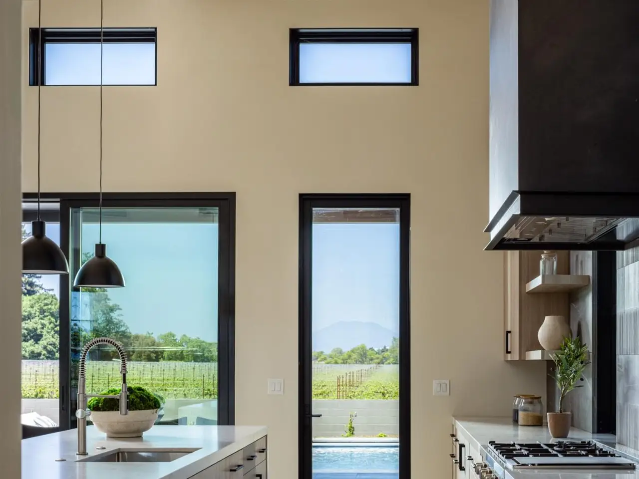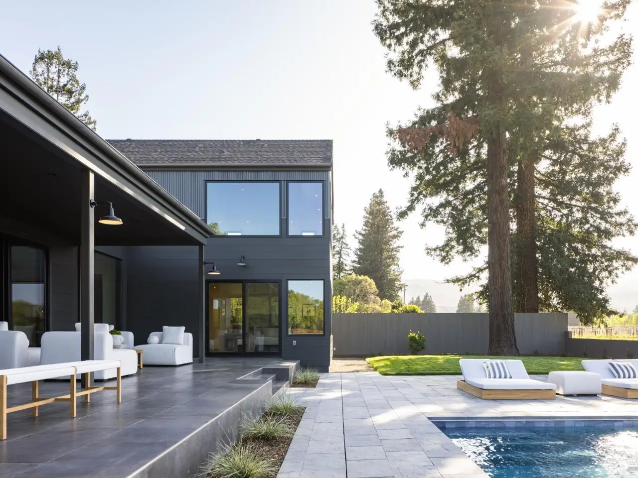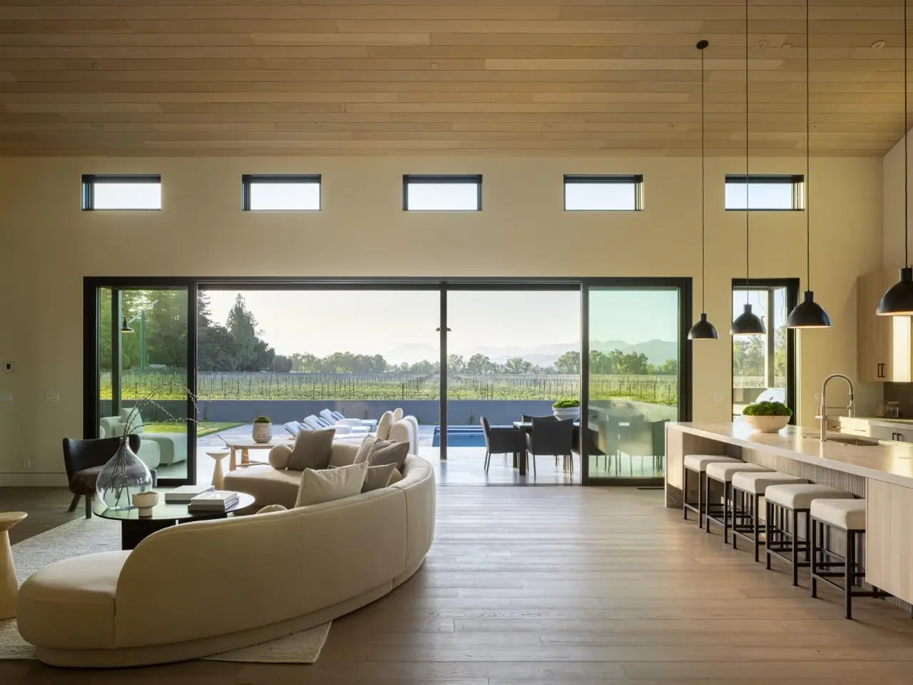 In one of Napa Valley's most iconic winegrowing regions, this distinctive Rutherford property captures panoramic vineyard views and a profound sense of seclusion. Encompassing approximately 0.33 acres and surrounded by premium Cabernet Sauvignon vines, it occupies a rare position within the heart of the renowned Rutherford AVA. The residence is a bold yet refined interpretation of agrarian design, blending rustic materials with contemporary formvertical and horizontal siding, corrugated metal accents, and crisp, clean lines define its striking silhouette. The residence features three thoughtfully designed bedrooms, including a tranquil primary suite on the main level that offers comfort and privacy. At the heart of the home, a dramatic great room with vaulted ceilings, transom windows, and an expansive wall of sliding glass doors opens to a covered loggia, creating a seamless connection between indoors and out. Just steps from the main kitchen, a fully equipped outdoor kitchen enhances the ease of alfresco dining and entertaining. The terrace unfolds to a sun-drenched pool bordered by low garden walls, manicured lawn, and generous lounge spaceall set against unobstructed views of surrounding vineyards. This property embodies the elegance and ease of Napa Valley living.