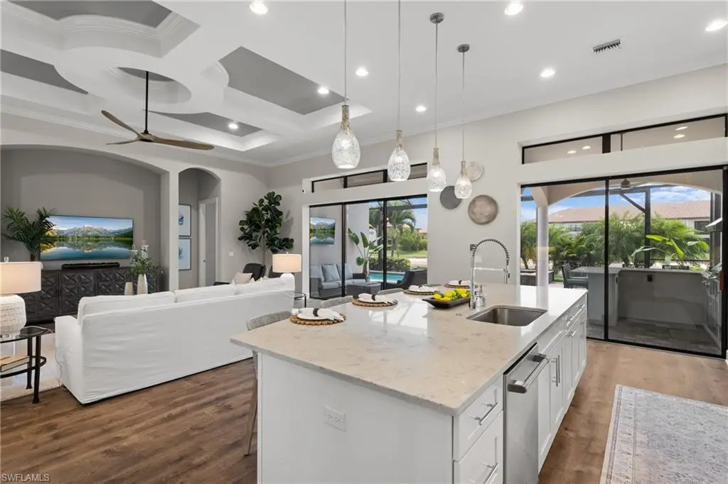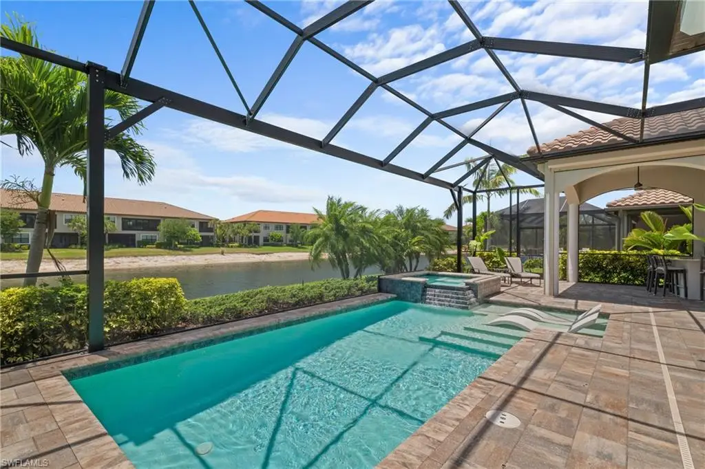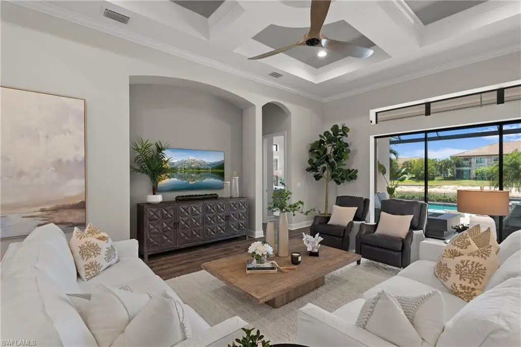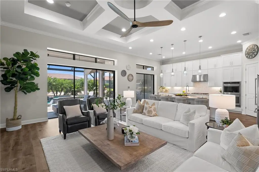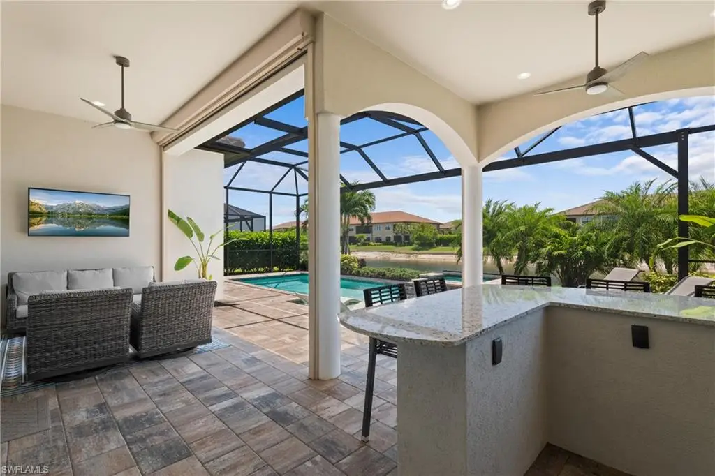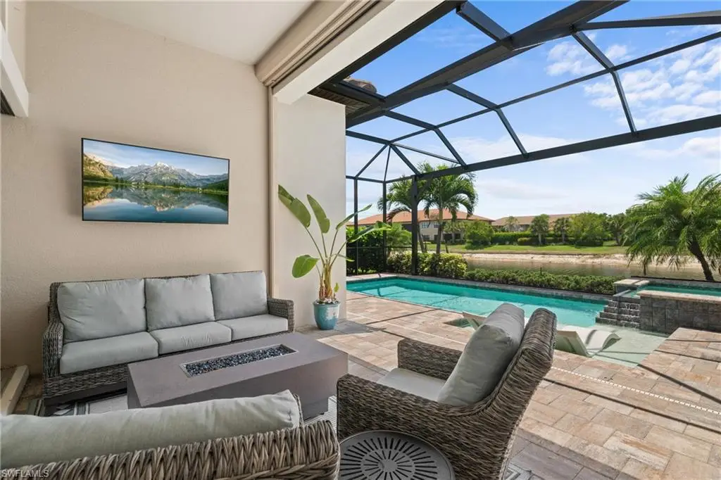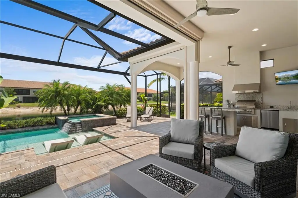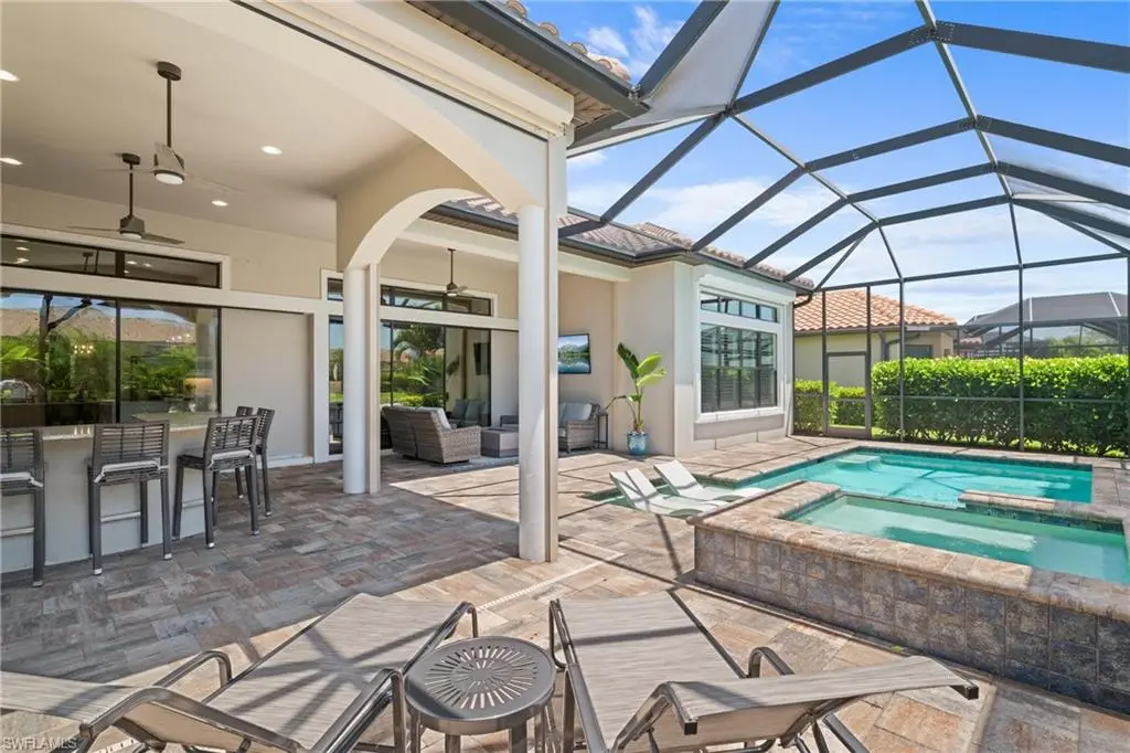 LIVE A VACATION LIFESTYLE IN ESPLANADE! FULL GOLF MEMBERSHIP INCLUDED! This immaculate ôFrancesco" (3 Bedrooms + Den, 3.5 Baths, 3 Car Garage) features nearly 2,900 sq ft of living space under air and has been lovingly cared for by its original owners. From the moment you enter the home through the double glass front doors, you are greeted with an open great room style floorplan with 12' ceilings throughout each room of the home with an abundance of windows & additional transom windows, wood floors throughout the common areas, den & bedrooms, impressive coffered style tray ceilings, and two sets of pocketing sliding glass doors to the extended lanai complete with outdoor kitchen & bar, GAS heated salt water pool/spa/sunshelf, and picture window screen cage overlooking the lake. The spacious kitchen lends itself to entertaining with an oversized island, shaker style cabinetry, quartz countertops, GE Cafe appliances including GAS cooktop & double wall ovens, abundance of cabinetry included 24-inch upper cabinets to complete the high end look. The den serves as a bonus living space and is outfitted with built-in cabinets including two twin murphy beds for overflow guests. You will be sure to catch sunsets 365 days a year from this home's west facing rear exposure overlooking the lake. For a peace of mind, this home features a mix of hurricane impact windows, motorized roll down hurricane shutters, and accordion hurricane shutters on all openings. A long list of special features include: ELECTRIC ROLL DOWN HURRICANE SCREENS/SHUTTERS on the lanai; custom outdoor kitchen and bar complete with grill, hood, sink, and refrigerator; upgraded climate controlled garage with finished floor & cabinetry; custom closet cabinetry & shelving throughout; dry bar with beverage cooler; plantation shutters; landscaping lighting; crown molding; and more! Esplanade Golf & Country Club of North Naples offers a true "Lifestyle Community" with world-class amenities, including a resort pool with cabanas and the popular "Bahama Bar," tennis, pickleball, bocce, a 14-mile network of bike/walking trails, and an 18-hole private golf course. The impressive 15,000 Sq Ft clubhouse features a restaurant, bar, wine-tasting room, wine lockers, and a Starbucks-style cafe. Best of all, the property's landscaping, irrigation, golf membership, and all community amenities are covered under a quarterly fee of just $3,434ùno additional fees or memberships required! Don't miss your opportunity to own this exceptional home in one of Naples' most sought-after communities. Schedule your tour of this stunning home and Esplanade Golf & Country Club today!