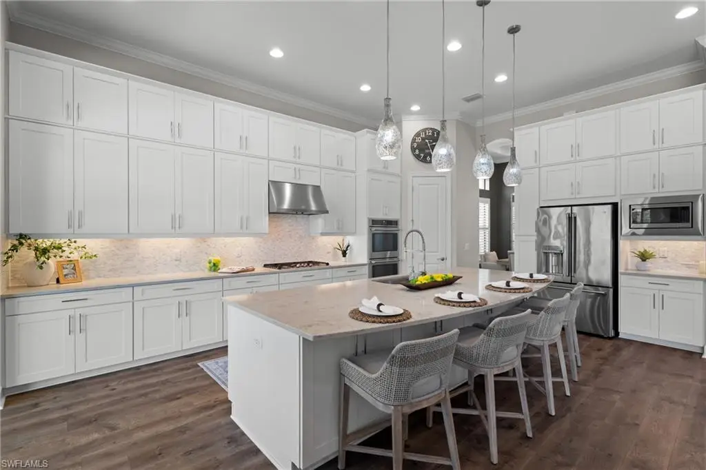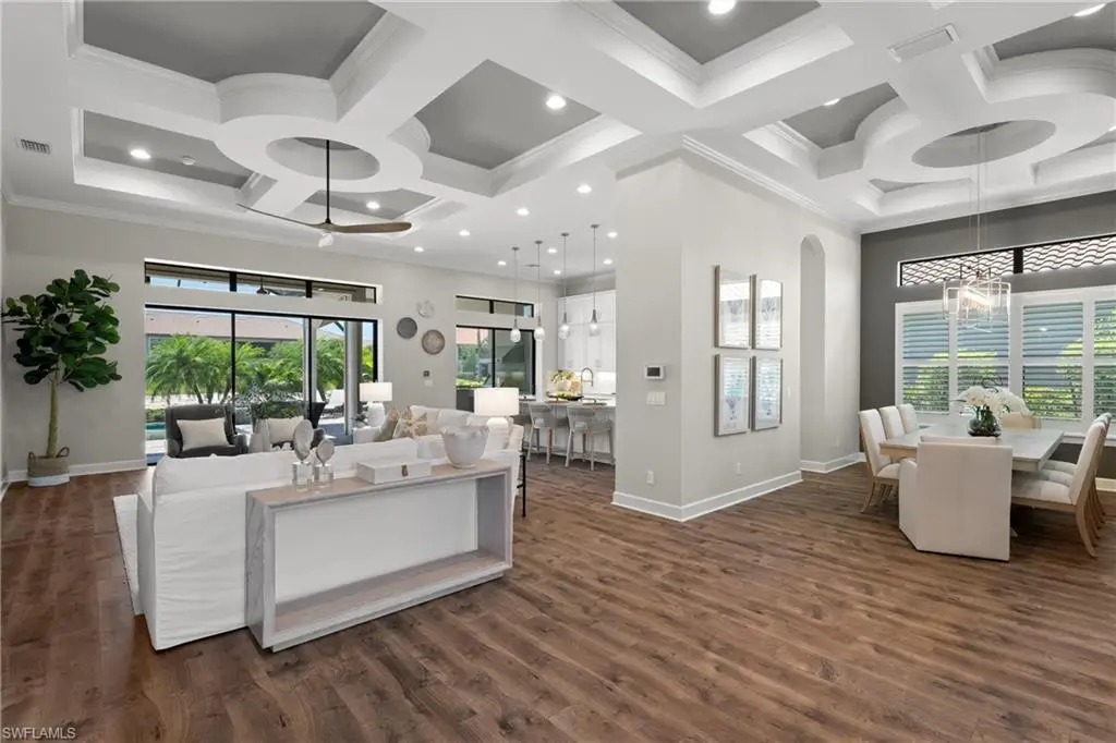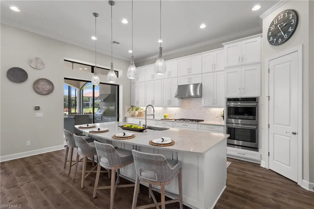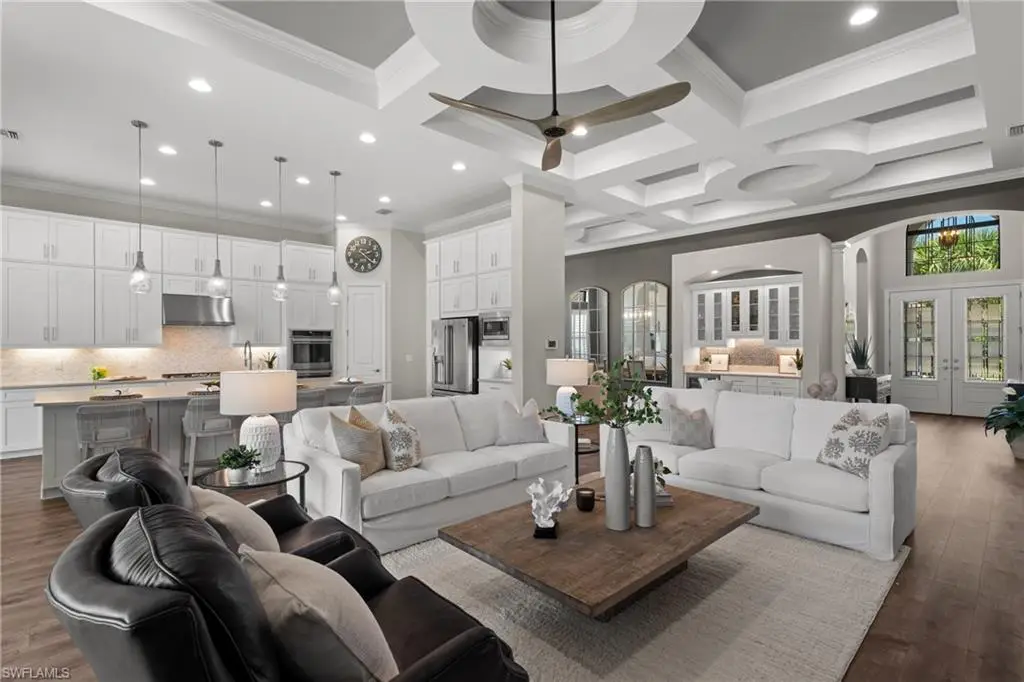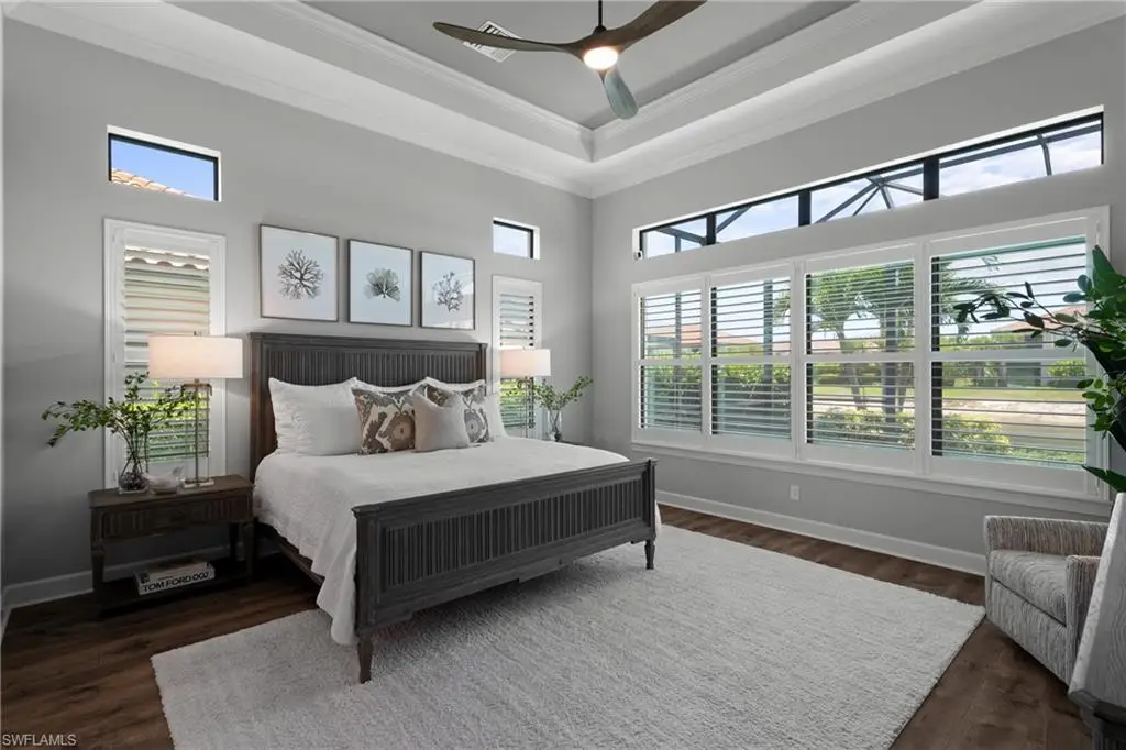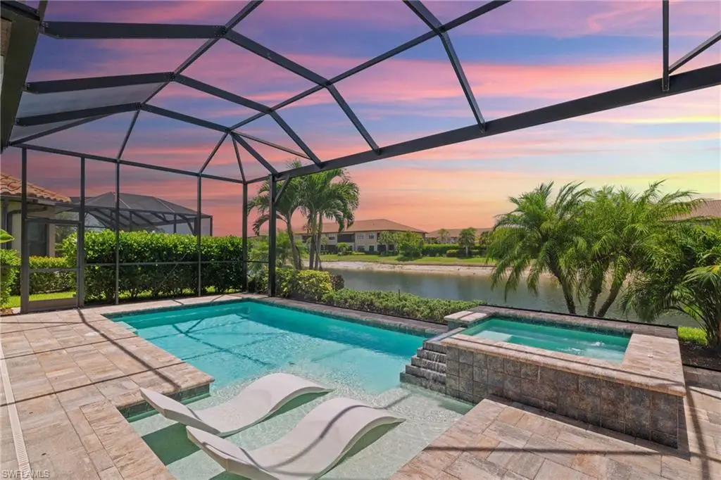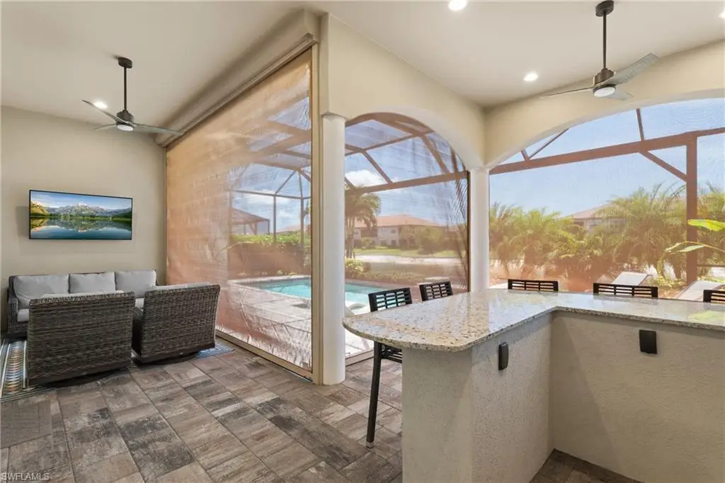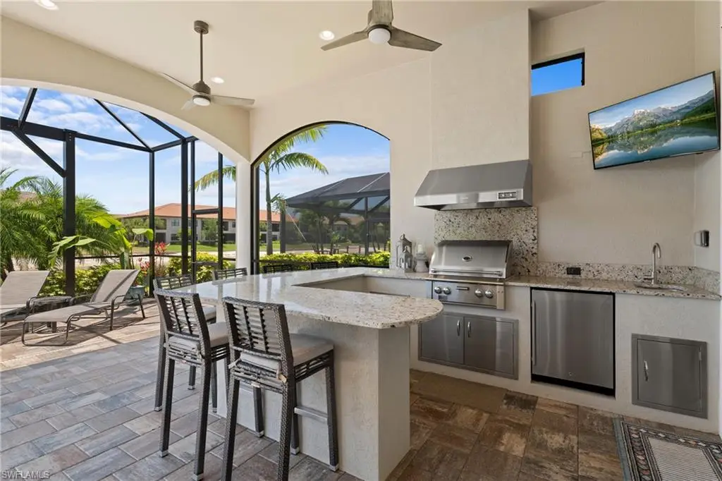 LIVE A VACATION LIFESTYLE IN ESPLANADE! FULL GOLF MEMBERSHIP INCLUDED! This immaculate ôFrancesco" (3 Bedrooms + Den, 3.5 Baths, 3 Car Garage) features nearly 2,900 sq ft of living space under air and has been lovingly cared for by its original owners. From the moment you enter the home through the double glass front doors, you are greeted with an open great room style floorplan with 12' ceilings throughout each room of the home with an abundance of windows & additional transom windows, wood floors throughout the common areas, den & bedrooms, impressive coffered style tray ceilings, and two sets of pocketing sliding glass doors to the extended lanai complete with outdoor kitchen & bar, GAS heated salt water pool/spa/sunshelf, and picture window screen cage overlooking the lake. The spacious kitchen lends itself to entertaining with an oversized island, shaker style cabinetry, quartz countertops, GE Cafe appliances including GAS cooktop & double wall ovens, abundance of cabinetry included 24-inch upper cabinets to complete the high end look. The den serves as a bonus living space and is outfitted with built-in cabinets including two twin murphy beds for overflow guests. You will be sure to catch sunsets 365 days a year from this home's west facing rear exposure overlooking the lake. For a peace of mind, this home features a mix of hurricane impact windows, motorized roll down hurricane shutters, and accordion hurricane shutters on all openings. A long list of special features include: ELECTRIC ROLL DOWN HURRICANE SCREENS/SHUTTERS on the lanai; custom outdoor kitchen and bar complete with grill, hood, sink, and refrigerator; upgraded climate controlled garage with finished floor & cabinetry; custom closet cabinetry & shelving throughout; dry bar with beverage cooler; plantation shutters; landscaping lighting; crown molding; and more! Esplanade Golf & Country Club of North Naples offers a true "Lifestyle Community" with world-class amenities, including a resort pool with cabanas and the popular "Bahama Bar," tennis, pickleball, bocce, a 14-mile network of bike/walking trails, and an 18-hole private golf course. The impressive 15,000 Sq Ft clubhouse features a restaurant, bar, wine-tasting room, wine lockers, and a Starbucks-style cafe. Best of all, the property's landscaping, irrigation, golf membership, and all community amenities are covered under a quarterly fee of just $3,434ùno additional fees or memberships required! Don't miss your opportunity to own this exceptional home in one of Naples' most sought-after communities. Schedule your tour of this stunning home and Esplanade Golf & Country Club today!