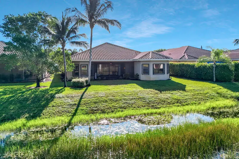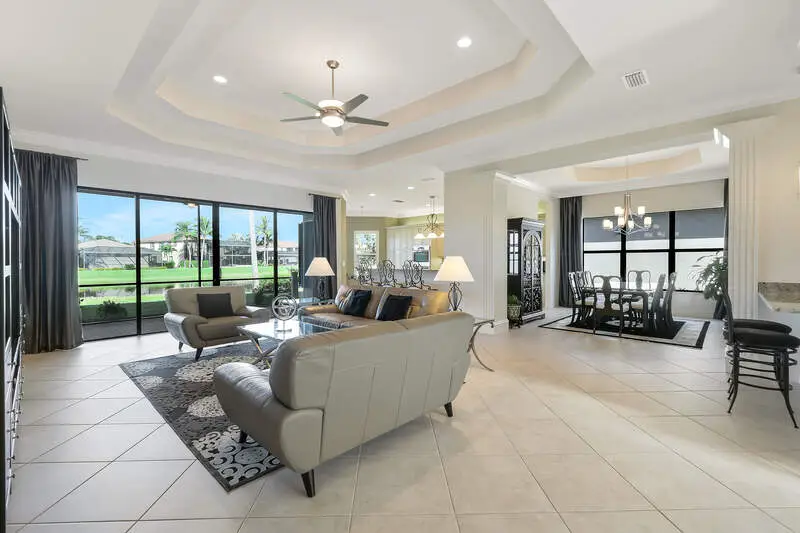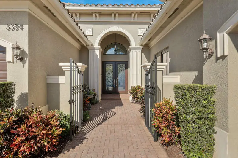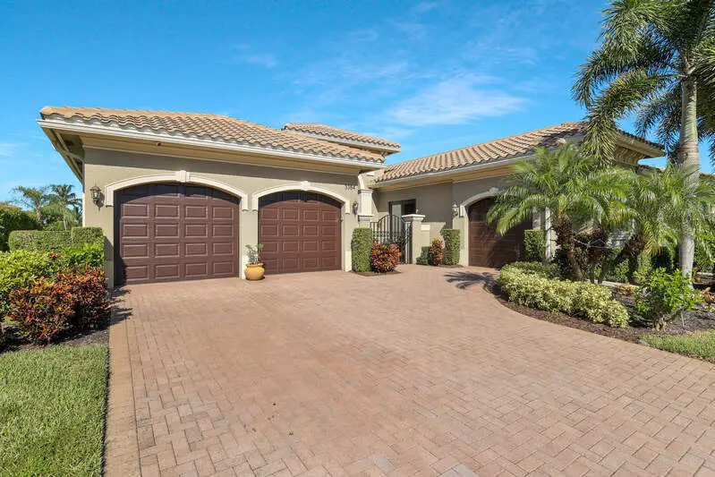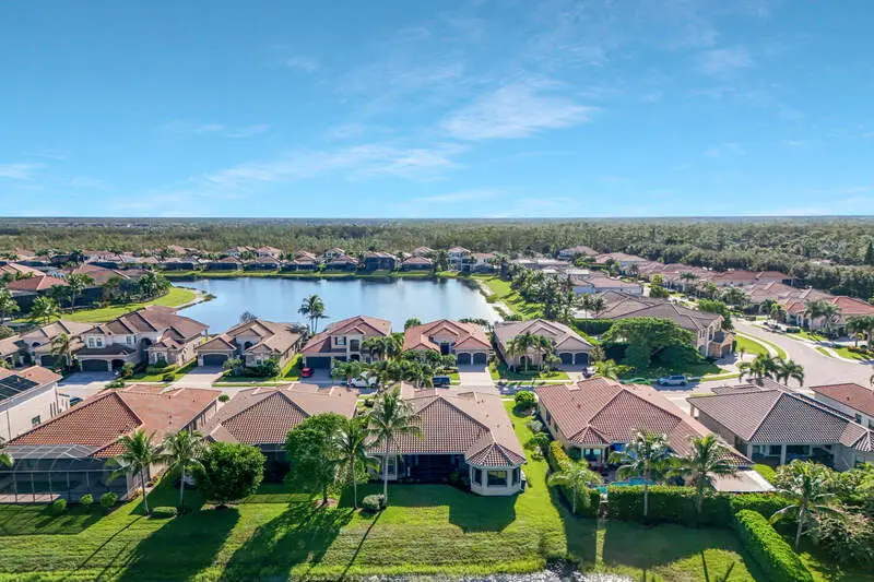 Sunsets over the lake and timeless elegance define this coveted 3,051 sq. ft. Carlyle, the most sought-after floor plan in Riverstone. Beyond the gated courtyard, double entry doors reveal an inviting layout designed for both easy everyday living and effortless entertaining. A spacious great room, formal dining room, wet bar with KitchenAid beverage fridge, and an adjacent custom wine storage rack for over 150 bottles make hosting unforgettable evenings a breeze. At the heart of the home, the gourmet kitchen features upgraded off-white shaker cabinetry, granite counters and backsplash, ambient lighting, and stainless-steel appliances including a double wall oven, vented hood over the cooktop, and a newer KitchenAid refrigerator-sure to inspire any culinary enthusiast. The versatile Club Room, finished with wood flooring and matching plantation shutters, is perfect as an office, den, or media retreat. The primary suite offers serene lake views, custom closets, and a spa-like bath with marble counters and decorative mirrors. Two private guest suites, each with a full bath and built-in closets, ensure comfort for family and friends. Thoughtful details include crown molding, wood-wrapped pillars, decorative mantlepiece, upgraded lighting fixtures and fans, and elegant window treatments. Everyday living is made easier with a finished laundry room offering a sink, ample cabinetry, folding counter, and a new (2024) LG washer and dryer. Peace of mind comes with a whole-home Generac generator powered by dual 120-gallon tanks, accordion shutters for quick storm prep, and an AC system with medical-grade UV lights and filters. The garage is equally functional with storage shelving and insulated doors. Expansive glass sliders flow seamlessly to the outdoors, where a west-facing lanai frames tranquil lake views and panoramic sunsets that fill the sky with vibrant color. The backyard offers abundant space to add a custom pool or design your own custom tropical oasis. Here, unforgettable gatherings, quiet moments, and golden sunsets become part of everyday life. Riverstone offers a vibrant, vacation-inspired lifestyle for all ages. Located in North Naples, just minutes from I-75 and zoned for "A"-rated schools, the community features a fitness center, social hall, resort-style pool, lap pool, spa, five lighted tennis courts, outdoor basketball and pickleball, a full indoor basketball court, tot lot, children's water play area, game room, and an activities coordinator; making it easy to meet new friends. Perfectly suited for entertaining, unwinding, or savoring the view, this home captures the essence of Naples living.