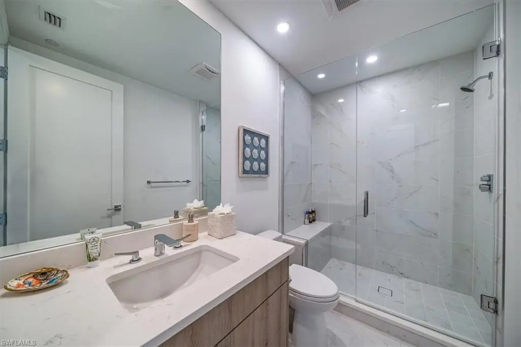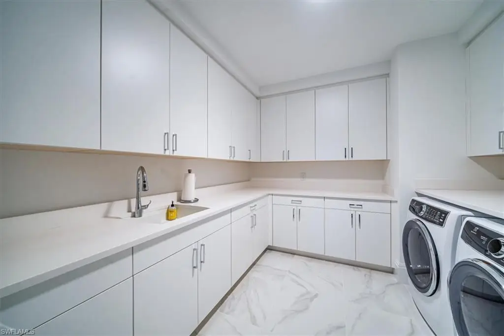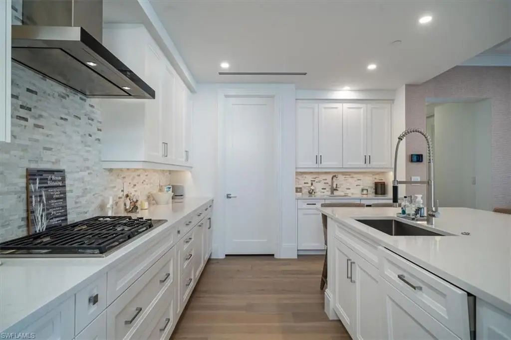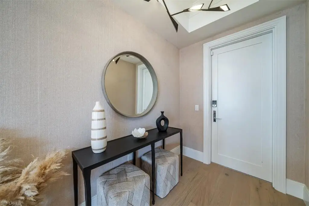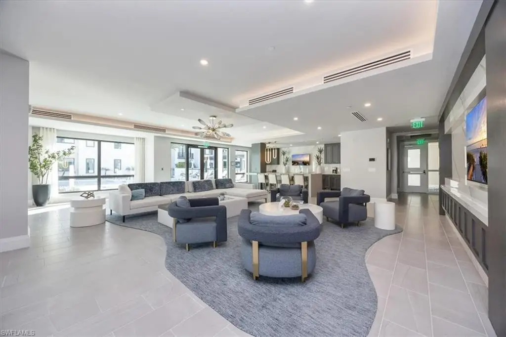 Welcome to residence 404 at Quattro, which showcases the elegant "Bianca" open floor plan, featuring 4 bedrooms, a den, and 4.5 baths. Rarely lived in, this residence is the largest available, offering 3,437 square feet of air-conditioned space, a 438-square-foot balcony, and soaring 10-foot ceilings. The expansive 36-foot balcony faces east, providing stunning views of the meticulously landscaped courtyard and resort-style pool. Furnished with custom high-end pieces and designer lighting curated by a New York interior designer, no detail has been overlooked. The home boasts rich wide-plank hardwood floors, impact-resistant doors and windows, and a chef's dream kitchen complete with a large quartz island, wet bar with wine cooler, and professional-grade Sub-Zero, Miele, and Wolf appliances, including natural gas cooking. Additional features include two deeded parking spaces in the gated garage, EV charging capabilities, and a climate-controlled storage unit. Quattro's amenities are second to none, with a heated pool and spa, fire pit, outdoor pavilion with gas grills, a state-of-the-art fitness center, and a stylish clubroom equipped with a bar, terrace, large-screen TV, and billiards room. Located in the heart of Naples' Design District, Quattro offers unparalleled access to Fifth Avenue South, Third Street South, and the pristine sugar-sand beaches. The vibrant Bayfront area with its restaurants and shops is just across the street, and the upcoming Gulfshore Playhouse is within walking distance. A masterpiece of British West Indies and Coastal Contemporary architecture, designed by the renowned MHK Architecture & Planning, Quattro is the crown jewel of Naples Square.
