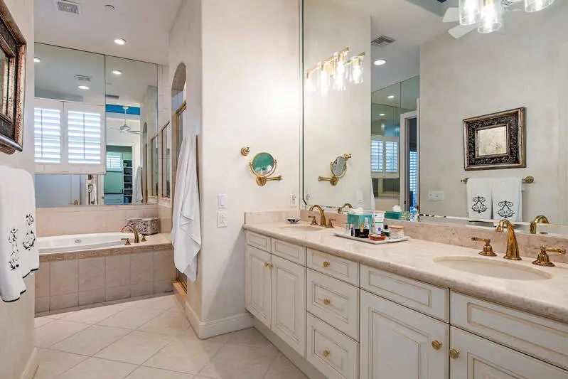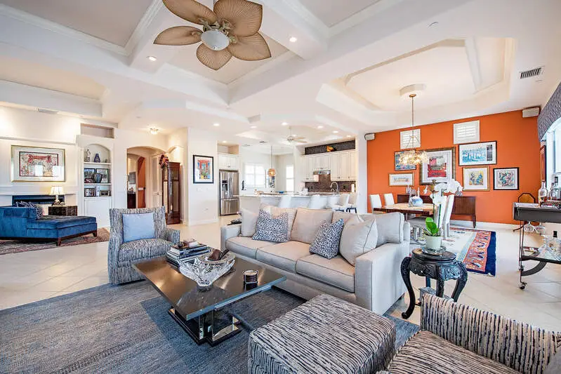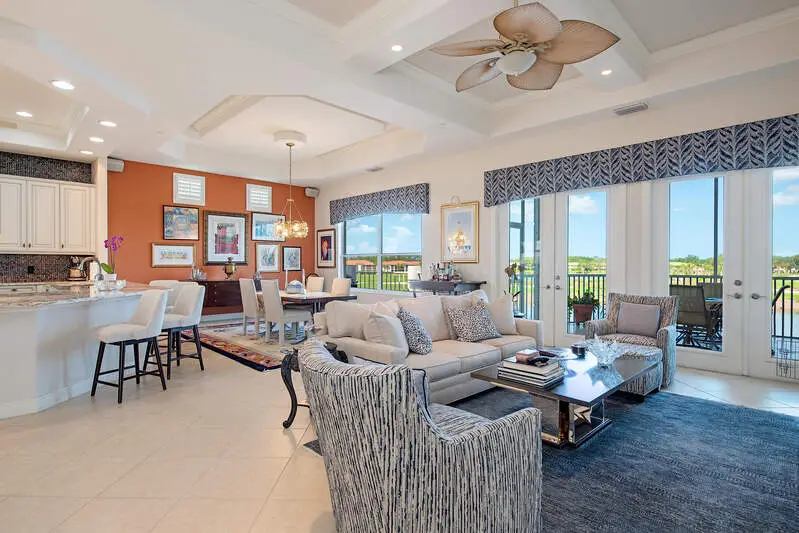 Some of Avellino's best views from this rarely available 3+den 3.5 BA penthouse with private elevator, affording panoramic golf, lake and sunset views! This contemporary showplace offers a stylish open kitchen renovated by the current owners, boasting new countertops (countertops all one level!), two-tone cabinetry, induction cooktop, added built-in pantry with pull-outs, new wine cooler, Instahot kitchen water, and BREATHTAKING views! Remote control storm shutters surround the lanai for your convenience, and all windows are impact glass for peace of mind and convenience, plus you'll enjoy remote control shades and plantation shutters inside. Views from the oversized tiled lanai are mesmerizing, drawing the eye to the golf course and lakes! You'll love the cozy see-through electric fireplace between the great room and den/office with wood floor. Each bedroom has an en suite bath, and the primary bedroom with French doors to the lanai is nicely separated, featuring a welcoming spa-like bath with separate jetted tub and walk-in shower, and a HUGE walk-in closet with elegant custom built-ins. One AC system was installed in 2017 and the other in 2022; water heater was installed in 2022. Crown molding draws the eye to the high ceilings with decorative detail, only afforded in the penthouse and adding to the spacious feel! Condo has never been rented and exudes pride of ownership! Note the extra air-conditioned storage closet off the ground floor foyer. Avellino Isles sports new roofs, new gutters/downspouts, and new exterior painting and lighting, all completed in 2024. This showplace is a very short walk to the recently-renovated Avellino Isles clubhouse with Jr. Olympic pool/spa, large fitness center, BBQ grills and tiki hut, and numerous activities designed to help you meet neighbors!