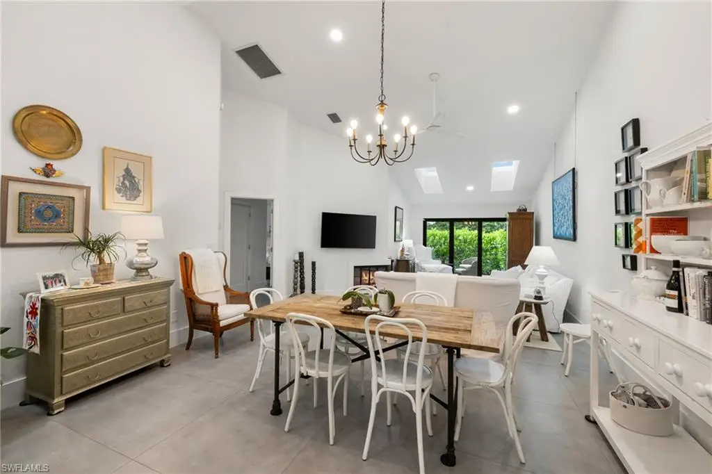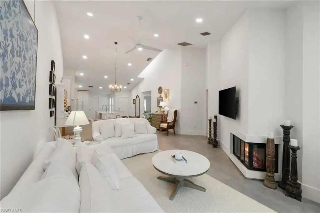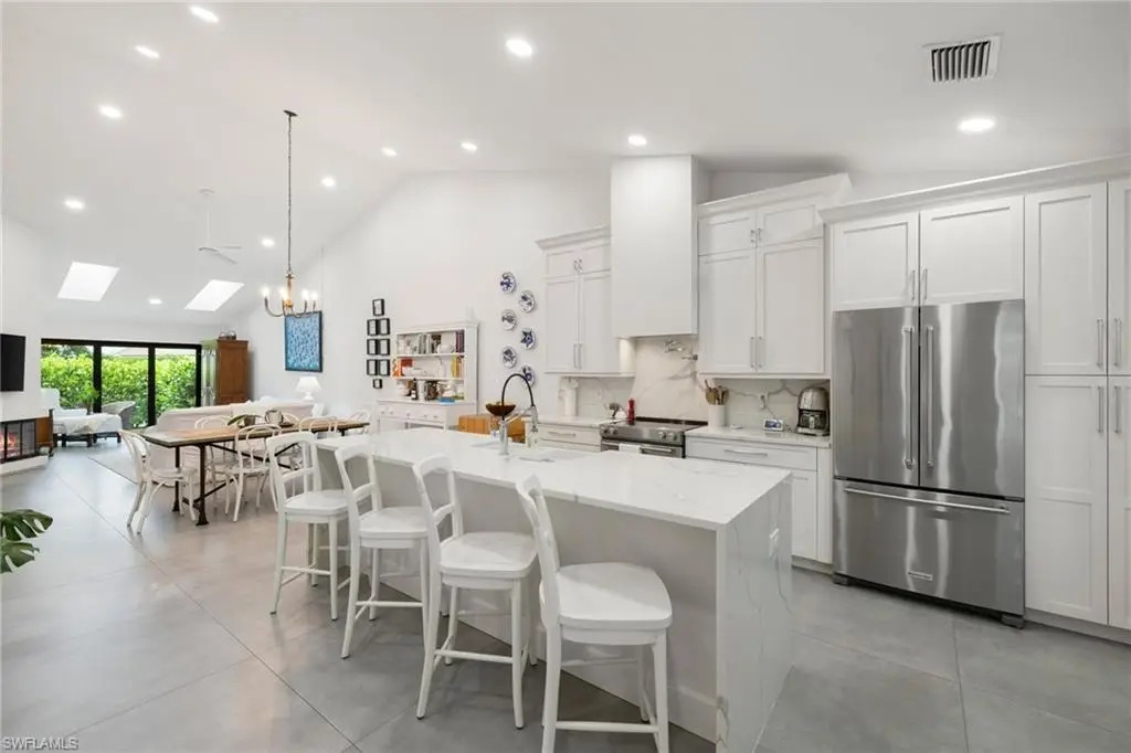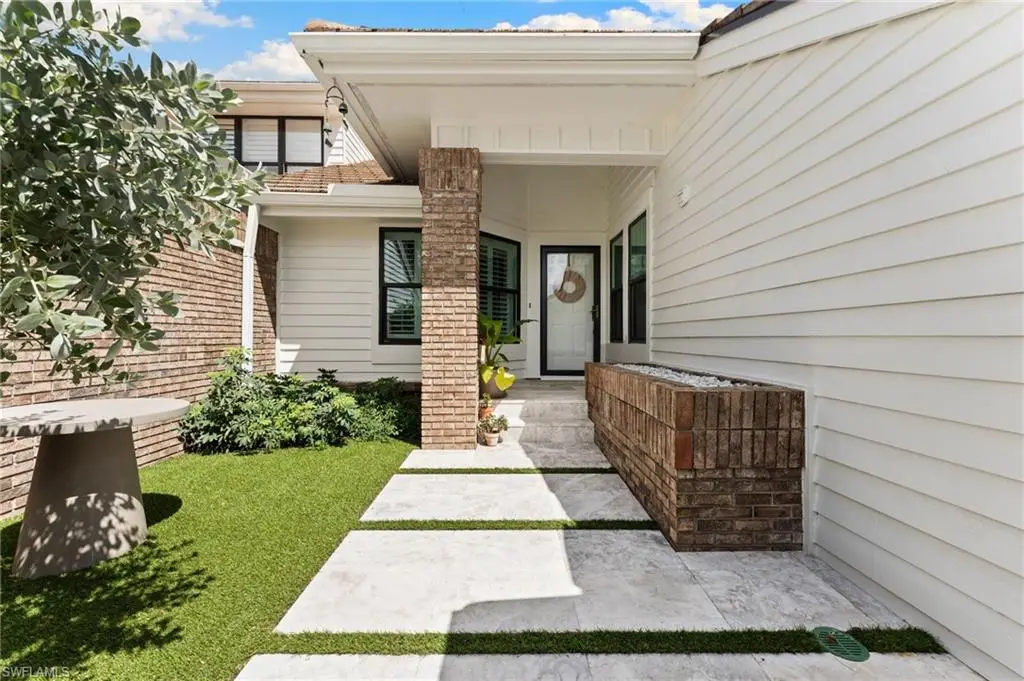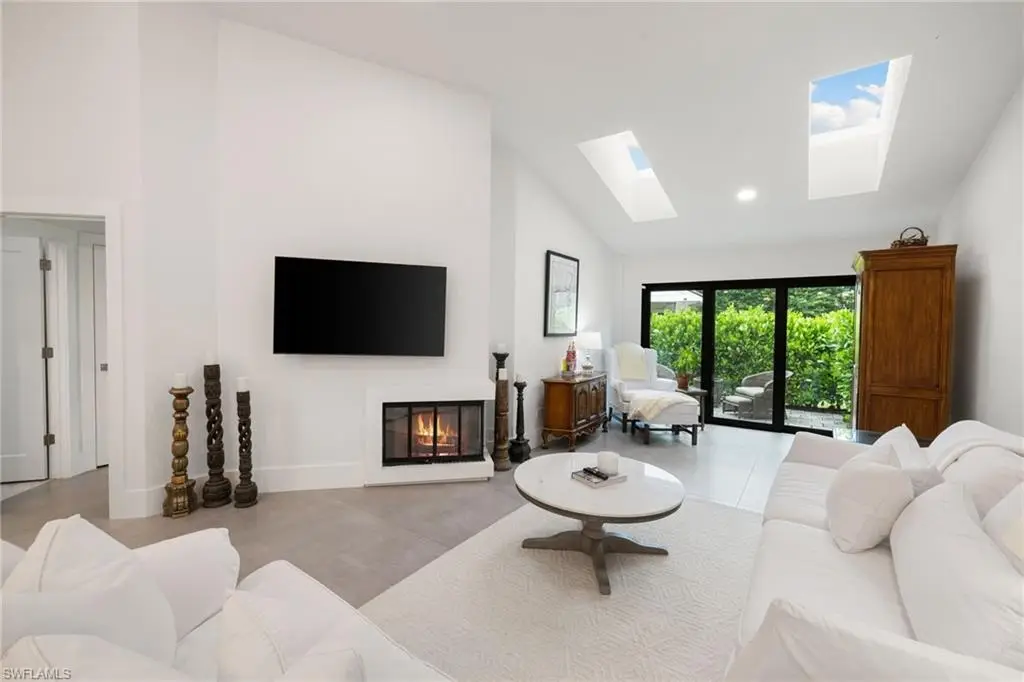 This elegantly remodeled villa is ideally located in the highly sought-after and rarely available Villas of Park Shore, a stone's throw from the beach. Thoughtfully renovated from top to bottom, this residence offers modern luxury with every detail carefully curated. The eye-catching kitchen features custom cabinets, high-end stainless steel appliances, a seamless continuation of the countertop to the backsplash, a large island, chic hardware, and a convenient pot filler. The open-concept floor plan flows effortlessly into the bright, airy living area, where a cozy fireplace and abundant natural light from skylights and vaulted ceilings create a warm ambiance. The remodeled primary ensuite wet bath is a spa-inspired escape with a freestanding soaking tub, a separate shower, and premium finishes for ultimate relaxation. The beautifully remodeled laundry room adds both style and functionality. The gated custom courtyard and pavered lanai, surrounded by privacy hedges, offer serene retreats for outdoor living in both the front and back of the home. In addition to the stunning design, essential upgrades include hurricane impact windows, a tankless water heater, an A/C replacement (2019), and updated plumbing and electrical systems in 2019. The new flooring throughout, remodeled guest bath, and freshly painted exterior in 2024 complete this exceptional property. Enjoy community amenities, including a clubhouse, pool, and gym, and embrace the ideal Park Shore location, just minutes from sun-soaked Gulf beaches and the vibrant dining and entertainment options at Venetian Village. You can join the Park Shore Association for an additional fee, granting exclusive beach access, parking, a scenic walking trail, and a BBQ area. DonÆt miss this rare opportunity to own a residence that combines timeless elegance, prime location, and modern comfort in the heart of Park Shore, with every amenity at your fingertips.