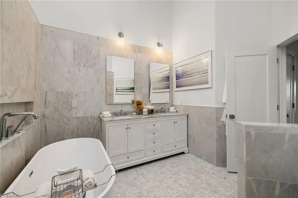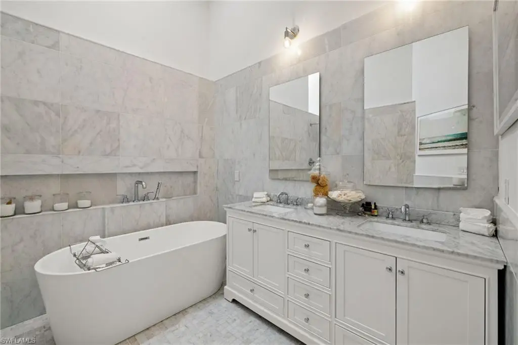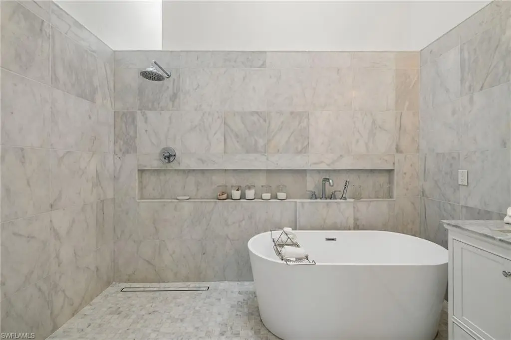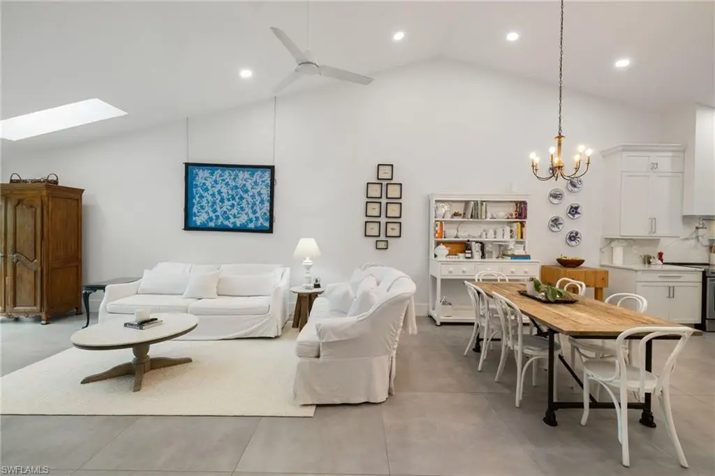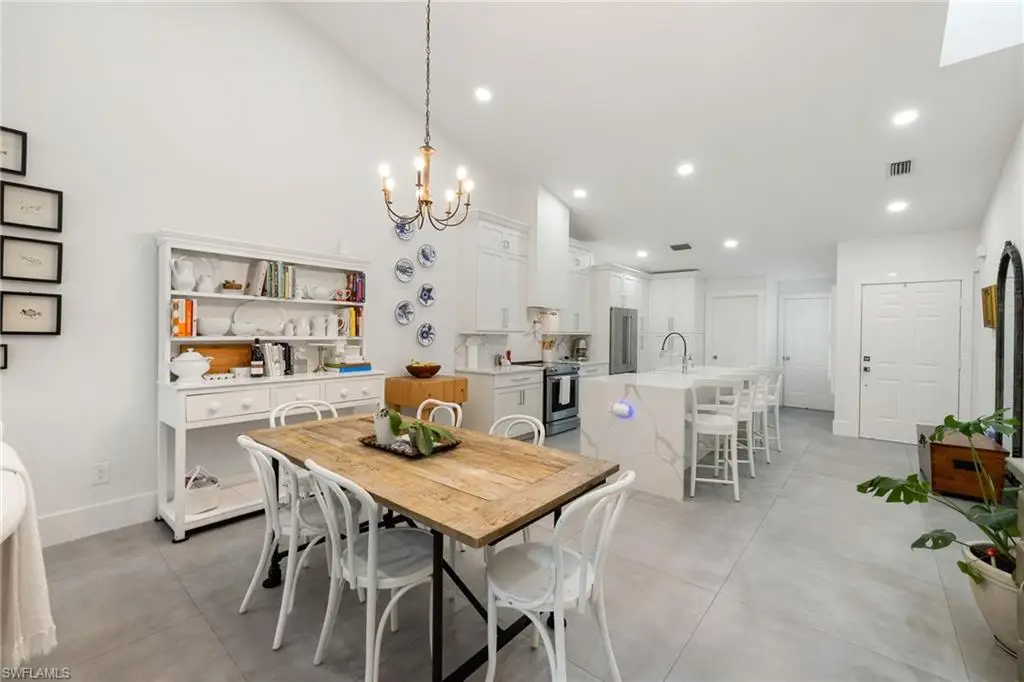 This elegantly remodeled villa is ideally located in the highly sought-after and rarely available Villas of Park Shore, a stone's throw from the beach. Thoughtfully renovated from top to bottom, this residence offers modern luxury with every detail carefully curated. The eye-catching kitchen features custom cabinets, high-end stainless steel appliances, a seamless continuation of the countertop to the backsplash, a large island, chic hardware, and a convenient pot filler. The open-concept floor plan flows effortlessly into the bright, airy living area, where a cozy fireplace and abundant natural light from skylights and vaulted ceilings create a warm ambiance. The remodeled primary ensuite wet bath is a spa-inspired escape with a freestanding soaking tub, a separate shower, and premium finishes for ultimate relaxation. The beautifully remodeled laundry room adds both style and functionality. The gated custom courtyard and pavered lanai, surrounded by privacy hedges, offer serene retreats for outdoor living in both the front and back of the home. In addition to the stunning design, essential upgrades include hurricane impact windows, a tankless water heater, an A/C replacement (2019), and updated plumbing and electrical systems in 2019. The new flooring throughout, remodeled guest bath, and freshly painted exterior in 2024 complete this exceptional property. Enjoy community amenities, including a clubhouse, pool, and gym, and embrace the ideal Park Shore location, just minutes from sun-soaked Gulf beaches and the vibrant dining and entertainment options at Venetian Village. You can join the Park Shore Association for an additional fee, granting exclusive beach access, parking, a scenic walking trail, and a BBQ area. DonÆt miss this rare opportunity to own a residence that combines timeless elegance, prime location, and modern comfort in the heart of Park Shore, with every amenity at your fingertips.