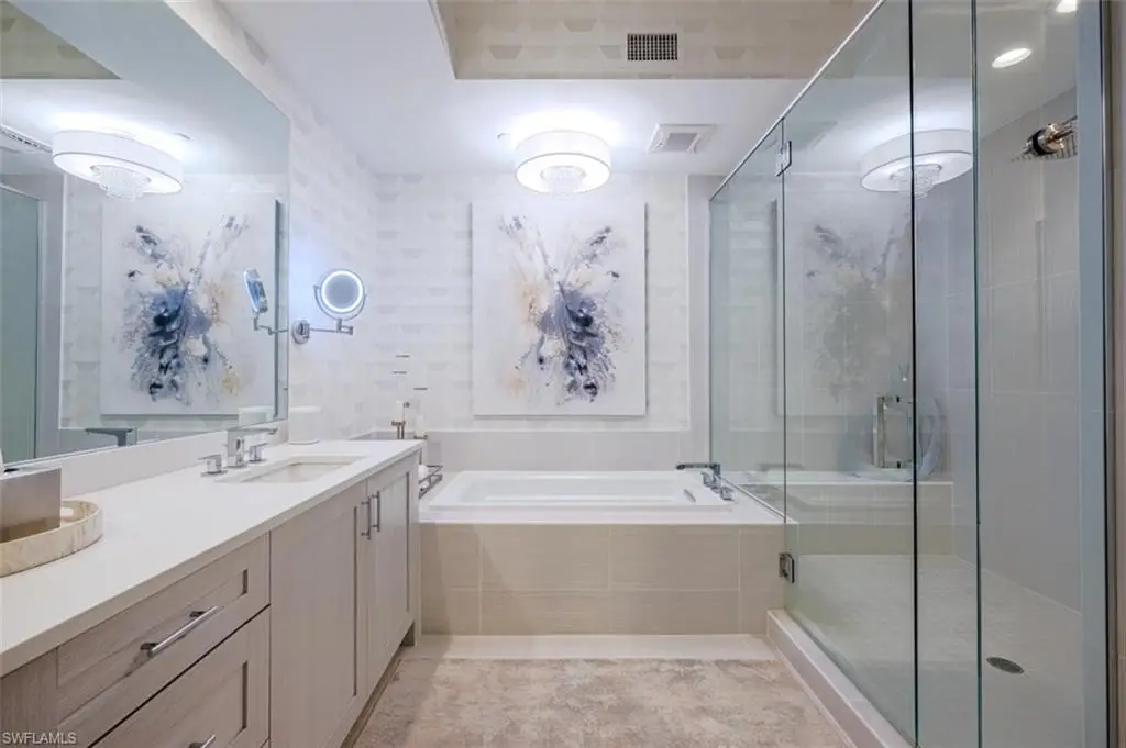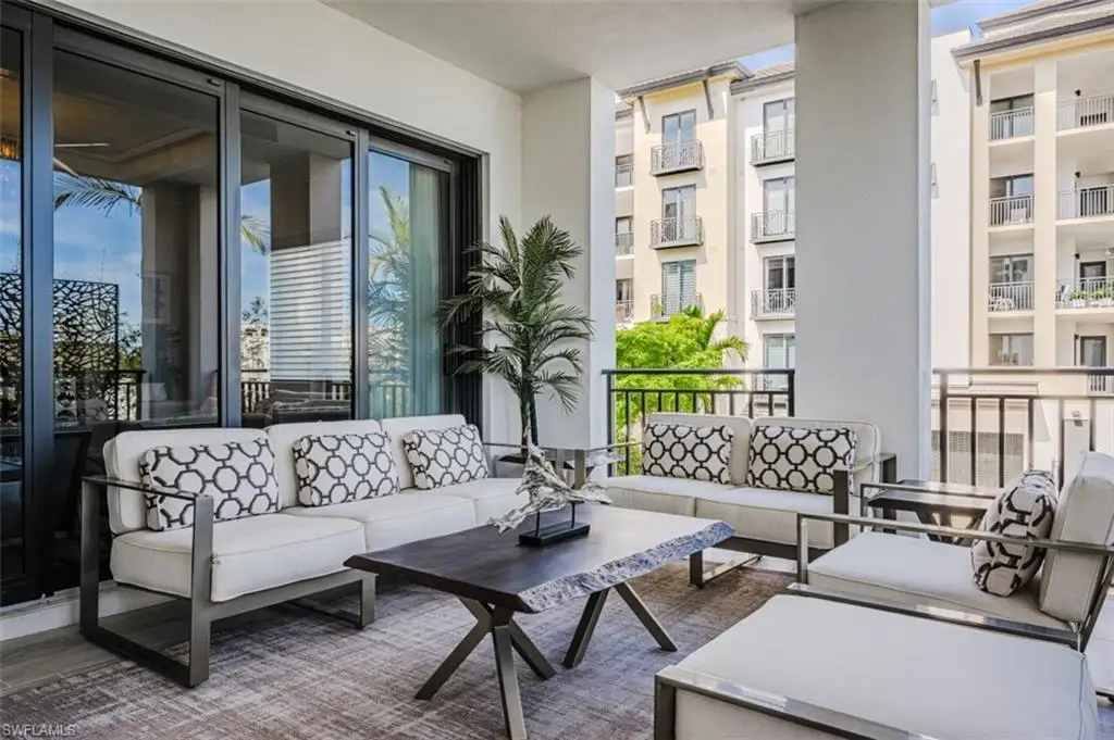 Experience Elevated Living in the Heart of Naples. Step into nearly 2,500 square feet of refined elegance in this stunning former model residence, located in the prestigious Naples Square community. This expansive 3-bedroom + den, 3-bathroom condominium perfectly blends contemporary design with luxurious comfort. Crafted for those with discerning taste, the residence showcases exceptional finishes throughout - motorized Hunter Douglas blinds, custom designer lighting, and a chef's kitchen that's as functional as it is beautiful. Outfitted with premium appliances including Wolf, Sub-Zero, Bosch, and Zephyr, the kitchen features a spacious quartz island, induction cooktop, smart wall oven, and a striking marble backsplash, making it a true culinary showpiece. The open-concept layout effortlessly connects the kitchen, dining, and great room, creating a spacious and inviting atmosphere ideal for entertaining or everyday living. Oversized sliding glass doors lead to a generous terrace with expansive views, creating a seamless transition between indoor and outdoor living. Sophisticated fixtures and modern design elements add warmth and depth throughout the home, while the building itself offers a suite of world-class amenities. Enjoy the resort-style pool and spa, outdoor grilling area, a state-of-the-art fitness center, and an elegant club room with billiards and large-screen TVs. Additional features include one reserved parking space in the secure, lower-level garage, an additional unassigned space, a humidity-controlled storage locker, and covered bike storage. Pet lovers will appreciate the community's welcoming pet policy. Located just steps from the boutiques and fine dining of Olde Naples, the newly built Gulfshore Playhouse, Bayfront, and Baker Park, this residence offers the ultimate in walkable luxury living. Moments from the sugar-sand beaches, this home invites you to embrace the very best of the Naples lifestyle.