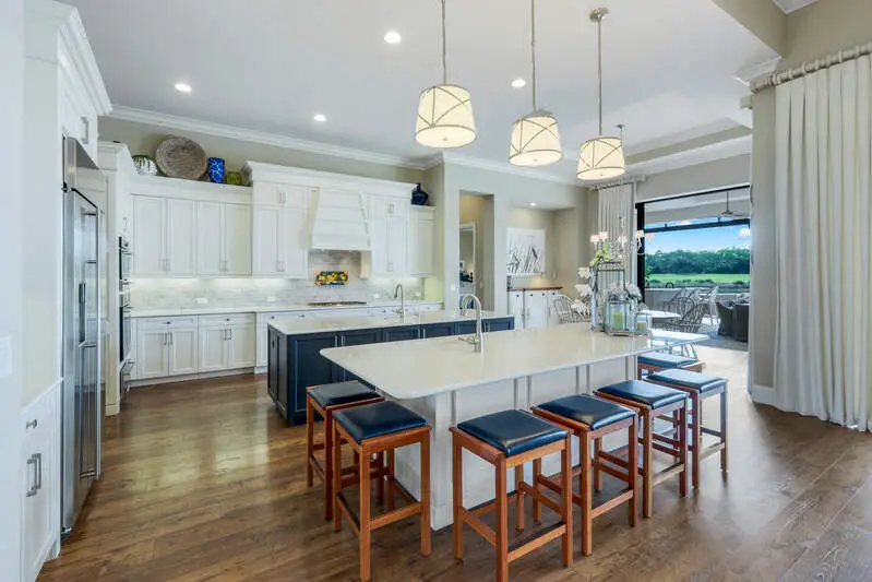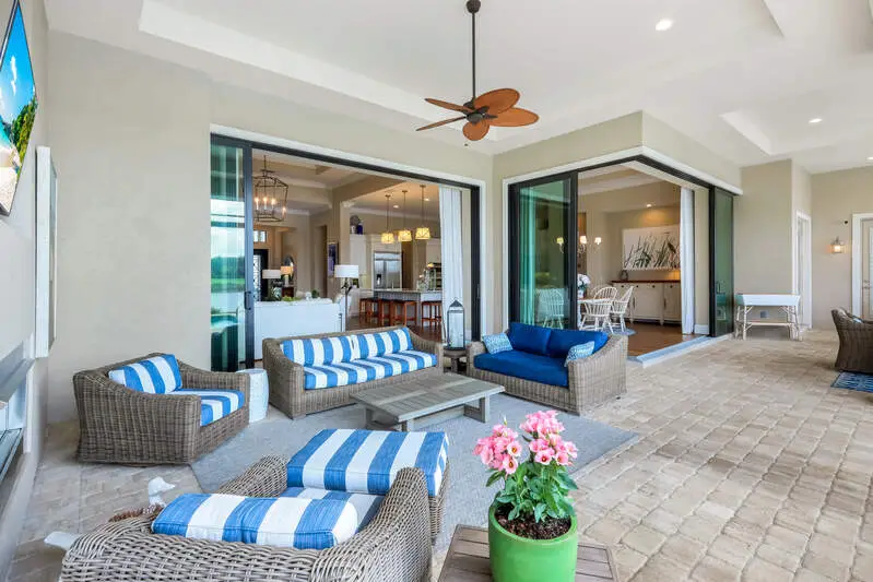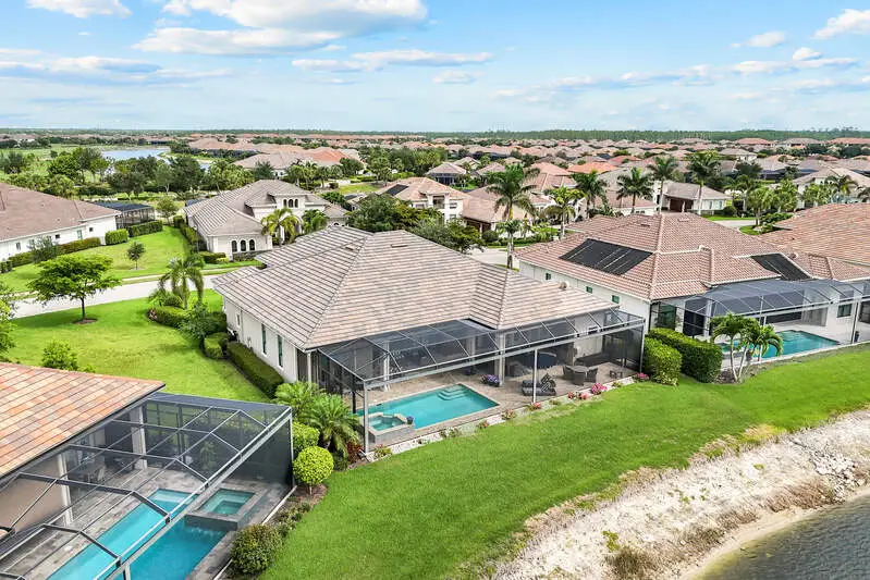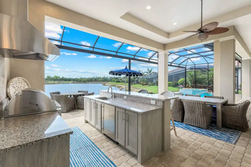 A rare opportunity awaits on Esplanade's most private enclave of custom estates. FULL GOLF MEMBERSHIP INCLUDED. This exquisite Glenmore floor plan custom built by STOCK Development is ideally situated on a quiet, coveted street, offering an unmatched blend of privacy, sophistication, and panoramic views of the lake, golf course, and natural preserve. From the moment you enter, you'll be captivated by the elegant finishes and breathtaking scenery that frame every window, a perfect harmony of resort-style luxury and timeless design. Thoughtfully designed for both everyday living and grand entertaining, this 4-bedroom plus den, 4.5-bathroom home welcomes you with an expansive open layout and seamless indoor-outdoor flow. The heart of the home is a designer chef's kitchen featuring TWO, 9-foot islands and one that comfortably seats eight, GE Monogram appliances, custom cabinetry with under-cabinet lighting, and a Dual Zoned Wine and Beverage Refrigerator. The adjacent living and dining spaces are adorned with custom millwork, tray and coffered ceilings, elegant light fixtures, plantation shutters, crown molding and custom drapery, all adding layers of warmth and sophistication. The luxurious primary suite offers a serene escape with dual walk-in closets, a cozy reading nook, and a spa-like bathroom complete with a freestanding soaking tub, oversized walk-in shower, double vanities, and a dedicated makeup area. Each guest bedroom enjoys its own private en-suite bath, providing comfort and privacy for family and friends alike. Step outside and experience true resort living on your private lanai, where brick paver flooring extends to an inviting outdoor fireplace and TV lounge, a full summer kitchen with bar seating, an outdoor shower, and a spectacular saltwater pool and spa with spillover feature, all under cover and protected by Storm Smart motorized screens. The home is further enhanced by a whole-house generator, impact-rated windows and doors, a full-home water filtration and reverse osmosis system, and an air-conditioned three-car garage with built-in storage. Located within Naples' premier bundled golf community, Esplanade offers an unmatched lifestyle including an 18-hole private golf course, resort pool with cabana bar, full-service spa, tennis, pickleball, bocce, state-of-the-art fitness center, and 11 miles of walking and biking trails. The 54,000-square-foot clubhouse features fine dining, wine lockers, and a calendar full of social events and activities. This is more than a home, it's a private sanctuary where luxury, lifestyle, and location come together in perfect harmony. ALL THE GOLF, TENNIS, FITNESS, PICKLE BALL AND LIFESTLYE AMENITES ARE INCLUDED WITH THE PURCHASE OF THIS HOME.