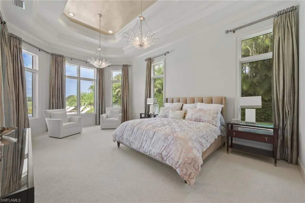 Exquisitely designed with soaring, coffered ceilings as you enter the double, glass paned front doors to the beautiful foyer offering stunning views of the craftsmanship details to the fabulous exterior views overlooking your lanai, pool/spa and to the golf course and lake beyond. Inside, you will be immersed in luxury as you enjoy a gas fireplace flanking the formal living room to the fabulous kitchen detailed with an abundance of workspace, island, and Wolf appliances and overlooking the breakfast nook and family room with zero corner sliders leading to the fantastic lanai. There, you will appreciate the built in outdoor kitchen, seating area and the lovely, coffered ceiling. The pool/spa and gas fire pit are open for wonderful starry nights and fabulous entertaining. With 4 bedrooms, all ensuite, den and media room, you and your family and guests will appreciate the privacy of personal spaces and the 3-car garage with a portico allows plenty of spaces for your treasured vehicles.
