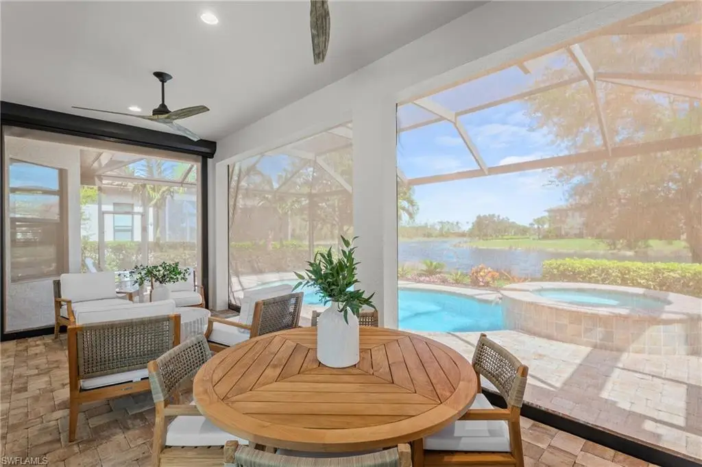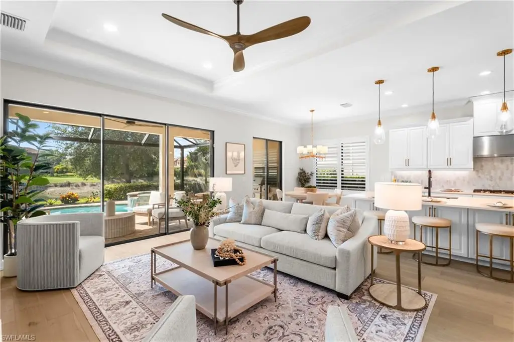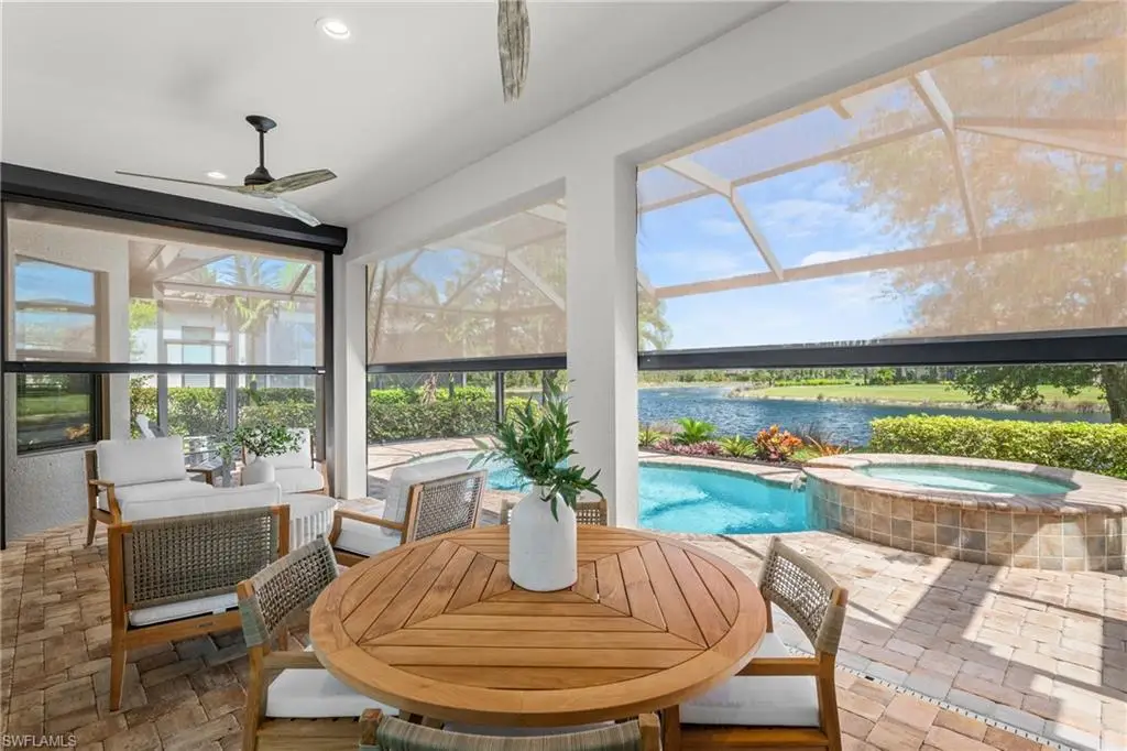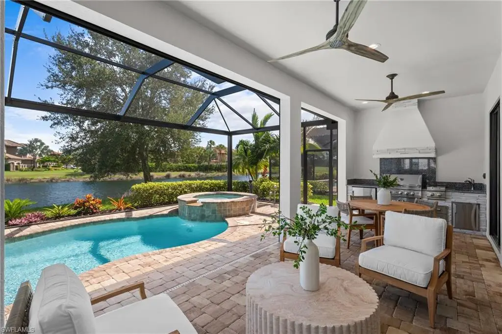 FULL GOLF MEMBERSHIP INCLUDED! Live a vacation lifestyle in Esplanade G&CC! This immaculate and totally remodeled ôFarneseö floorplan (2 Bedrooms plus den, 2.5 Baths) home is situated on a quiet cul-de-sac street within walking distance of the amenity campus of Esplanade Golf & Country Club of Naples. This home underwent a significant renovation and remodel in early 2025 which includes $200k in BRAND NEW updates which include: air conditioner with wifi thermostat; StormSmart motorized roll down hurricane screens on the lanai openings; KitchenAid appliances including GAS cooktop, wall oven, convection microwave, and french door refrigerator; Maytag washer/dryer; European white oak wood floors throughout; custom closet built-in shelving/cabinets throughout all closets & pantry; plantation shutters on all windows; Hanstone quartz countertops throughout; marble tile backsplash; hurricane impact glass front door & sidelight; freshly painted interior & exterior; refinished pool/spa interior; salt water pool/spa system; bathroom sink/shower fixtures including new toilets; frameless shower enclosure; upgraded door hardware; recessed lighting & high end light fixtures throughout; whole house Kinetico water softener/filtration system; finished eopxy garage floor; lush landscaping; and more! From the moment you walk in the door, you are greeted with a light and bright great room style floorplan that is flooded with natural light throughout the day from this homes abundance of windows and two sliding glass doors to the lanai. Enjoy al fresco dining and entertaining on the lanai complete with outdoor kitchen, and a salt water GAS heated pool with raised spa & sunshelf all enclosed by an updated screen cage with picture windows on all three sides (2019). Tastefully designed with light neutral colors, elegant lighting fixtures & chandeliers, and all the brand new furniture/decor is available to be purchased with the home. Esplanade Golf & Country Club of North Naples offers a true ôLifestyle Communityö with world-class amenities, including a resort pool with cabanas and the popular ôBahama Bar,ö tennis, pickleball, bocce, a 14-mile network of bike/walking trails, and an 18-hole private golf course. The impressive 15,000 Sq Ft clubhouse features a restaurant, bar, wine-tasting room, wine lockers, and a Starbucks-style cafT. Best of all, the propertyÆs landscaping, irrigation, golf membership, and all community amenities are covered under a quarterly fee of just $3,412ùno additional fees or memberships required! Don't miss your opportunity to own this exceptional home in one of NaplesÆ most sought-after communities. Schedule your tour of this stunning home and Esplanade Golf & Country Club today! NON FLOOD ZONE/NO FLOOD INSURANCE REQUIRED/ZONE X!