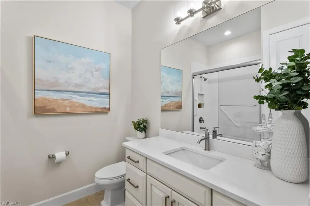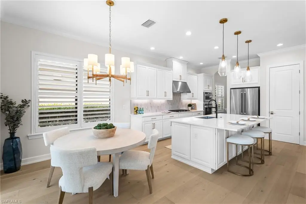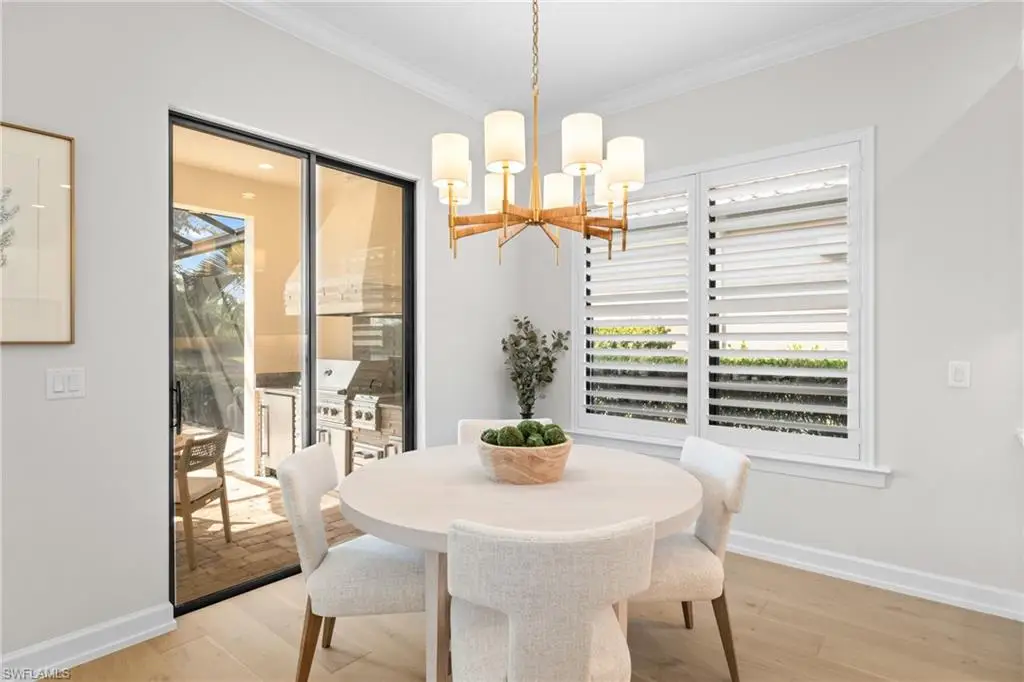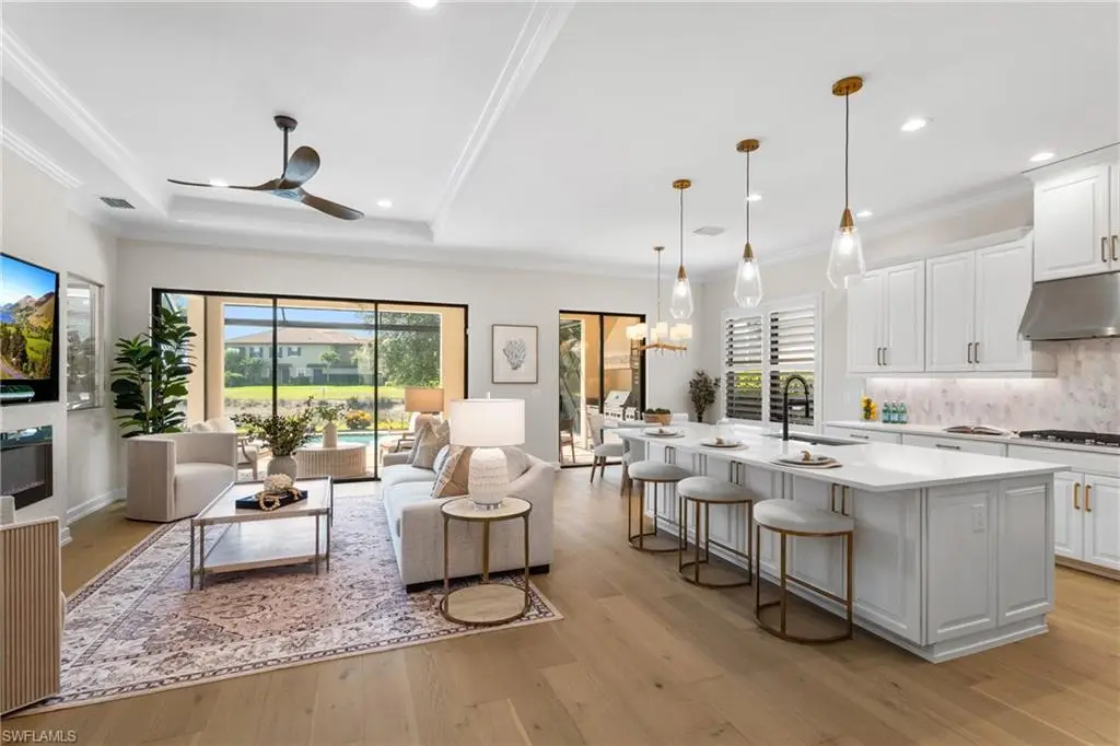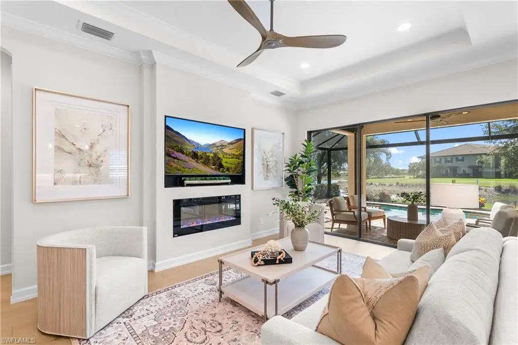 FULL GOLF MEMBERSHIP INCLUDED! Live a vacation lifestyle in Esplanade G&CC! This immaculate and totally remodeled ôFarneseö floorplan (2 Bedrooms plus den, 2.5 Baths) home is situated on a quiet cul-de-sac street within walking distance of the amenity campus of Esplanade Golf & Country Club of Naples. This home underwent a significant renovation and remodel in early 2025 which includes $200k in BRAND NEW updates which include: air conditioner with wifi thermostat; StormSmart motorized roll down hurricane screens on the lanai openings; KitchenAid appliances including GAS cooktop, wall oven, convection microwave, and french door refrigerator; Maytag washer/dryer; European white oak wood floors throughout; custom closet built-in shelving/cabinets throughout all closets & pantry; plantation shutters on all windows; Hanstone quartz countertops throughout; marble tile backsplash; hurricane impact glass front door & sidelight; freshly painted interior & exterior; refinished pool/spa interior; salt water pool/spa system; bathroom sink/shower fixtures including new toilets; frameless shower enclosure; upgraded door hardware; recessed lighting & high end light fixtures throughout; whole house Kinetico water softener/filtration system; finished eopxy garage floor; lush landscaping; and more! From the moment you walk in the door, you are greeted with a light and bright great room style floorplan that is flooded with natural light throughout the day from this homes abundance of windows and two sliding glass doors to the lanai. Enjoy al fresco dining and entertaining on the lanai complete with outdoor kitchen, and a salt water GAS heated pool with raised spa & sunshelf all enclosed by an updated screen cage with picture windows on all three sides (2019). Tastefully designed with light neutral colors, elegant lighting fixtures & chandeliers, and all the brand new furniture/decor is available to be purchased with the home. Esplanade Golf & Country Club of North Naples offers a true ôLifestyle Communityö with world-class amenities, including a resort pool with cabanas and the popular ôBahama Bar,ö tennis, pickleball, bocce, a 14-mile network of bike/walking trails, and an 18-hole private golf course. The impressive 15,000 Sq Ft clubhouse features a restaurant, bar, wine-tasting room, wine lockers, and a Starbucks-style cafT. Best of all, the propertyÆs landscaping, irrigation, golf membership, and all community amenities are covered under a quarterly fee of just $3,412ùno additional fees or memberships required! Don't miss your opportunity to own this exceptional home in one of NaplesÆ most sought-after communities. Schedule your tour of this stunning home and Esplanade Golf & Country Club today! NON FLOOD ZONE/NO FLOOD INSURANCE REQUIRED/ZONE X!