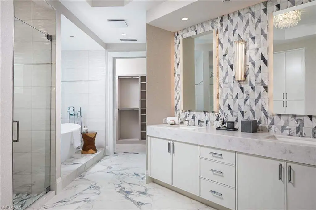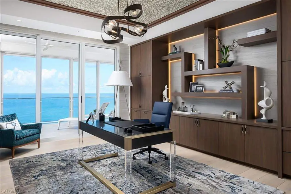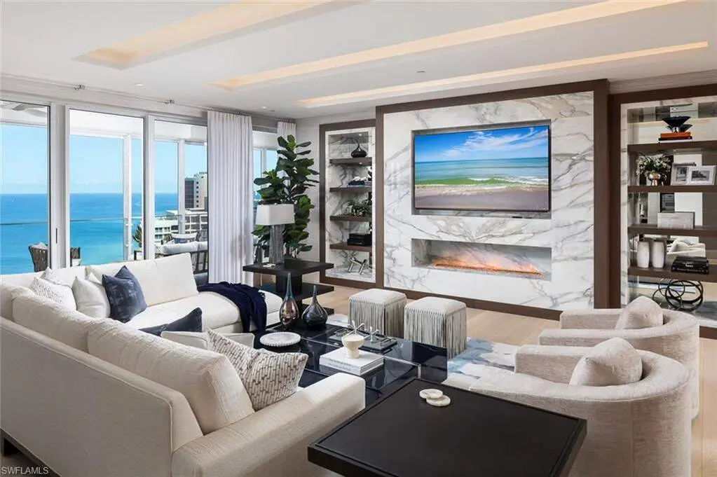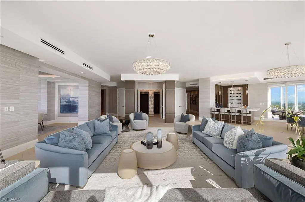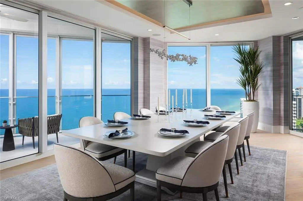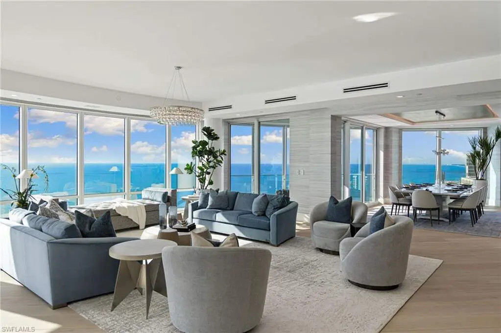 Since inception, residences at The Regent have been synonymous with luxury, yet no other offering has exhibited such quality, efficiency, and superior design as this. The "no expense spared" remastering of this gulf-front penthouse was a collaboration of the locally favored Borelli Construction and Calusa Bay Design, and personifies a sleek yet comfortable elegance that is rarely achieved. Encompassing over 12,100-plus square feet of living space, the residence includes multiple spacious living areas, an entertainment bar, five bedrooms, one of which hosts a kitchenette and is ideal for extended guests / live-in aide, five full and two half bathrooms, a richly outfitted study and private bar, a theater room, a club room equipped with a private fitness studio, nearly 1,700 square feet of outdoor terraces, as well as a rarely-found three-car garage. The truly gourmet kitchen was designed by renowned Mick DeGiulio and hosts fumed-eucalyptus custom cabinetry, brand-new top-tier gas appliances, a Galley sink, and precious stone countertops. Tucked away and offering the utmost in privacy, the master retreat exceeds the standards of luxury with its scenic sugar sand vistas, ample space for relaxation, as well as its truly luxurious His / Her bathrooms and dressing rooms. While it is impossible to name every enhancement in this comprehensive renovation, a few notable features include white oak flooring, a water-vapor fireplace, as well as luxurious wall coverings, and custom millwork throughout. Life at the Regent is a testament to refined living, as residents benefit from being only steps to the calm, turquoise waters of the Gulf of Mexico and Venetian Village, as well as only a mere few minutes from Waterside Shoppes and all that Downtown Naples has to offer.
