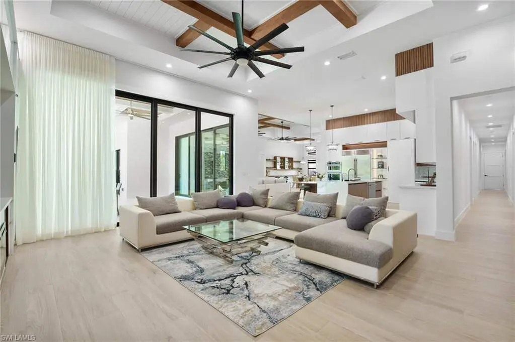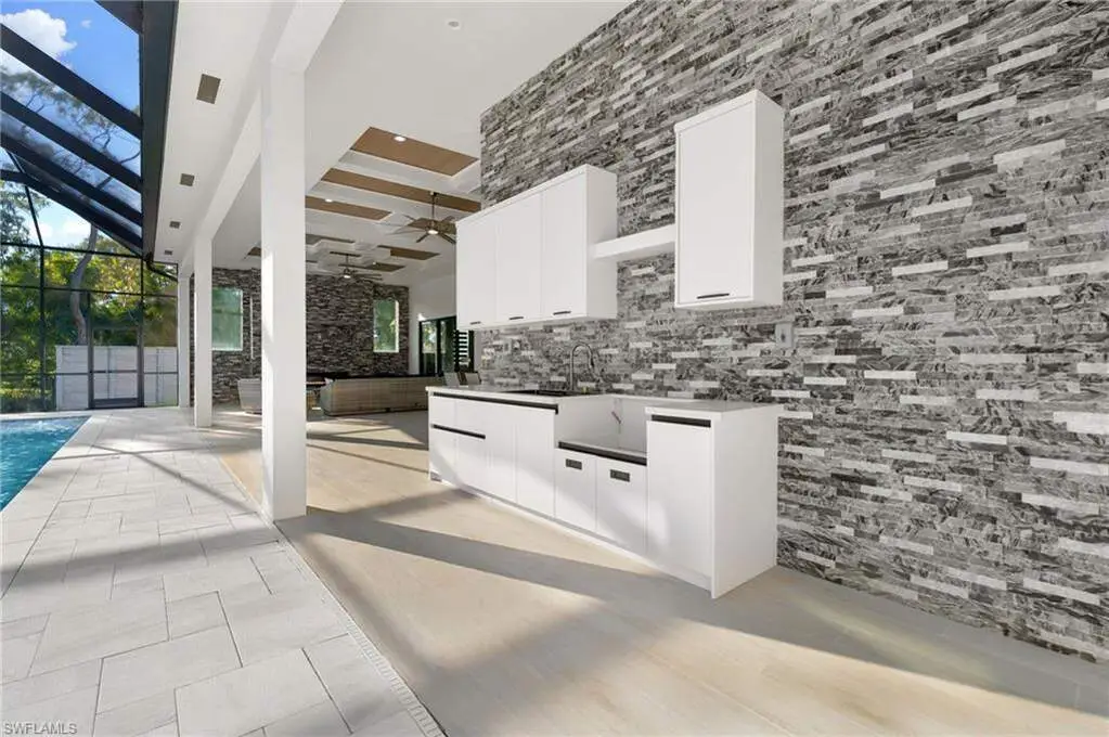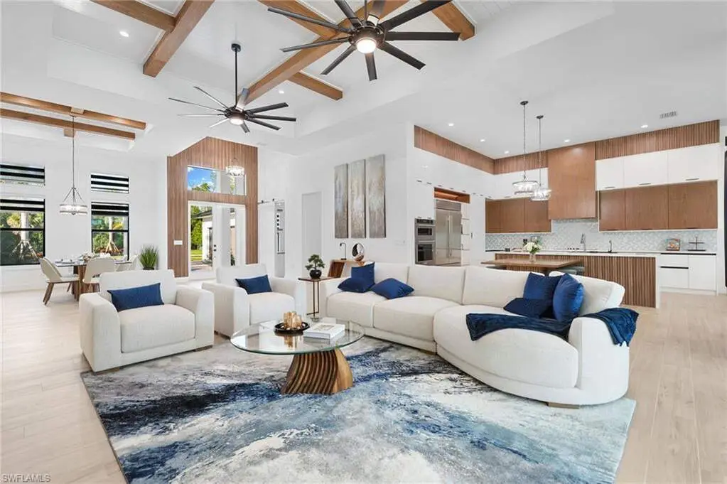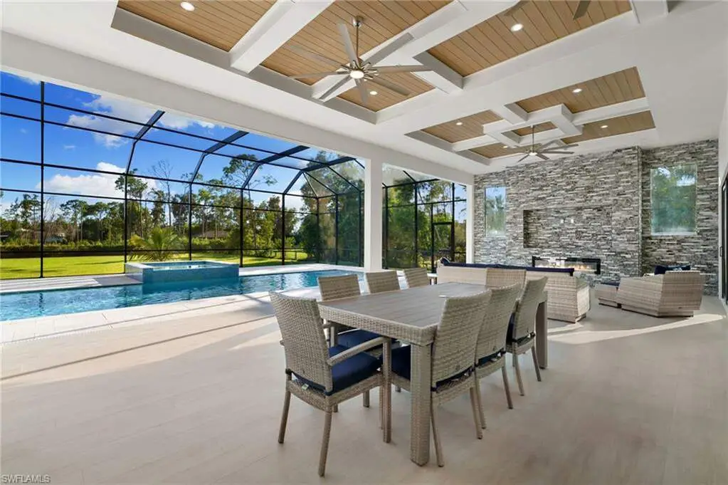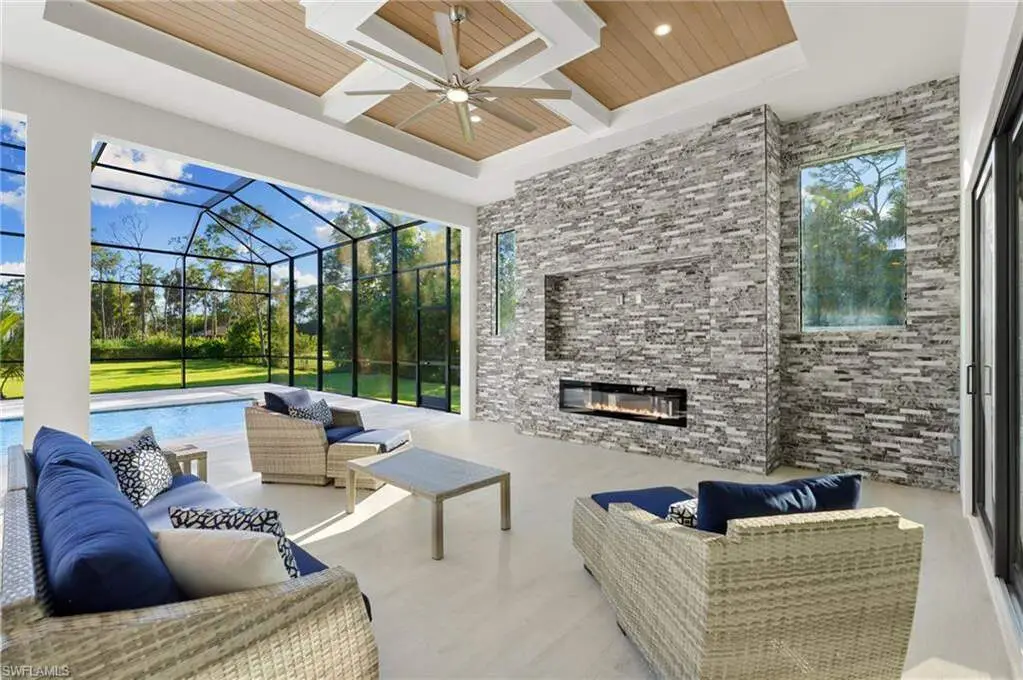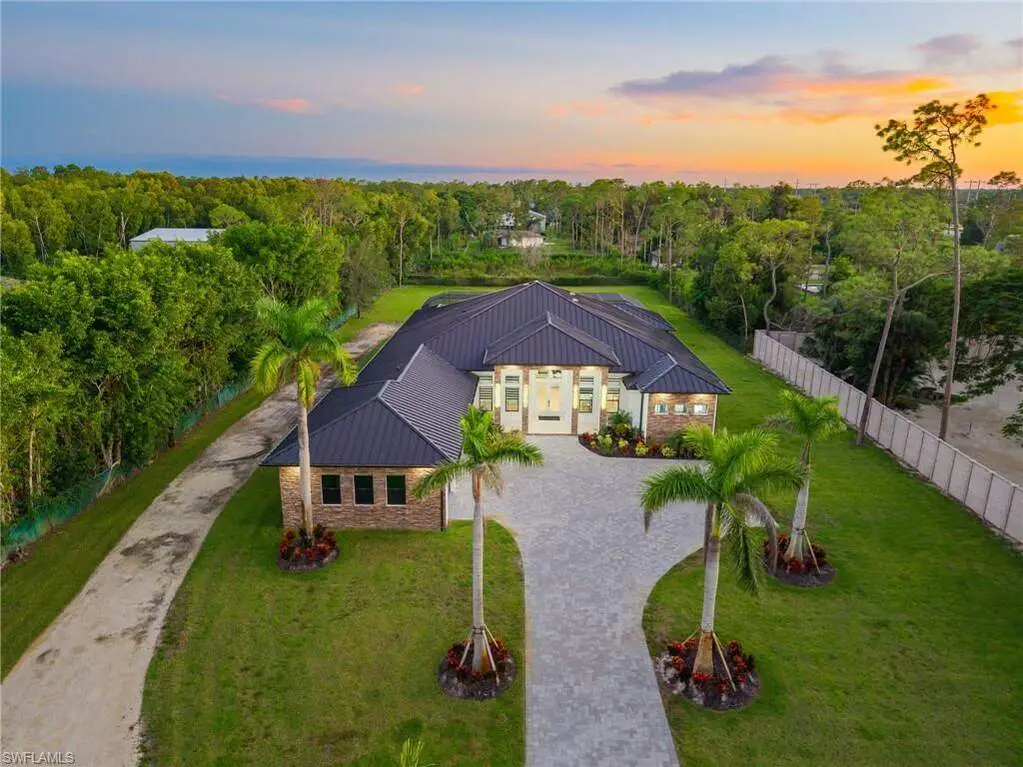 2025 LUXURY NEW CONSTRUCTION ESTATE ON 2.27 ACRES IN NAPLES' COVETED LIVINGSTON WOODS! A rare opportunity to enjoy the privacy of acreage with no HOA-offering endless possibilities to add additional amenities or living space! Enjoy peaceful, South-facing wooded views surrounded by natural beauty. This contemporary masterpiece features 4,960 sq ft under air, 5 bedrooms + separate den/flex room, 5.5 baths, a 3-car garage, hurricane-impact windows and doors, and a metal roof. Every detail was thoughtfully curated-from the wood-look tile flooring and soaring ceilings with rich custom wood beams to the modern chef's kitchen featuring quartz waterfall countertops, dual-toned white and walnut cabinetry, stunning wood paneling accents, high-end appliances, and a hidden butler's pantry. The formal dining area is ideal for entertaining, complete with two beverage coolers and custom built-in counters and shelving, while dual living areas each feature electric fireplaces. Step outside to your private outdoor oasis with an expansive entertainment deck, resort-style pool with tanning shelf and bubbler features, spa, summer kitchen, and covered lounge area with fireplace-perfect for gatherings or relaxed al fresco dining. The luxurious primary suite offers direct access to the pool deck and a spa-like bathroom adorned in marbled tile, complete with dual vanities, an oversized shower, and a freestanding soaking tub. Additional highlights include a private gated entry and electric vehicle charger. Livingston Woods is the perfect setting to enjoy peaceful acreage and convenience-located in an "A-rated" Collier County school district and minutes from Vanderbilt Beach, Waterside Shops, Mercato, and the world-class shopping and dining of 5th Ave and 3rd Street South.
