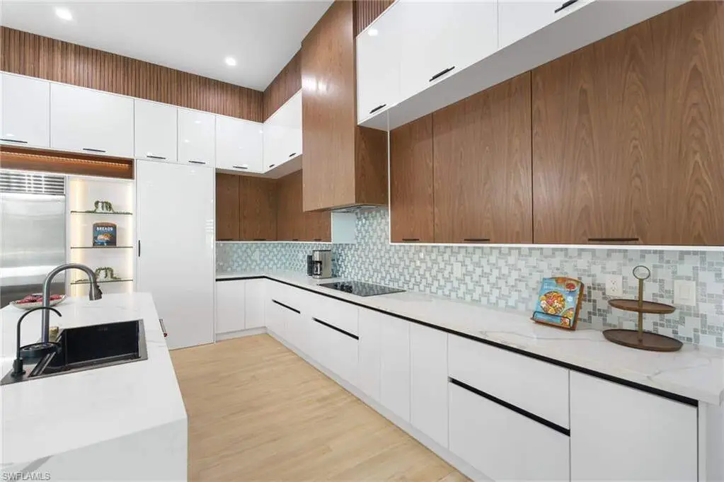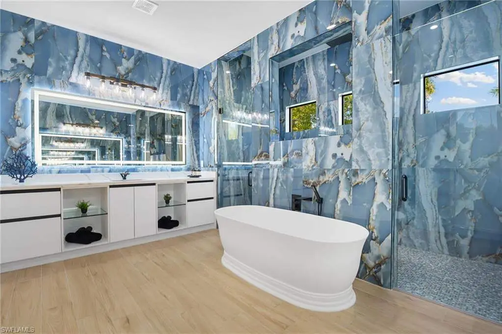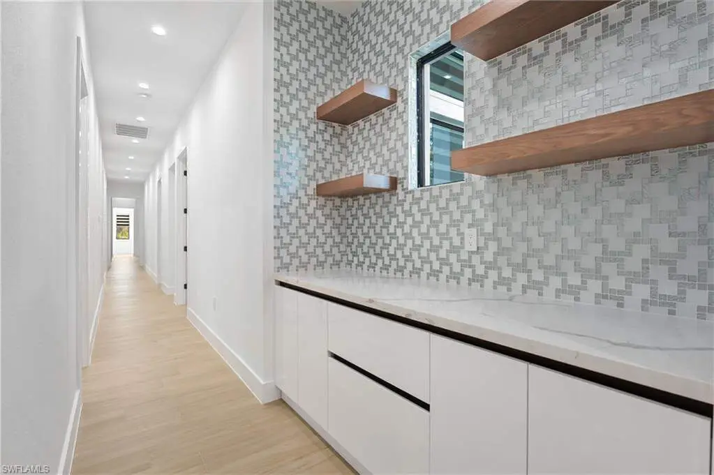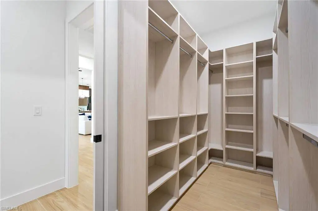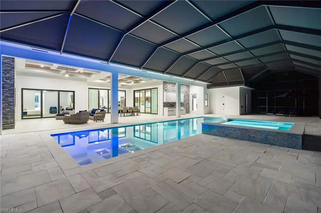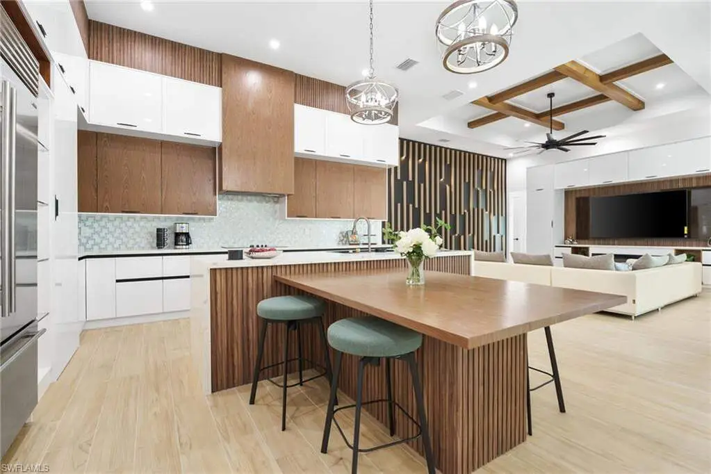 2025 LUXURY NEW CONSTRUCTION ESTATE ON 2.27 ACRES IN NAPLES' COVETED LIVINGSTON WOODS! A rare opportunity to enjoy the privacy of acreage with no HOA-offering endless possibilities to add additional amenities or living space! Enjoy peaceful, South-facing wooded views surrounded by natural beauty. This contemporary masterpiece features 4,960 sq ft under air, 5 bedrooms + separate den/flex room, 5.5 baths, a 3-car garage, hurricane-impact windows and doors, and a metal roof. Every detail was thoughtfully curated-from the wood-look tile flooring and soaring ceilings with rich custom wood beams to the modern chef's kitchen featuring quartz waterfall countertops, dual-toned white and walnut cabinetry, stunning wood paneling accents, high-end appliances, and a hidden butler's pantry. The formal dining area is ideal for entertaining, complete with two beverage coolers and custom built-in counters and shelving, while dual living areas each feature electric fireplaces. Step outside to your private outdoor oasis with an expansive entertainment deck, resort-style pool with tanning shelf and bubbler features, spa, summer kitchen, and covered lounge area with fireplace-perfect for gatherings or relaxed al fresco dining. The luxurious primary suite offers direct access to the pool deck and a spa-like bathroom adorned in marbled tile, complete with dual vanities, an oversized shower, and a freestanding soaking tub. Additional highlights include a private gated entry and electric vehicle charger. Livingston Woods is the perfect setting to enjoy peaceful acreage and convenience-located in an "A-rated" Collier County school district and minutes from Vanderbilt Beach, Waterside Shops, Mercato, and the world-class shopping and dining of 5th Ave and 3rd Street South.