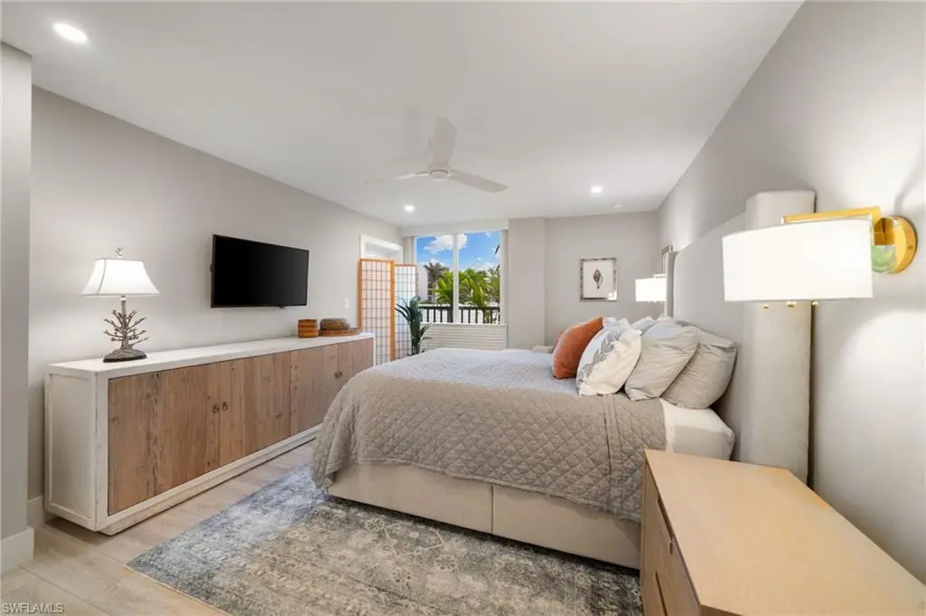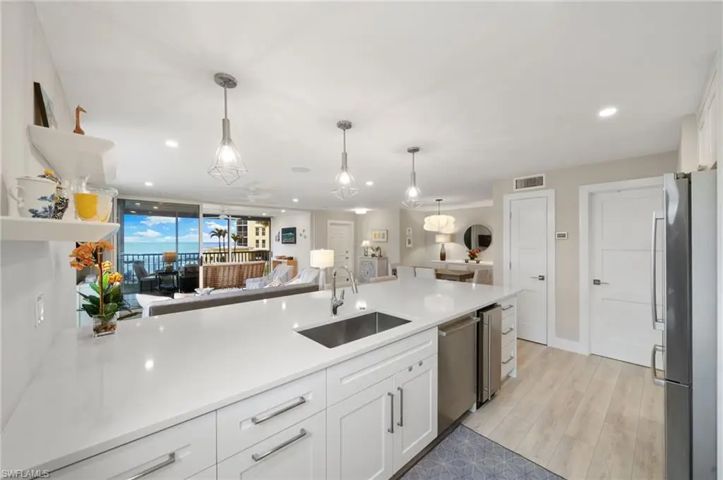 Experience unparalleled luxury in this meticulously renovated beachfront condominium which has been priced to sell! Welcome to a fully renovated residence in the heart of The Moorings, offering luxurious living with breathtaking Gulf of Mexico views. This 3-bedroom, 2-bathroom beachfront condominium spans 1,800 square feet and redefines coastal elegance with its thoughtful updates and open-concept design. Step inside to discover a bright and airy great room floor plan, perfect for entertaining or relaxing after a day on the beach. The sleek, modern kitchen is a chef's dream, featuring ample counter space, stainless steel appliances, a standalone ice maker, a wine chiller, and a water purification system. Beautifully updated lighting, floors, and custom cabinetry flow throughout, elevating the home's style and functionality. The primary suite is a private oasis, complete with a spacious walk-in closet, dual sinks with Kohler smart mirrors, a glass-enclosed shower, and a private water closet. Motorized Hunter Douglas shades in the bedrooms and great room offer both convenience and sophistication. One of the guest bedrooms has been transformed into a cozy den, perfect for work, hobbies, or unwinding with a good book. The screened lanai, accessible via sliding glass doors, invites you to soak in stunning western facing sunsets over the Gulf, all from the comfort of your own home. Practicality meets luxury with custom built-ins in the laundry room and a tankless water heater. An assigned under-building covered parking space is included and an exterior storage closet is ideal for stowing your essentials after a day by the sea. St. Croix Club is a low-density condominium association with only 36 residences, offering a serene and private atmosphere. Enjoy several community amenities, including a beachfront pool, grilling station, exercise room, and a common area with a full kitchen for gatherings. With miles of walkable beach and just a short stroll to The Village Shops on Venetian Bay, the location is unmatched. This move-in-ready beachfront retreat combines modern convenience with timeless coastal charm. Come experience the best of Naples living today!