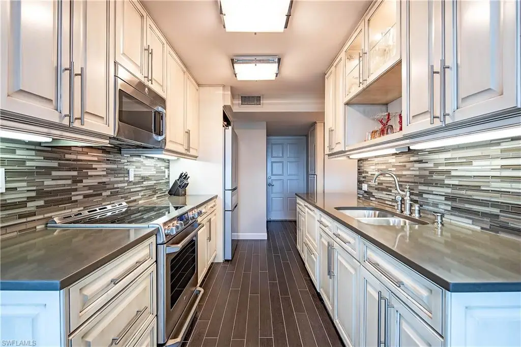 Experience beachfront luxury and sophistication in this meticulously updated sixth-floor residence at the prestigious Martinique Club, located in the coveted Moorings. Offering 1,440 square feet of thoughtfully designed living space, this 2-bedroom, 2-bathroom oasis boasts an open-concept layout perfect for entertaining, with seamless connections between the living, dining, and kitchen areas. From the expansive enclosed lanai, enjoy breathtaking panoramic views of Venetian Bay, while ample windows flood the space with natural light, enhancing the bright and airy ambiance. The primary suite serves as a tranquil retreat, featuring a walk-in closet and a spa-inspired shower. Recent renovations include new flooring, a modernized kitchen with state-of-the-art appliances, and exquisitely updated bathrooms. Additional features include electric shutters on the lanai, impact glass windows, extra storage, and a deeded parking space. Martinique Club offers an unparalleled lifestyle with only 35 residences, private beach access, a beachfront pool, a pool cabana room, and a newly renovated lobby. Located steps from Venetian Village's upscale boutiques and dining, and just a short drive to Waterside Shops, Artis-Naples, Mercato, and Naples' iconic 5th Avenue South and 3rd Street South, this home represents coastal elegance at its finest.