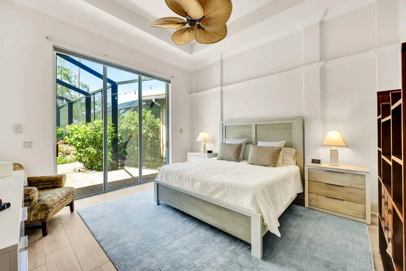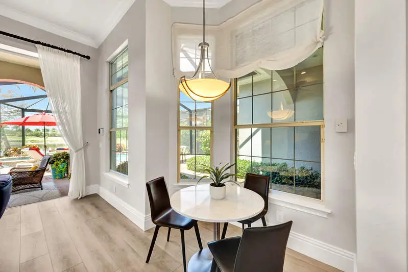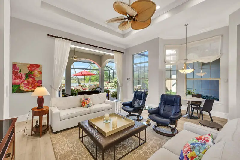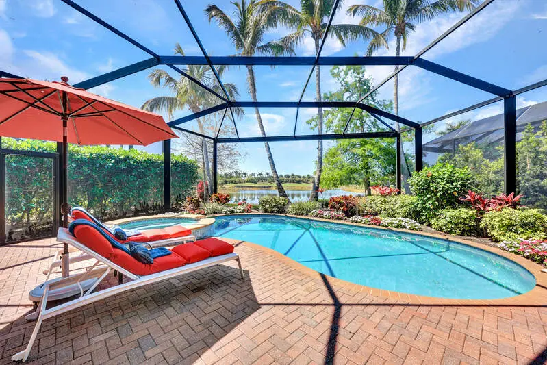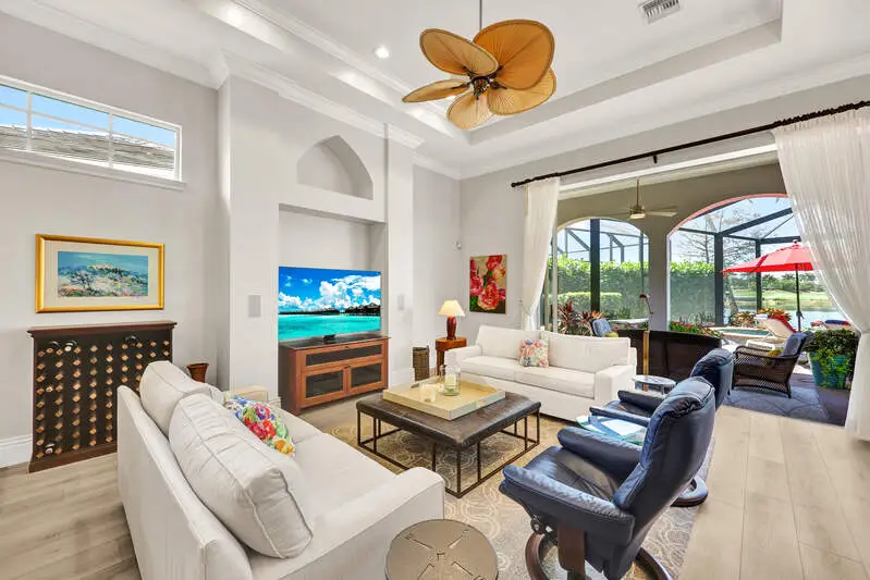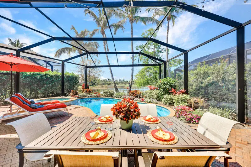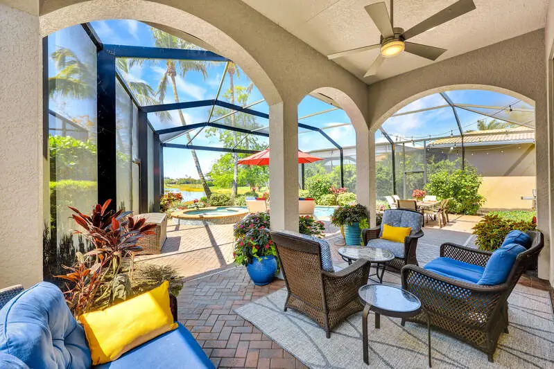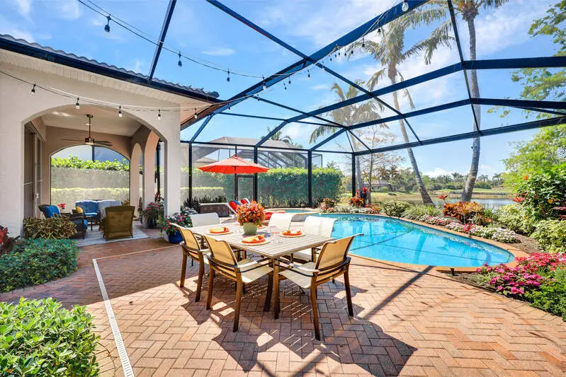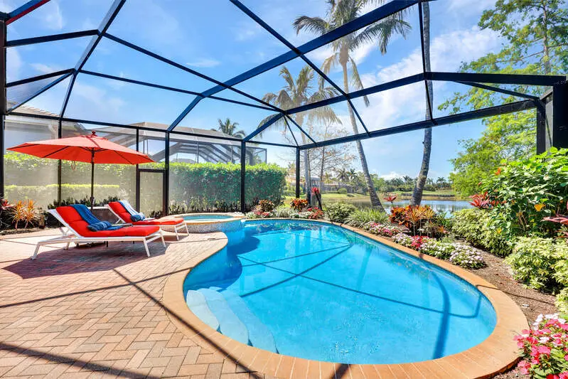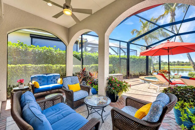 • Picture-frame lanai cage overlooking golf and water views