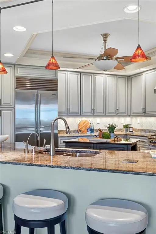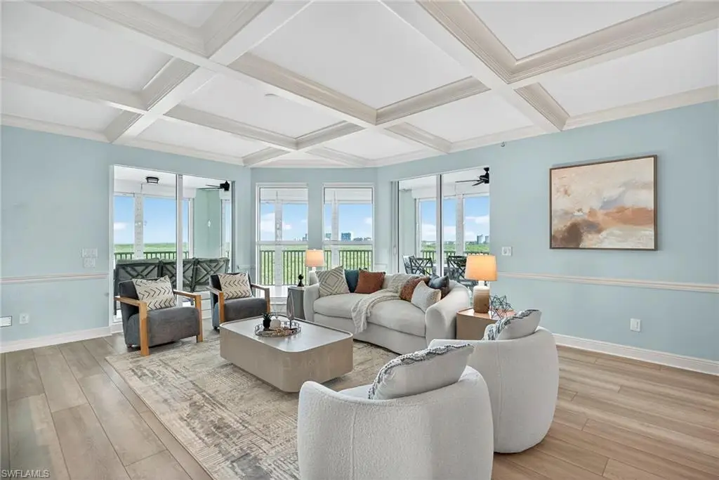 Step off the secured elevator into this highly sought-after center-stack residence and experience panoramic views of Turkey Bay and the Gulf of Mexico from your open-concept living area. This light and bright 3-bedroom, 3.5-bath home showcases oversized windows that maximize the views, sleek modern flooring, and coffered ceilings that add architectural sophistication. The living room features a stylish wet bar and custom built-in cabinetry, creating an ideal setting for entertaining. The chef's kitchen is open to the family room and includes a convenient pass-through to the dining area, where Gulf views provide a stunning backdrop. Elegant crown molding and thoughtful details throughout enhance the home's refined ambiance. The primary suite offers spectacular views of the Bay and Gulf, along with a luxurious bath featuring a double vanity, soaking tub, and separate shower. A second primary suite doubles as an office or den with access to a private lanai, perfect for work or relaxation. The third guest suite also enjoys its own private balcony, offering comfort and privacy for family and guests. The Grande Excelsior delivers resort-style living with a private pool and spa, fully equipped fitness room, outdoor gas grill, extra storage, and two under-building parking spaces. Residents also enjoy The Club at The Dunes, which features a waterfall pool with zero-entry access, a popular Tiki bar, casual and fine dining, a state-of-the-art fitness center with on-site trainers, and tennis and pickleball courts with full-time pros. The Dunes hosts social events throughout the year, fostering a vibrant sense of community. This residence includes the highly coveted Floridian Club membership (available with a $50,000 + tax transfer fee), granting private beach access on Vanderbilt Beach with pool, restaurant, indoor/outdoor seating, beachside services, and a private shuttle from your lobby to the sand. Ideally located near high-end shopping, fine dining, and RSW International Airport, The Dunes offers a rare pet-friendly lifestyle with the perfect blend of luxury, leisure, and convenience. Discover resort-style living at its finest; schedule your private showing today. ________________________________________
