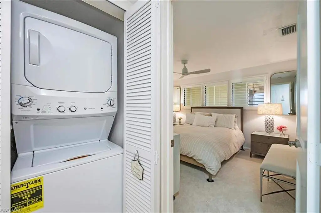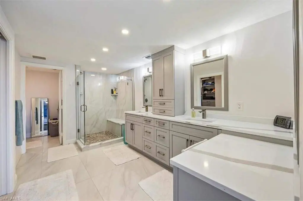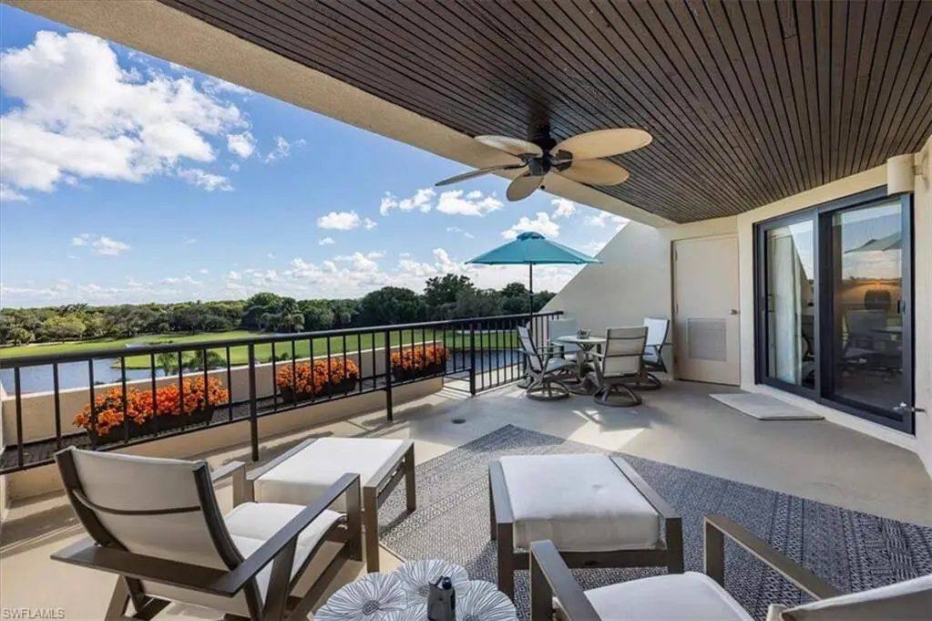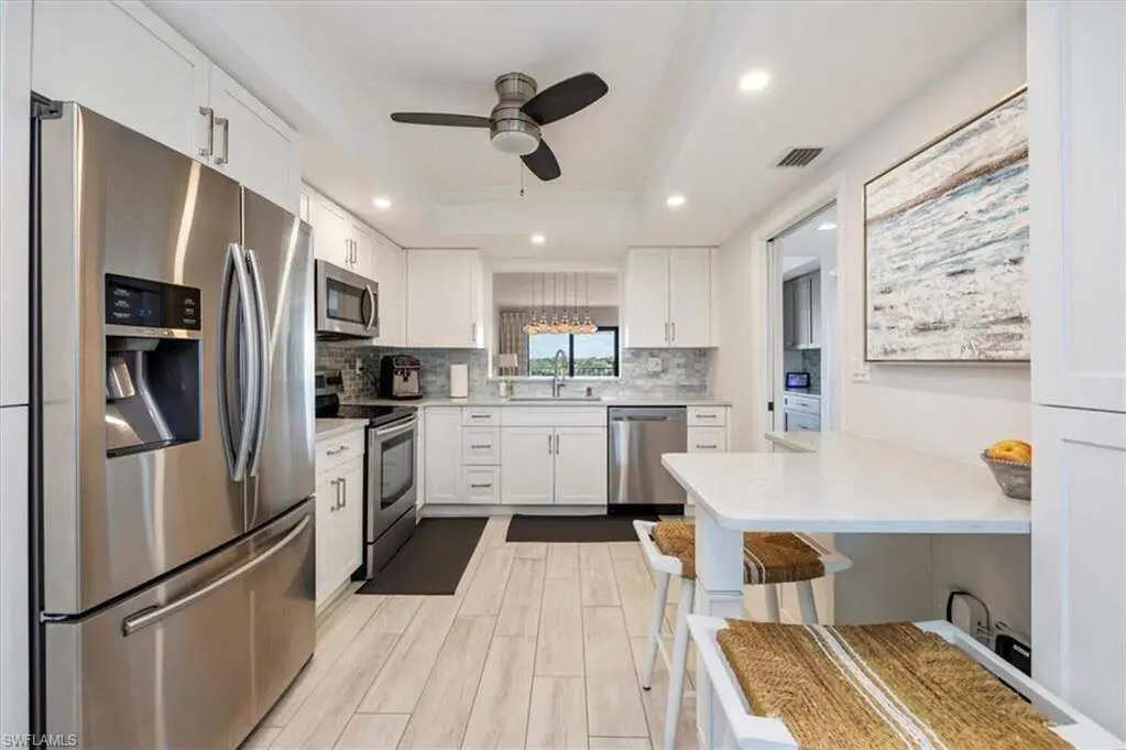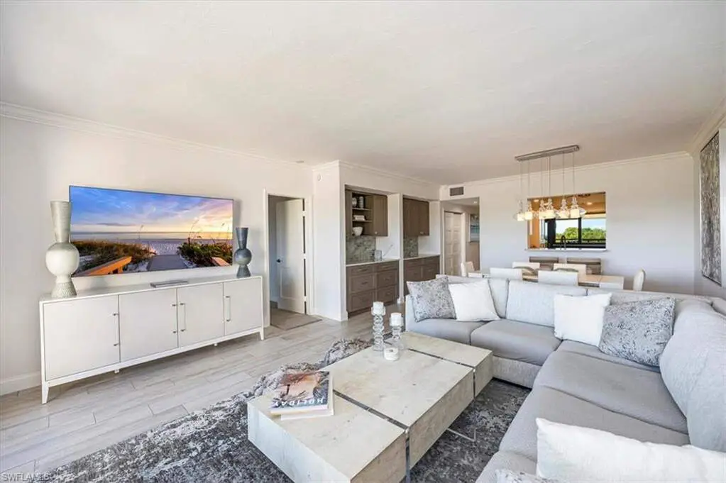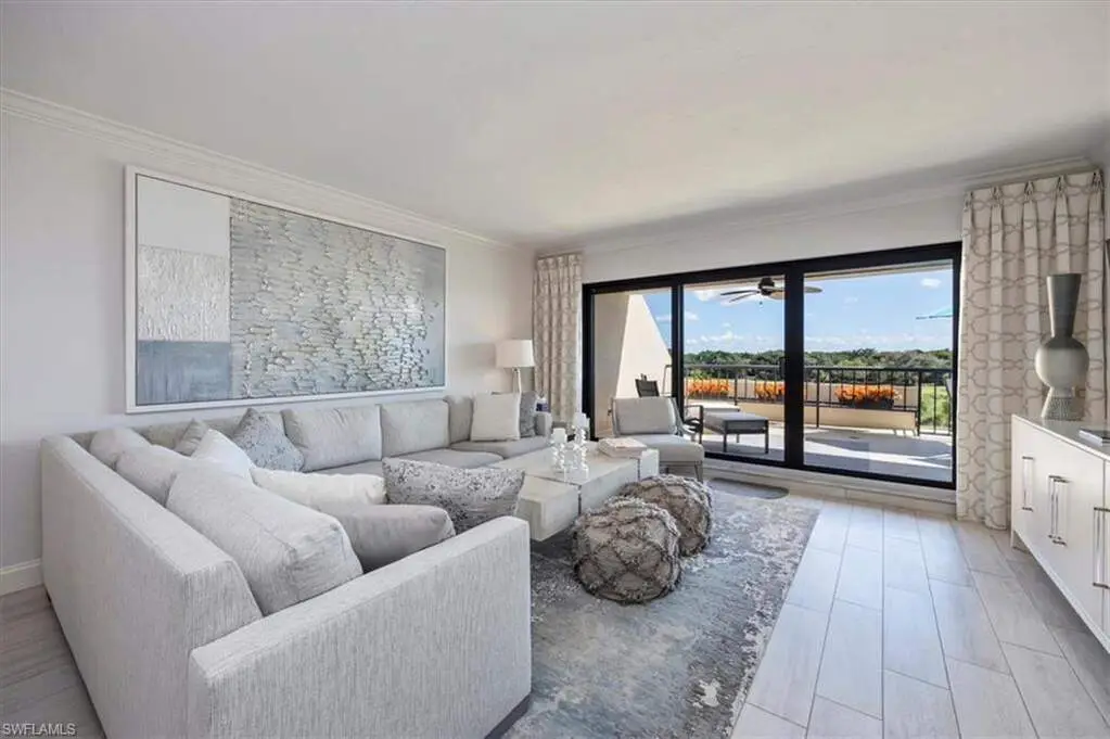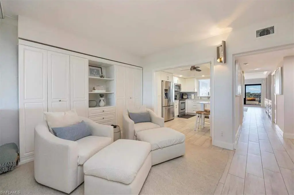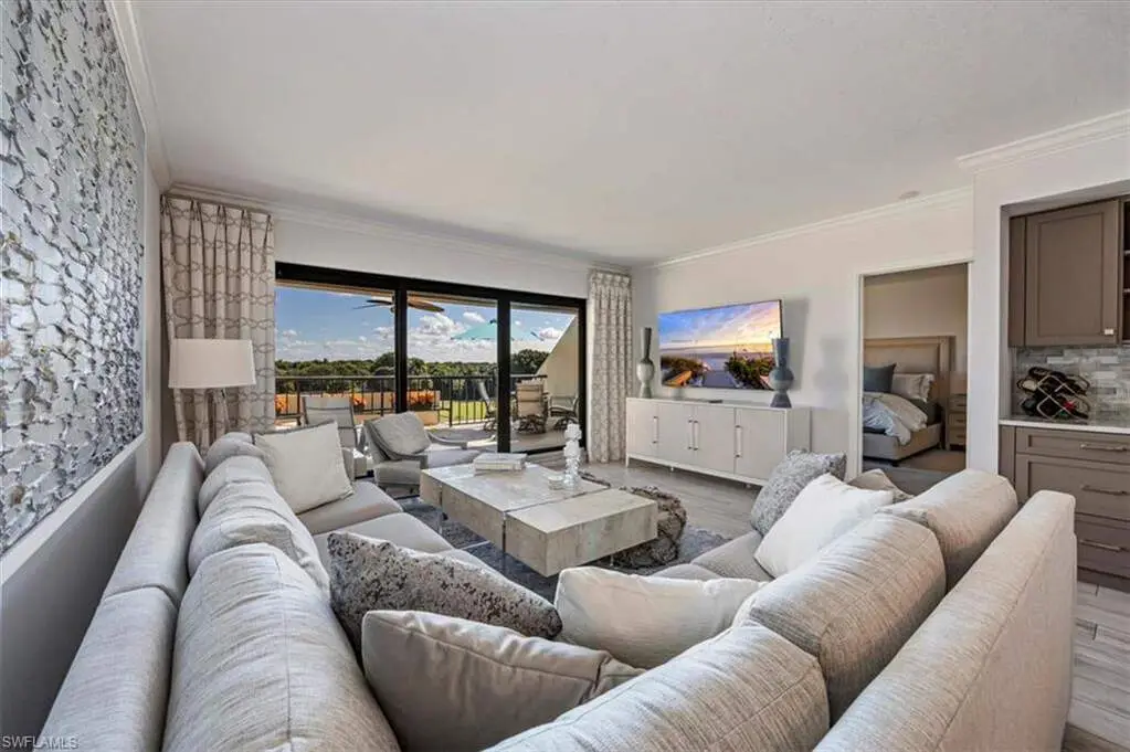 4th-Floor Condo with Golf and Gulf Views in Pelican Bay! Enjoy both sunrise and sunset views from this fully renovated 4th-floor residence in Hyde Park. Located just across from the beach tram and South tennis courts, this unit offers direct access to the best of Pelican Bay living. Interior features include Italian porcelain wood-look tile flooring, white shaker cabinets, quartz countertops, glass tile backsplashes, and new stainless steel appliances. A versatile flex space with built-in shelving includes twin Murphy beds, ideal for guests or a home office. Two balconies provide panoramic views, one east-facing over the golf course and manicured grounds, the other west-facing toward the Gulf for sunset skies. Residents enjoy access to Pelican Bay's private beaches with chair service, beachfront dining, tennis, pickleball, fitness center, and miles of trails. Conveniently located between Waterside Shops/Artis-Naples and Mercato. Move-in ready. Ideal location. Full amenities.