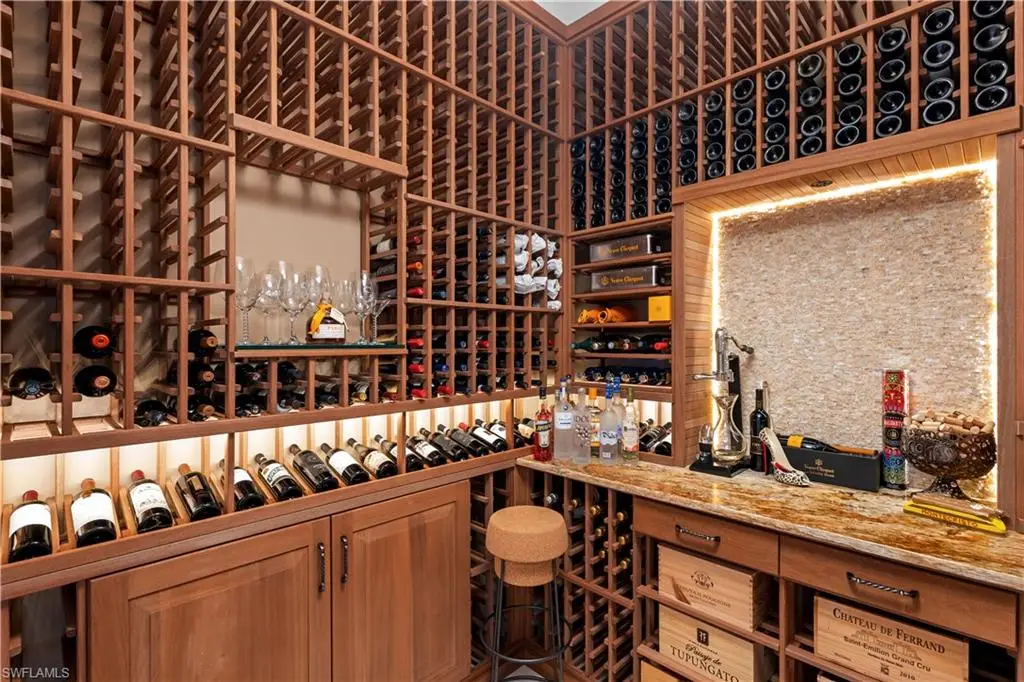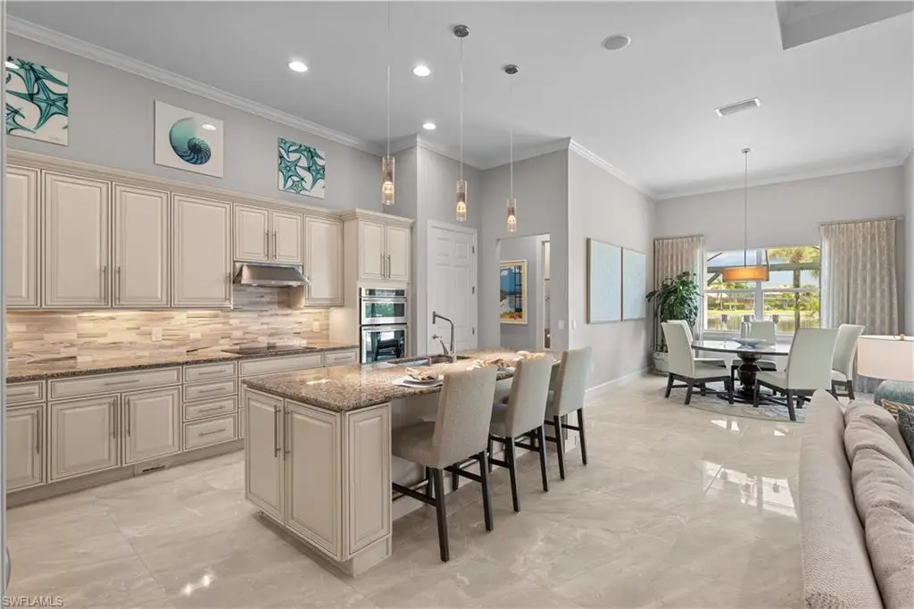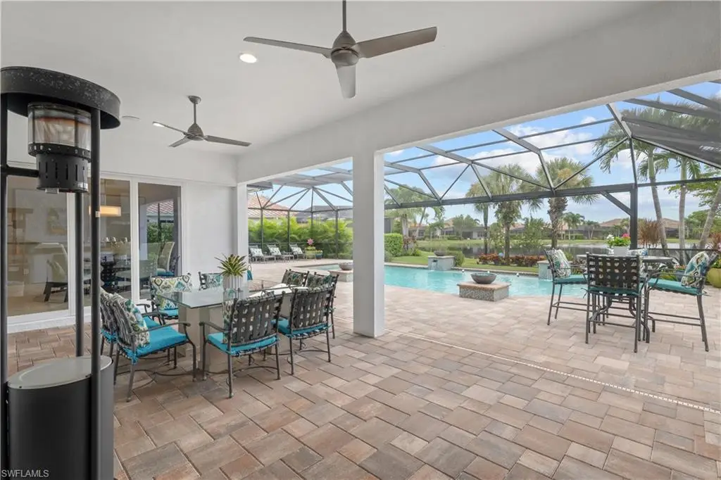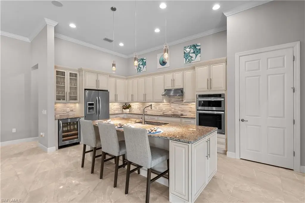 Welcome to this stunning, light-filled and ever so popular "Windsor" floorplan home, featuring 4 bedrooms plus den, 3 full baths, and a spacious 3-car garage. Nestled on an oversized, pie shaped lot with an extra long driveway, this home offers a wide-open Great Room layout that’s perfect for entertaining and everyday living. As you step inside, you’ll be greeted by a bright and airy atmosphere, highlighted by zero-corner pocketing sliding glass doors to the lanai that seamlessly connect the indoor and outdoor living spaces. The sliding doors lead to the expansive lanai, where you'll find an outdoor kitchen and an oversized electric and solar heated salt water pool with picture window screen cage overlooking the lake – your personal oasis. The chef’s kitchen is a dream, complete with raised panel cabinetry, KitchenAid appliances including wall oven, convection microwave, and beverage cooler. The large eat-in kitchen area offers the perfect spot to gather and enjoy meals with family and friends. Retreat to the luxurious primary suite, which boasts a tray ceiling, a spacious bath featuring a soaking tub & walk in shower, and two spacious walk-in closets with built-in cabinetry. For those wine enthusiasts, the custom climate controlled walk in wine room will be the envy of your family and friends. Storm ready with HURRICANE IMPACT WINDOWS/DOORS! Enjoy boating, golf, tennis, pickleball, bocce, a tiki bar, restaurant, poolside food and drink service, a fitness center, and social activities. The recently renovated $18M Lake Lodge & Beach Club offers over 500 acres of navigable lakes, boat slips available for lease, and a private 18-hole golf course (full golf memberships available/optional). In addition, The Quarry Golf Club offers a variety of membership opportunities. Designed in 2007 by the world-renowned architectural team of Dr. Michael Hurdzan and Dana Fry, this Par 72 championship course delivers a truly exceptional golf experience framed by breathtaking views. Water comes into play on every hole, creating both beauty and challenge, while the thoughtful design ensures an engaging round for golfers of all skill levels. With five sets of tees and a distinctive layout from hole to hole, this course offers endless variety—inviting you to enjoy the challenge again and again.Don’t miss the chance to experience a lifestyle like no other in The Quarry – schedule your private showing today!