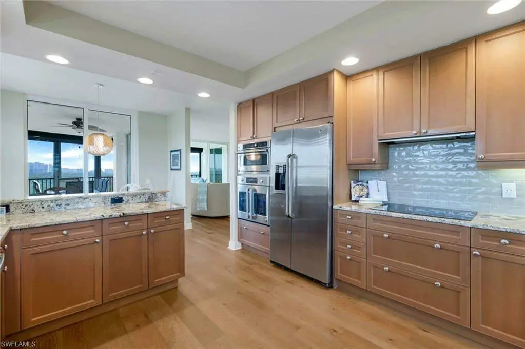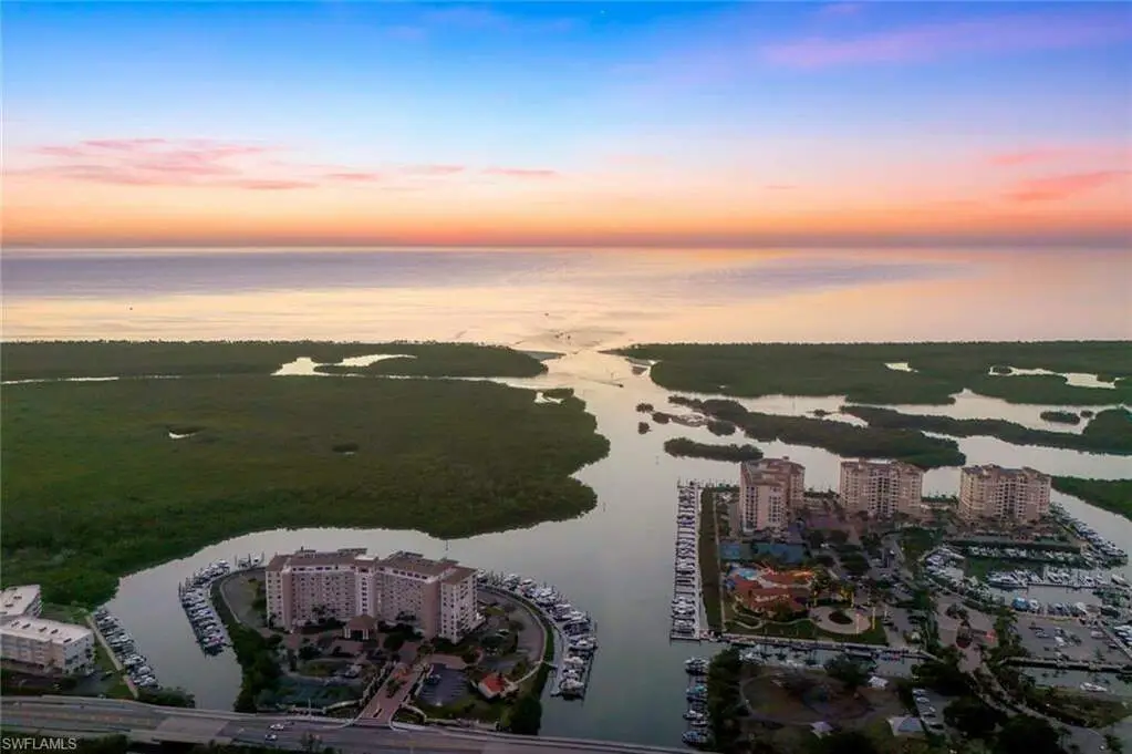 Introducing a sanctuary of luxury living in this prestigious Cove Towers condominium overlooking Turkey Bay with sunset views looking out to the Gulf of Mexico. Located in the highly coveted 01 corner stack where only 3 other end units have been sold over the last 10 years. This gorgeous property epitomizes the pinnacle of elegance and sophistication with private elevator entry opening to your grand salon with wrap around balcony and includes 3 bedrooms and 3.5 baths. Cove Towers is a gated enclave within a gated community, and residents will revel in the exclusivity of the private Calypso Club. Boasting a heated lap pool, a cabana adorned with a fireplace & grills, media/entertainment room, a fitness room, onsite management, and guest suites. This haven offers an active resort lifestyle all located just steps from the residence. The meticulously designed kitchen will be a cook's dream and features top-of-the-line Cafe appliances including an Advantium that offers convection, microwave and halogen cooking, professional French door wall oven, induction cooktop, GE Monogram wine chiller & recently updated granite countertops with breakfast bar all set against the backdrop of newly updated wide plank engineered wood flooring. You'll appreciate attractive and updated lighting throughout the home as well as elegant plantation shutters that offer a coastal modern feel. The master suite offers balcony access and features a serene view of the gulf in addition to an in-suite bath with soaking tub & shower as well as 2 walk in closets. Guests can enjoy both spacious guest bedrooms with in-suite baths and shared balcony with views of the newly developed Kinsale Golf Club. Residents have the option to join Tarpon Cove Yacht & Tennis Club which is located within the community and offers tennis, dining, clubhouse, resort style pool and boat taxi to Naples gorgeous white sand beaches. Embracing captivating views of Turkey Bay and the Gulf of Mexico, this home is the epitome of luxury living.