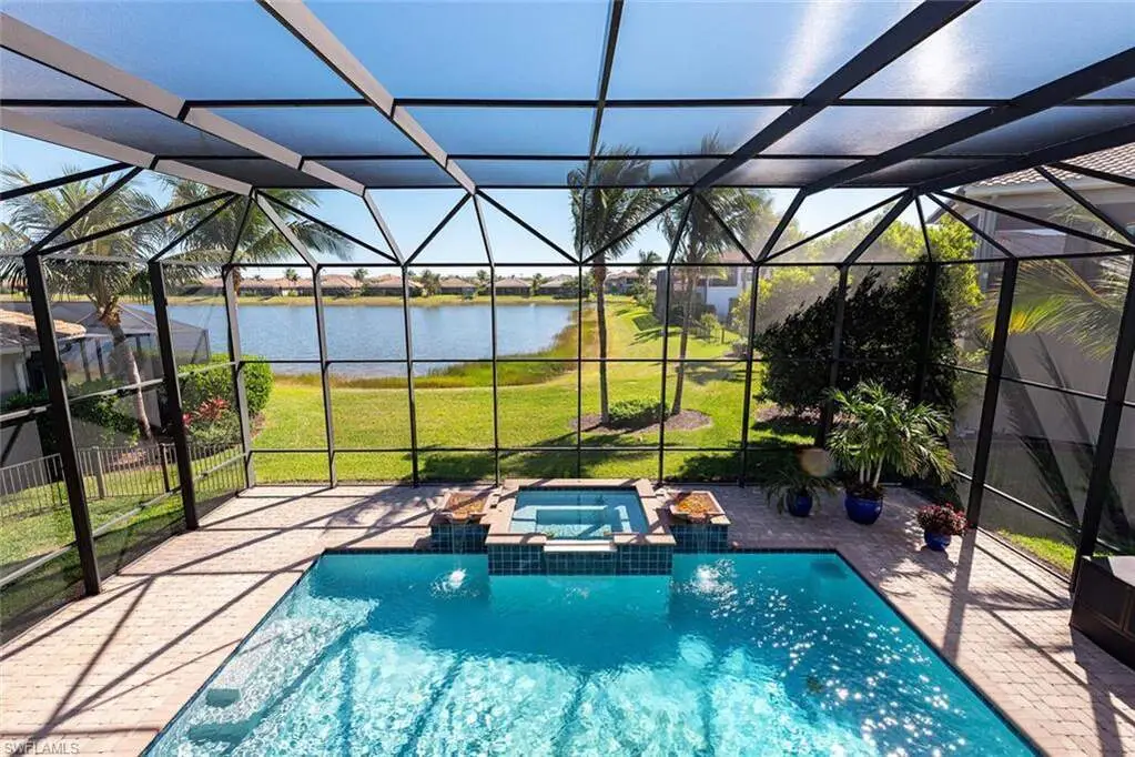 Substantial Price Adjustment=Tremendous Value! Rarely does a home of this caliber become available at such a reduced price. Welcome to this stunning estate home in the highly sought-after Riverstone community in Naples, FL. This Venetian floor plan home is perfect for families seeking both luxury living and a vacation-inspired lifestyle. Offering 6 spacious bedrooms, 5 baths, and a versatile loft, this home provides 4,503 SF of living space. Situated on an oversized .39-acre lot with beautifully landscaped grounds, the property also boasts a serene lake view, creating a peaceful retreat. Step outside to your own private oasis as the entire outdoor space is designed to enhance your vacation-style living. The expansive two-story screened lanai features a sparkling pool with fountain bowls and a relaxing spa. The outdoor kitchen makes it easy to host barbecues and gatherings, while the fenced yard offers plenty of space for kids to play or dogs to run. Inside, the gourmet kitchen is a chef's dream, equipped with an extended walk-in pantry, new accent lighting, a wall oven, an electric GE cooktop with vented hood, both quartz & granite counters & upgraded cream-colored cabinets. The kitchen is located in the heart of the home and flows seamlessly into the family room, formal living & dining areas. Downstairs you will also find a bedroom with a Murphy bed, which makes for fantastic office space or guest room. Upstairs, the primary suite offers a spacious retreat, complete with dual walk-in closets and an ensuite bath featuring a newer frameless glass shower door and a soaking tub. The upstairs also features a balcony that offers multiple access points, providing an ideal place to relax, enjoy the serene lake view, and experience Florida's beautiful sunrises. Fine finishes include plantation shutters, an upgraded wood/iron staircase, hardwood floors upstairs, decorator lighting & fans and crown molding. For added convenience and comfort, this home features a finished laundry room with upgraded LG washer & dryer, a sink, folding counter, and cabinetry. The home is freshly painted on the exterior & has new exterior lighting. Two newer A/C units ensure comfort year-round. A whole home generator with 500-gallon propane tank plus impact windows and doors provide convenience & peace of mind during and after a storm. Riverstone offers a social, vacation-inspired lifestyle for all ages. Located in North Naples, minutes to I-75 & zoned for "A" rated schools. Recreation area includes a fitness center, social hall, resort style pool, lap pool, spa, 5 lighted tennis courts, outdoor basketball/pickleball, full indoor basketball court, tot lot, children's water play area & game room & an activities coordinator so it is easy to make new friends. If you're looking for a home that combines comfortable living with a vacation lifestyle, look no further. This stunning property in Riverstone is the perfect place to create lasting memories with your loved ones!