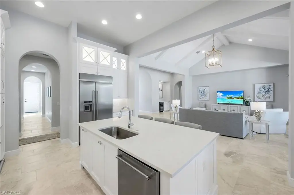 Refined Luxury Living in Fiddler's Creek. Experience sophisticated resort-style living in this beautifully curated residence located in the prestigious community of Fiddler's Creek. Perfectly positioned to capture wide golf course vistas, this home blends modern design with timeless elegance, surrounded by professional landscaping and enhanced by ambient evening lighting. Step through elegant French doors into a light-filled interior highlighted by 14-foot ceilings, a graceful foyer, and striking designer flooring. The spacious great room seamlessly extends outdoors through 10-foot impact glass sliders, revealing a spectacular lanai complete with a resort-style pool and spa, sun shelf, bubblers, and an impressive summer kitchen-perfect for entertaining or quiet relaxation. A wood-accented ceiling adds warmth and architectural character to this inviting outdoor retreat. The gourmet kitchen is both stunning and functional, showcasing an expansive white quartz island, KitchenAid appliances, and custom cabinetry with glass-front uppers and pullout shelving. A bespoke range hood, refined lighting, and plantation shutters throughout the home contribute to a sense of understated luxury. The primary suite is a serene sanctuary featuring a comfortable sitting area, an exceptionally large walk-in closet, and a spa-inspired bath with exquisite finishes. Three additional en suite bedrooms, each with generous closets, offer comfort and continuity of style. A chic powder room off the entry hallway and a spacious laundry room complete the interior. A three-car side-load garage, extended driveway, and enhanced architectural elevation lend curb appeal and convenience. Residents of Fiddler's Creek enjoy award-winning amenities, including a newly renovated lagoon-style pool, spa, fitness center, and an active social lifestyle with pickleball, tennis, and casual or fine dining options. Memberships are available for golf, beach, and boating, while the location offers easy access to Old Naples and Marco Island for world-class shopping, dining, and recreation. This exceptional home captures the essence of refined coastal living-luxurious, inviting, and perfectly designed for today's lifestyle.