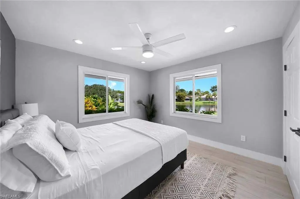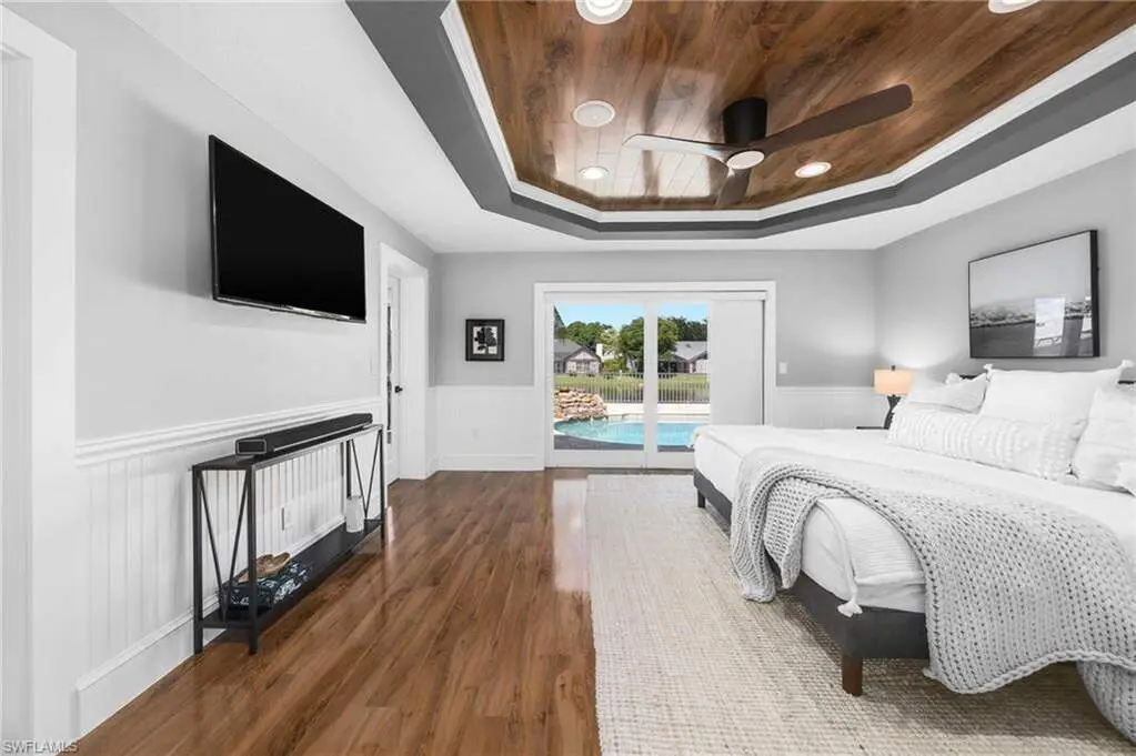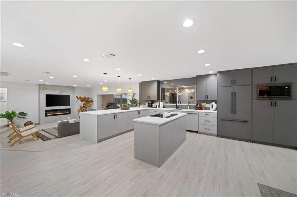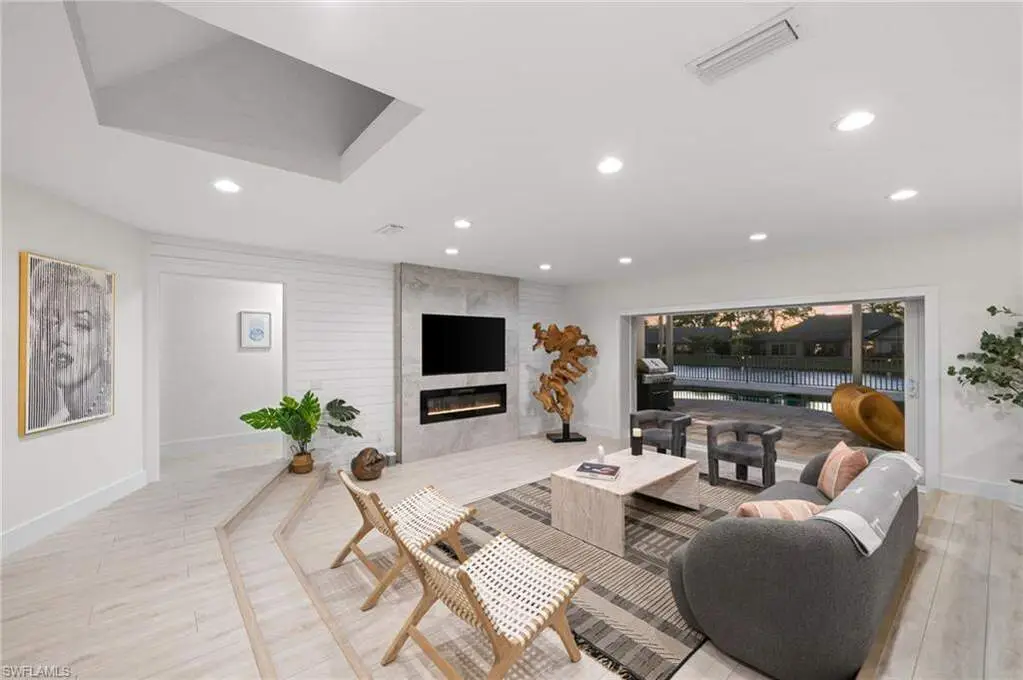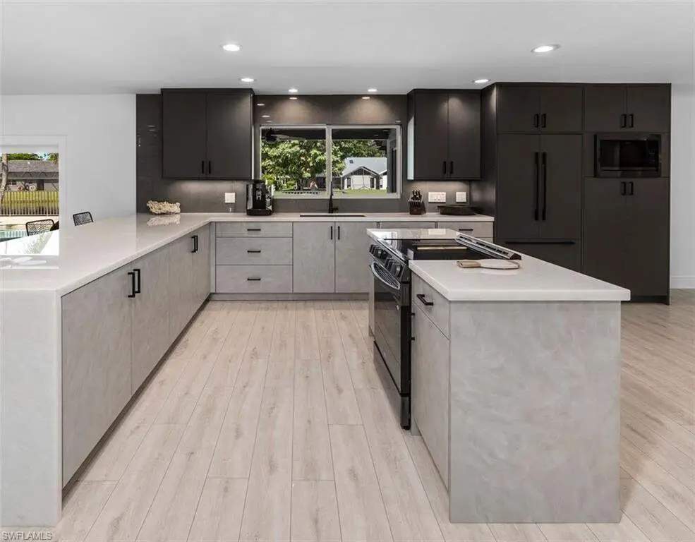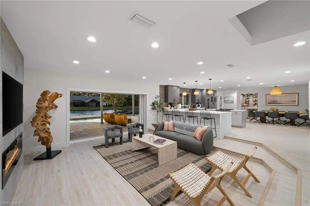 The jewel of Pinewoods! Discover this completely remodeled home on one of the most sought-after lots in Pinewoods. Nestled on an oversized pie-shaped lot with expansive lake frontage, this property offers beautiful views and tranquil outdoor living. Step inside to find a home designed with top-of-the-line finishes and a sophisticated, contemporary flair. The heart of the home is the modern kitchen, featuring a sleek marble waterfall peninsula, stainless steel appliances, a wine cooler, and a thoughtfully designed dining area perfect for family gatherings or entertaining. The inviting floor plan seamlessly blends indoor and outdoor living. Host effortlessly with easy access to the resort-style pool and spacious lanai, where you can relax and soak in the wide lake views. Pinewoods is a coveted low-fee community in a prime location. You'll enjoy quick access to downtown Naples, Mercato, world-famous beaches, and top-rated schools, along with an array of shopping and dining options.