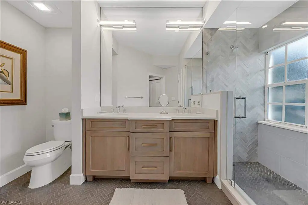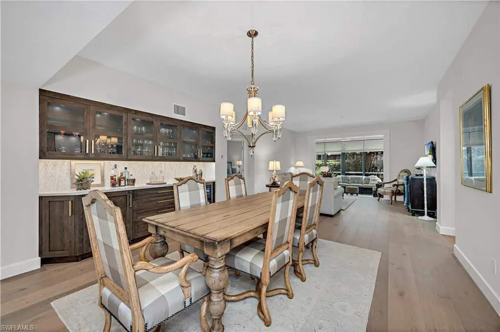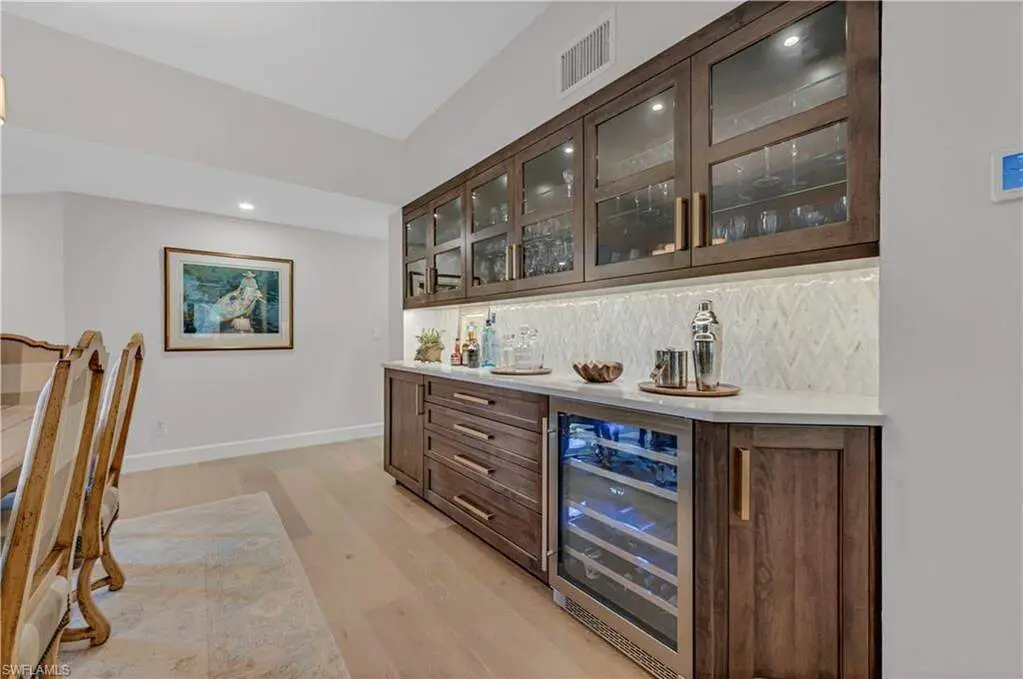 Not to be missed San Marino Condo in Pelican Bay! Fabulous renovation with top of the line features. Current owners did an extensive renovation and used quality material throughout. Gorgeous wide plank white oak flooring in main living and kitchen. Open Kitchen with custom wood cabinets, quartz counter tops, marble backsplash, Sub*Zero Refrigerator, Wolf Induction cooktop. Pantry wall of cabinets. Extensive built in bar with wine fridge in dining area. Renovated primary and guest bathrooms with custom cabinets and beautiful tile selections. Tasteful furnishings, custom window treatments. New cabinets in laundry room. Quality and care throughout. San Marino offers residents it's own pool, spa, grills, fitness room and social space. It is a also Pet Friendly community allowing 2 pets under 45 pounds OR 1 under 70 pounds. San Marino is conveniently located just across the street from the private Pelican Bay tram stop for quick and easy beach access. Residents of Pelican Bay, enjoy exclusive access to all its premier amenities, including 2 private beachfront restaurants and bars, attended beach service, kayaks, paddle boards, 18 Har-Tru tennis courts, an advanced fitness center, pickleball coming soon, and scenic nature trails for walking and biking. Perfectly situated near Artis Naples, Waterside Shops, and Mercato.
