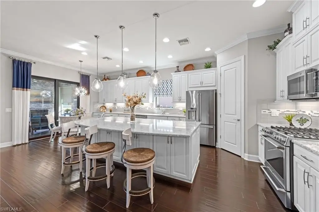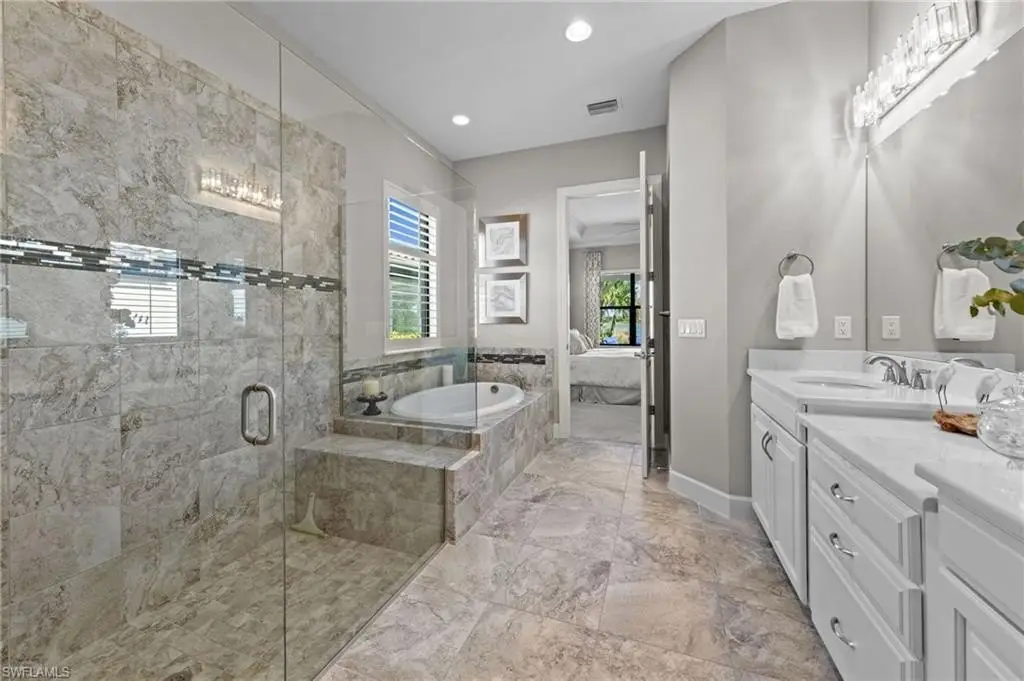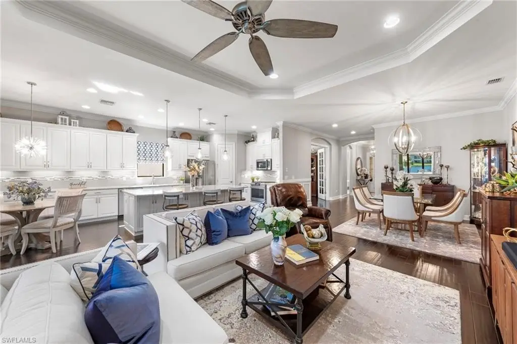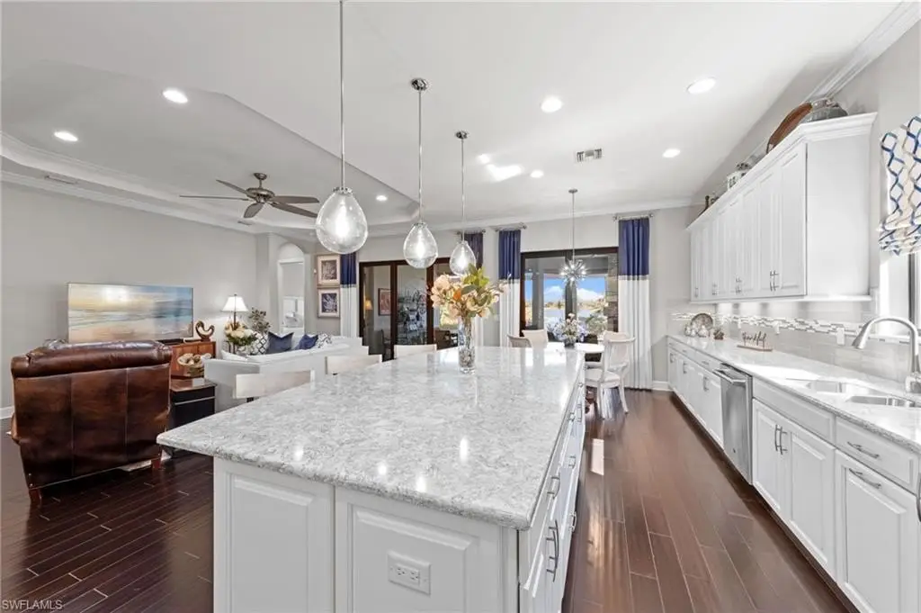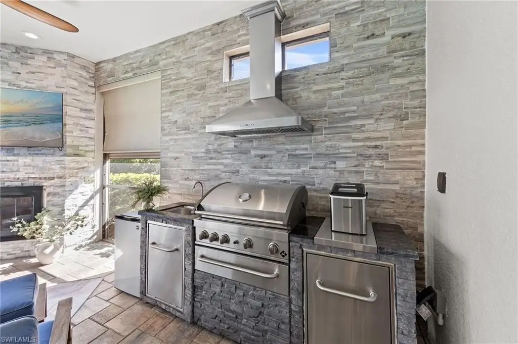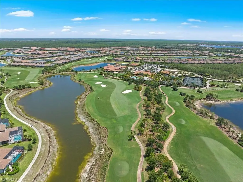 LIVE THE GOOD LIFE AT ESPLANADE GOLF AND COUNTRY CLUB! GOLF MEMBERSHIP INCLUDED!!! Experience resort-style living in one of Naples most sought-after Golf and Country Club communities. This stunning Lazio-style home offers SERENE LONG LAKE AND GOLF COURSE VIEWS with exceptional privacy, creating the perfect setting for relaxed luxury. A beautifully landscaped entry welcomes you inside to a bright, open-concept floor plan featuring a spacious great room and dining area seamlessly connected to an extended, gourmet kitchen. Enjoy white cabinetry, quartz countertops, stainless steel appliances, a natural gas cooktop, and a charming breakfast nook—ideal for everyday living or entertaining. Custom window treatments and warm wood flooring throughout the main living area complete the home’s look of comfortable sophistication. The primary suite offers a private retreat with a spa-inspired bathroom featuring dual vanities, a walk-in shower, soaking tub, and a generous walk-in closet. Two guest suites, each with its own private bath, ensure comfort and privacy for overnight visitors, while the den provides flexible space for a home office or sitting room. Step through two sets of sliding glass doors to the outdoor living area with picture window screening, designed to maximize lake and golf views . El fresco entertaining is effortless with with a well equipped outdoor kitchen, and relaxing on cool nights is comforting by the gas fireplace with stone surround. The heated pool beckons you for an afternoon swim. This cozy outdoor living area offers the perfect venue for morning coffee, afternoon swims, or evening gatherings. Additional features include: Hurricane shutters and screens for extra protection of covered lanai area and year-round comfort, IMPACT WINDOWS AND DOORS THROUGHOUT for peace of mind, and additional 2025 improvements including a professionally epoxied garage floor, new pool filter, new microwave, new garbage disposal, and extensive landscaping. At Esplanade Golf & Country Club, every day feels like a vacation. Enjoy world-class amenities including a resort-style pool with cabanas and the adjoining Bahama Bar for casual food and beverage, tennis, pickleball, and bocce. The popular Wellness center offers a state of the art fitness center with exercise classes and the luxurious Koquina Day Spa. The amenity center is a popular place for card games and other social gatherings and the dog park offers an opportunity for our fur babies to socialize. Enjoy the 14 miles of walking and biking trails. The 18-hole private golf course is the crown jewel of the community and 15,000 sq. ft. clubhouse offers indoor and outdoor dining, a full bar, wine tasting room, wine lockers, and a cozy café. In addition to golf, all club amenities, landscaping, and irrigation, are included in dues of $3,412 per quarter! Located in Flood Zone X, NO FLOOD INSURANCE REQUIRED! Best of all, this beautiful home is offered TURNKEY FURNISHED!!